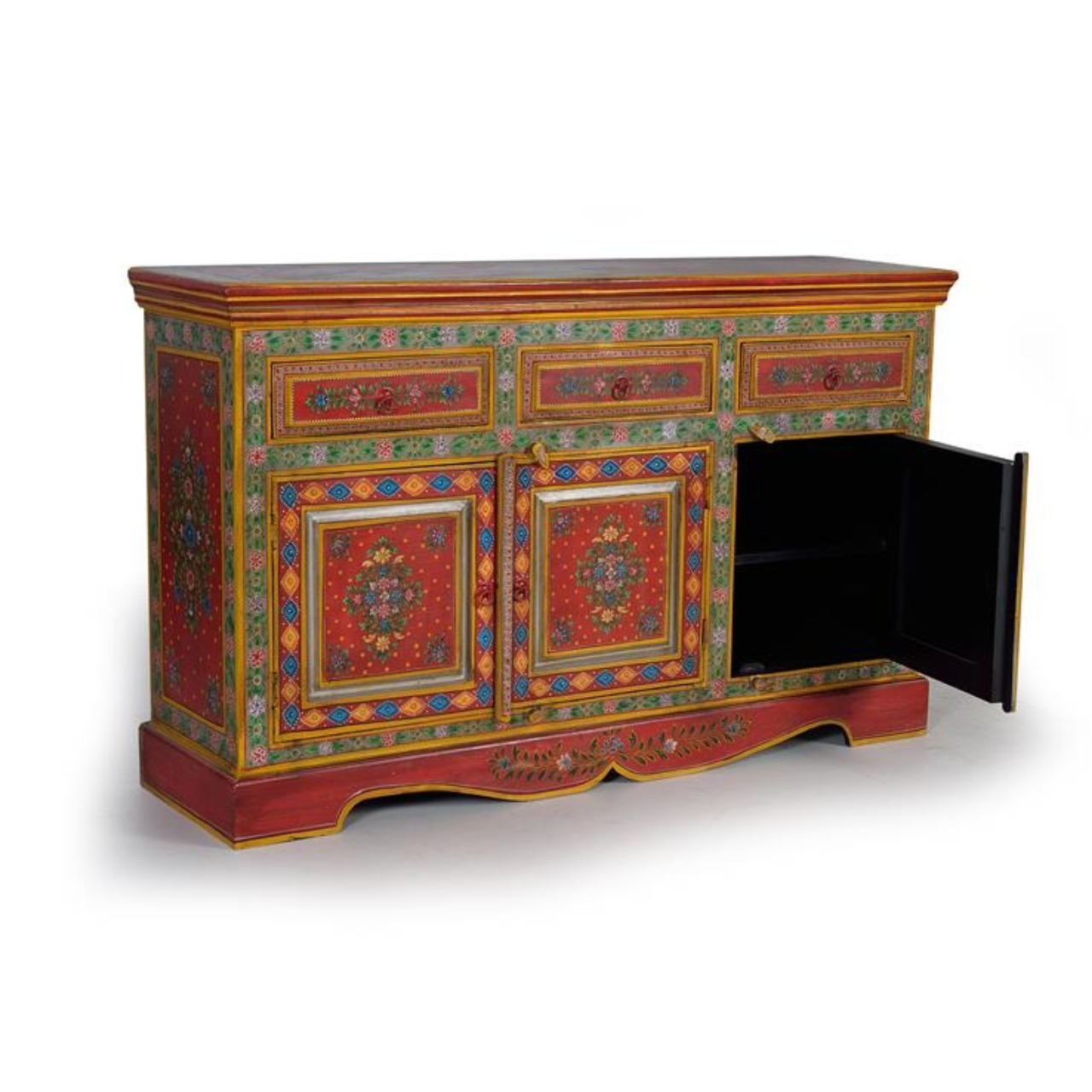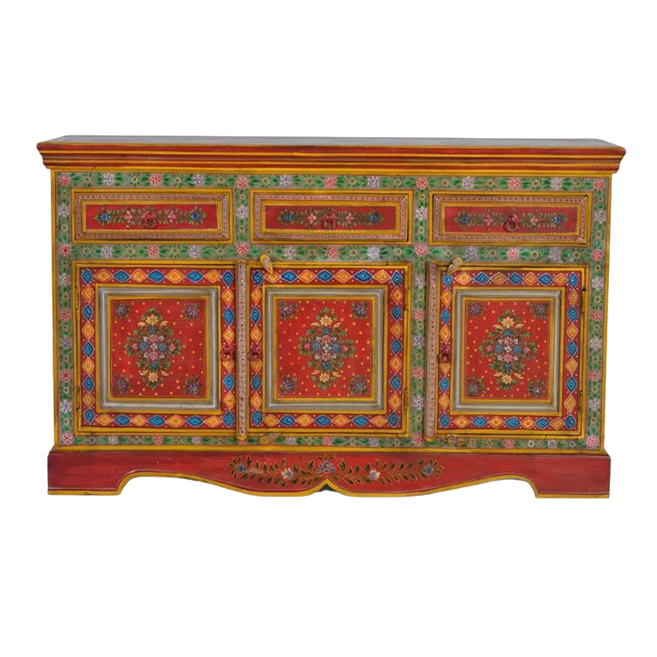 Presentamos un aparador confeccionado en madera de mango y MDF, uniendo funcionalidad con estética. Cuenta con 3 cajones y 3 puertas, proporcionando un espacio generoso para almacenamiento. Pintado a mano, el diseño es único y aporta un toque de color.