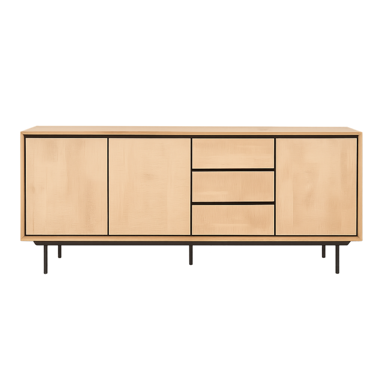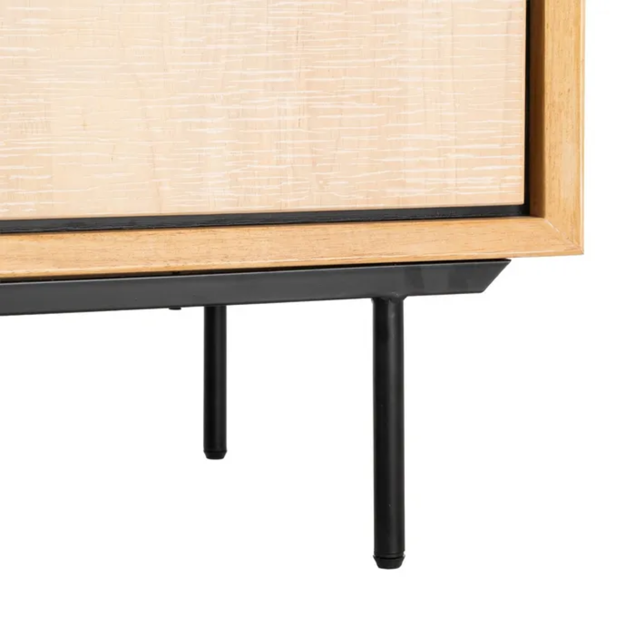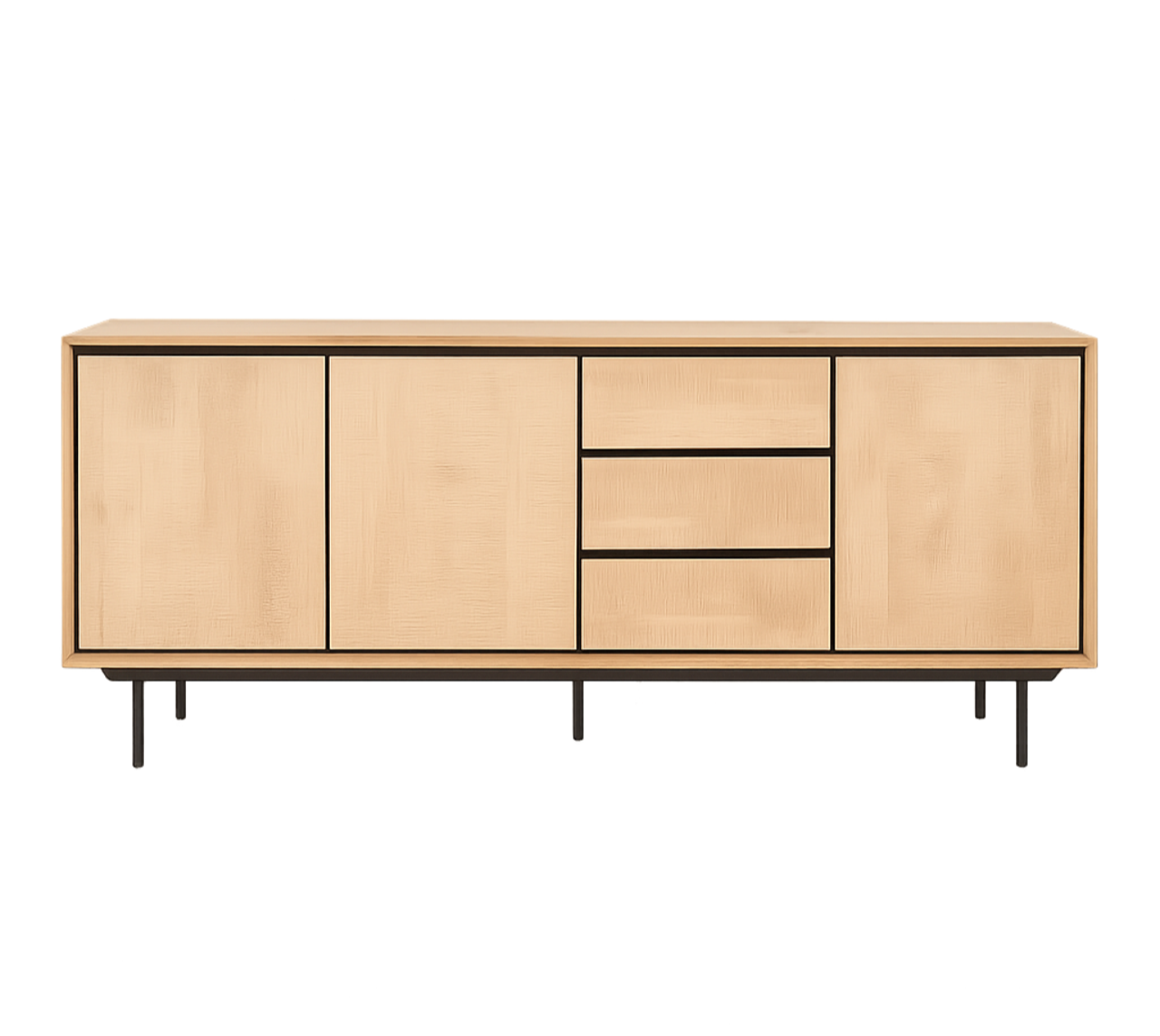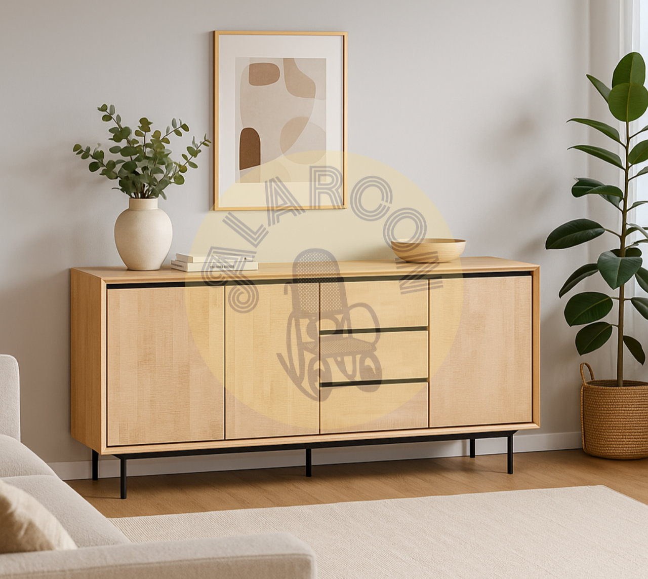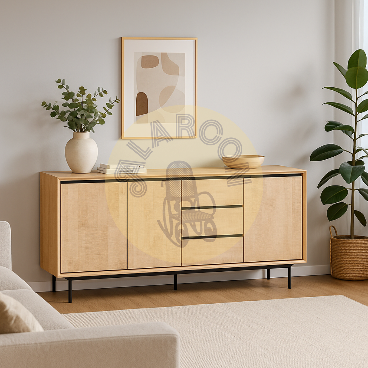 Pensado para espacios actuales, este aparador SINTRA combina madera y metal en un diseño limpio que aporta estilo sin recargar. Su acabado en color natural con detalles en negro resalta la textura del material y encaja con ambientes modernos o cálidos.
