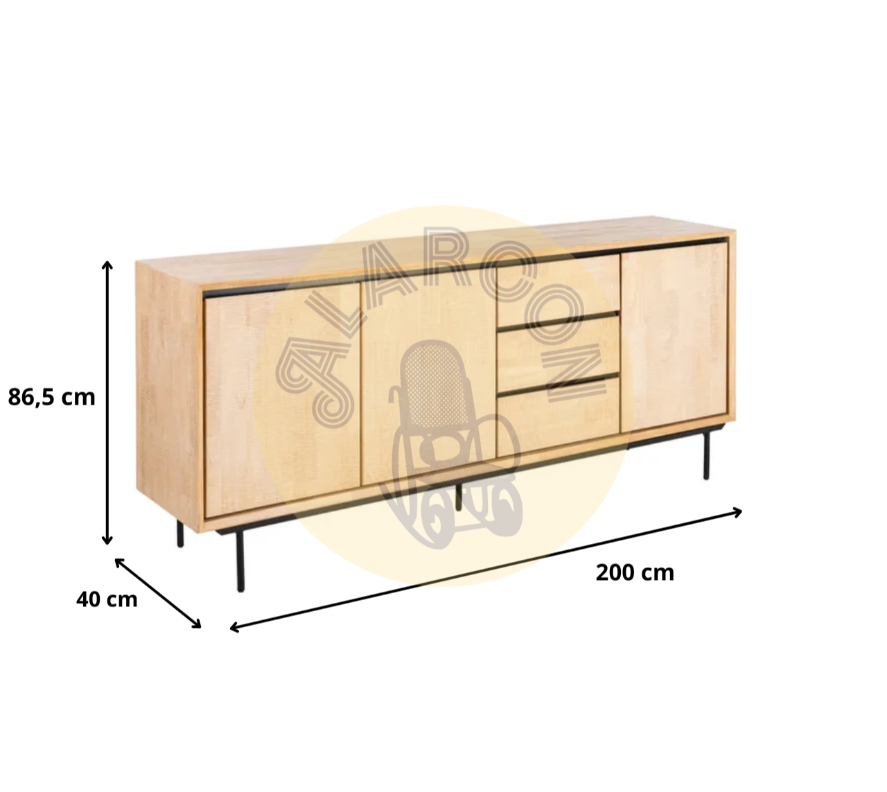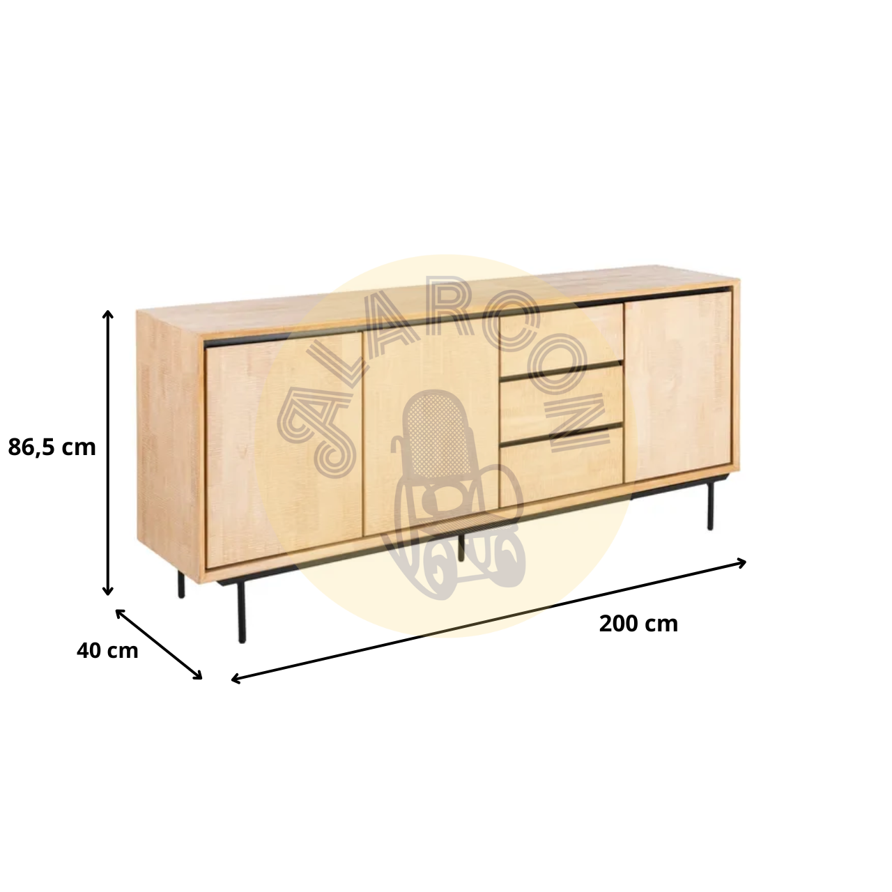 Con una estructura sólida y patas de hierro de 17 cm, ofrece almacenamiento práctico mediante puertas de 47,5 x 60 cm y cajones de 49 x 18,5 cm, aprovechando su interior con una leja a media altura. La pieza mide 200 x 40 x 86,5 cm, ideal para organizar y mantener el orden en el salón o comedor.