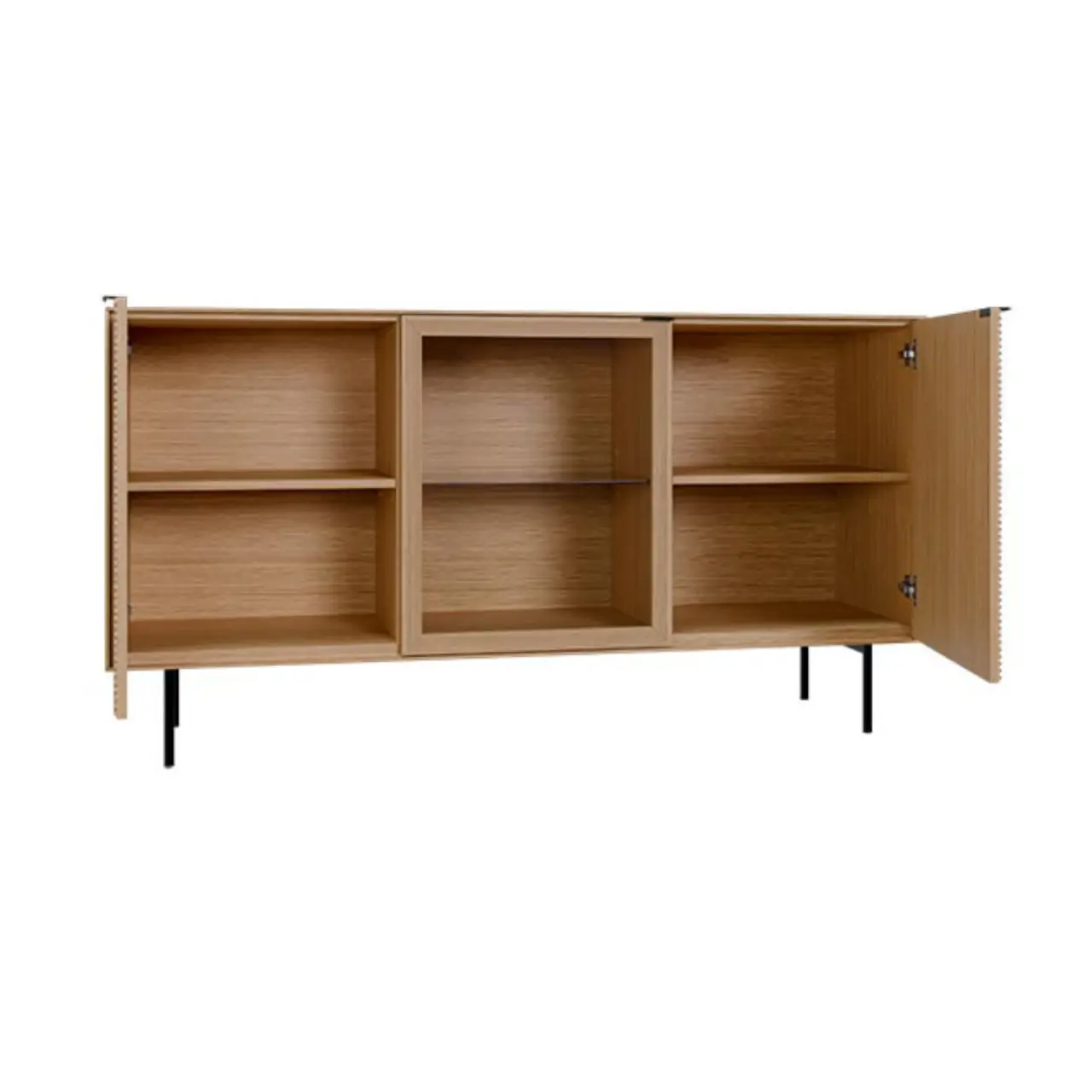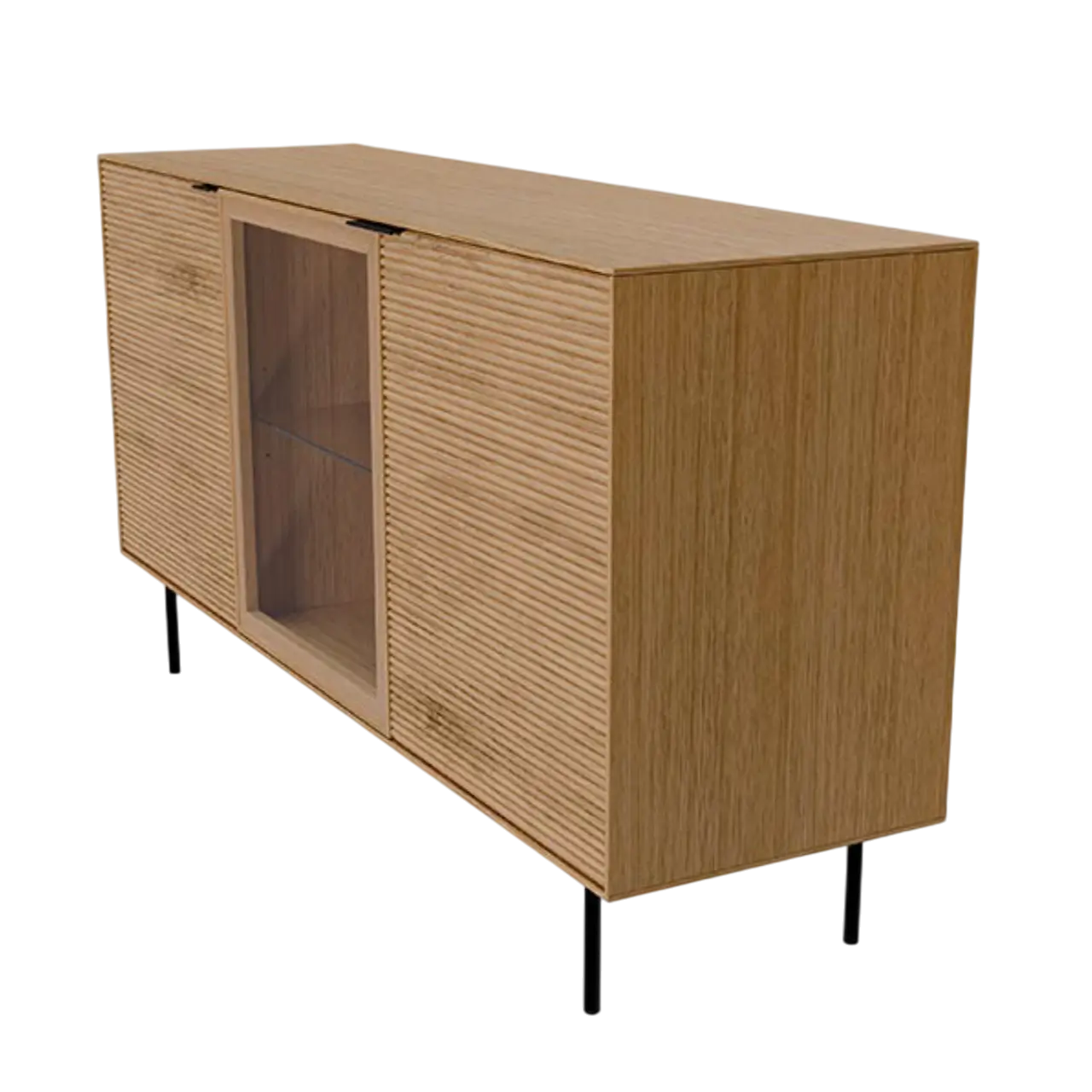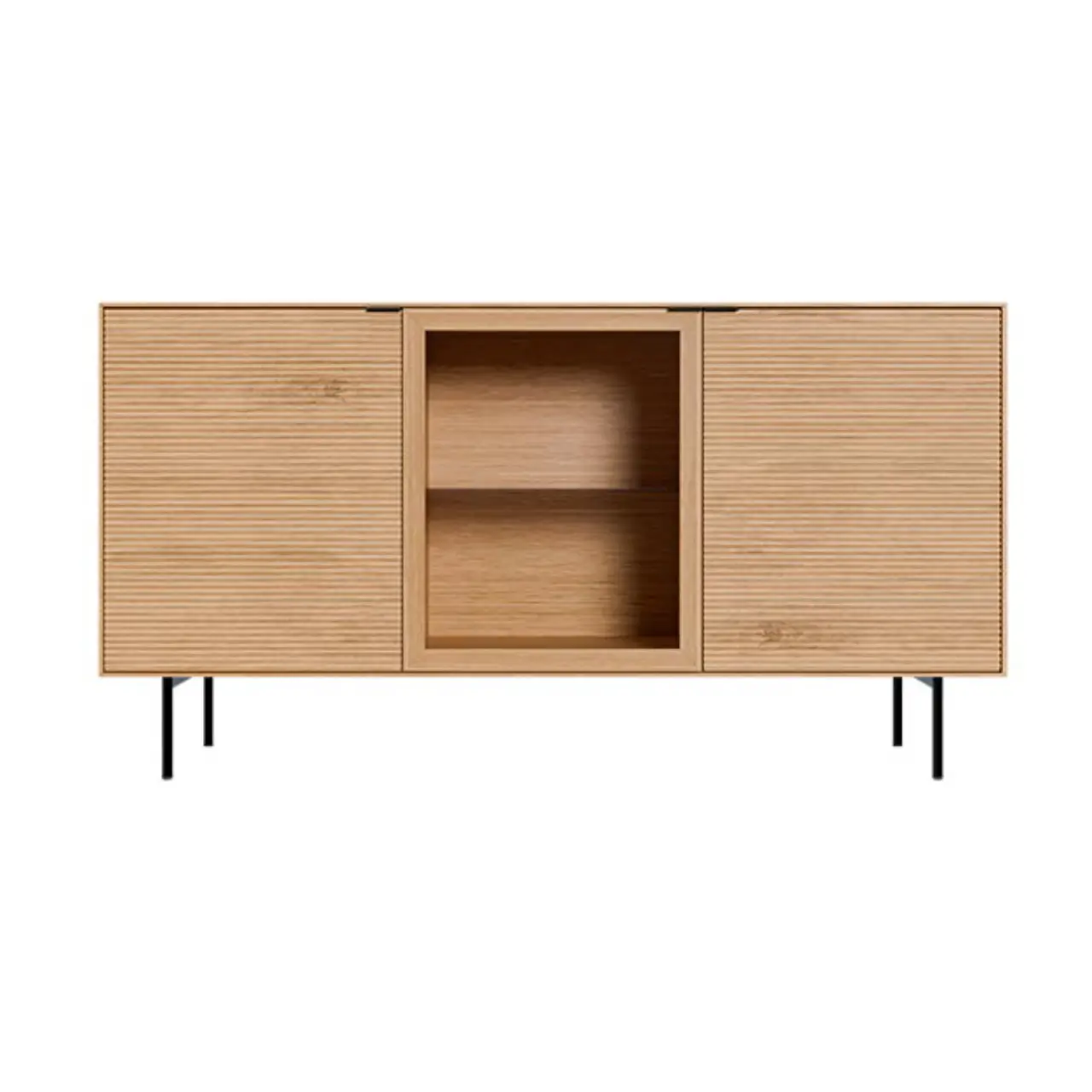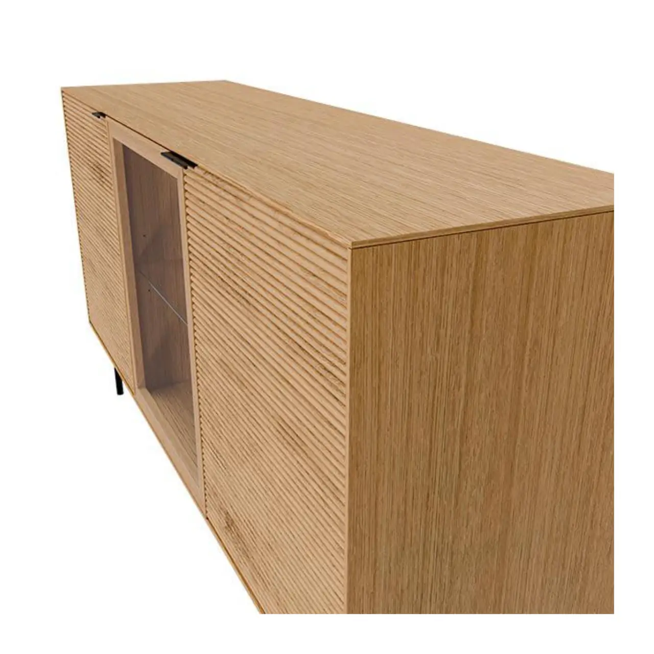 Añade estilo y funcionalidad con este aparador de roble, diseñado para optimizar el almacenamiento sin renunciar al diseño. Su estructura en chapa de roble se combina con frentes en madera maciza de roble rayado, aportando un acabado natural y sofisticado. Incorpora dos puertas de madera y una puerta de cristal, ideal para exhibir objetos decorativos.