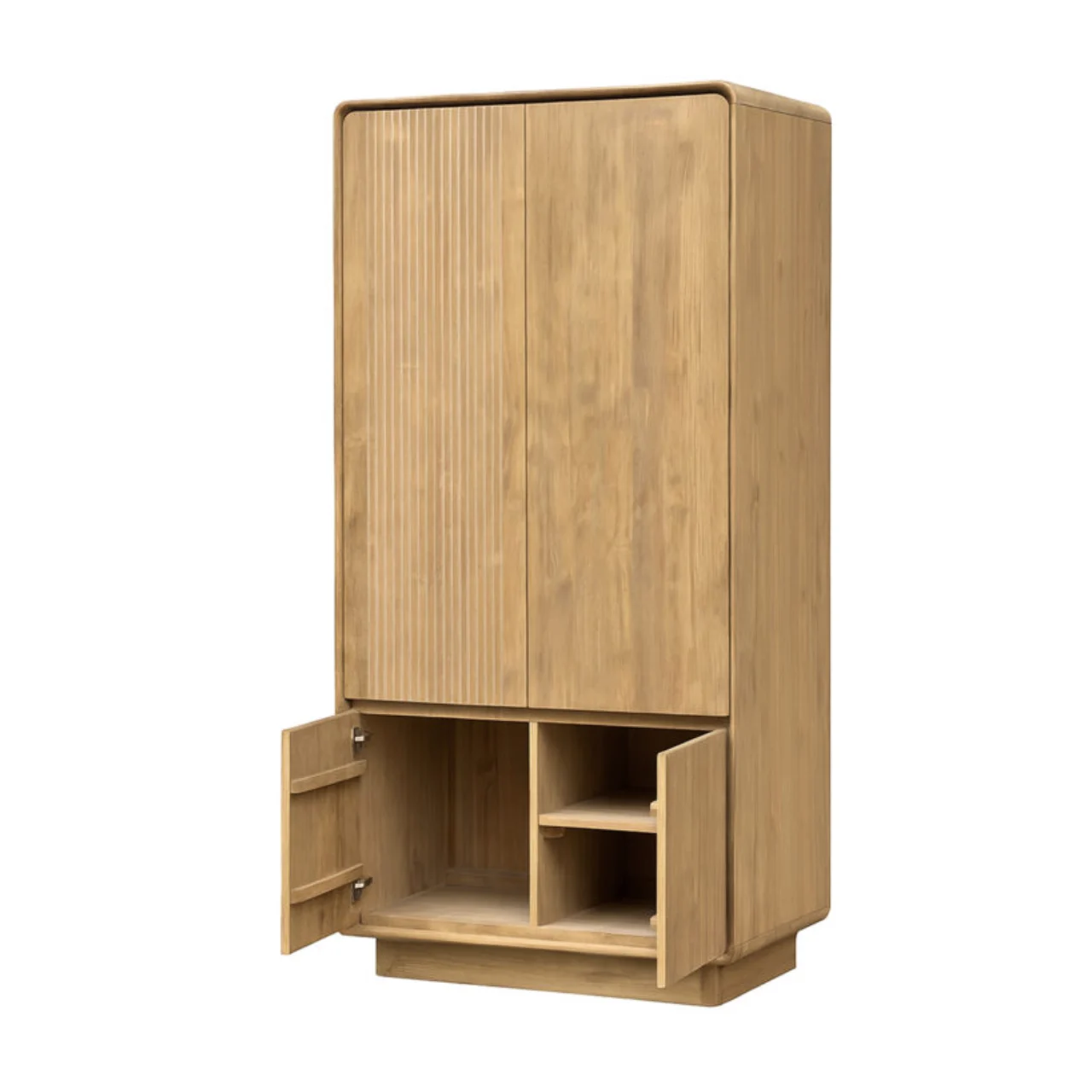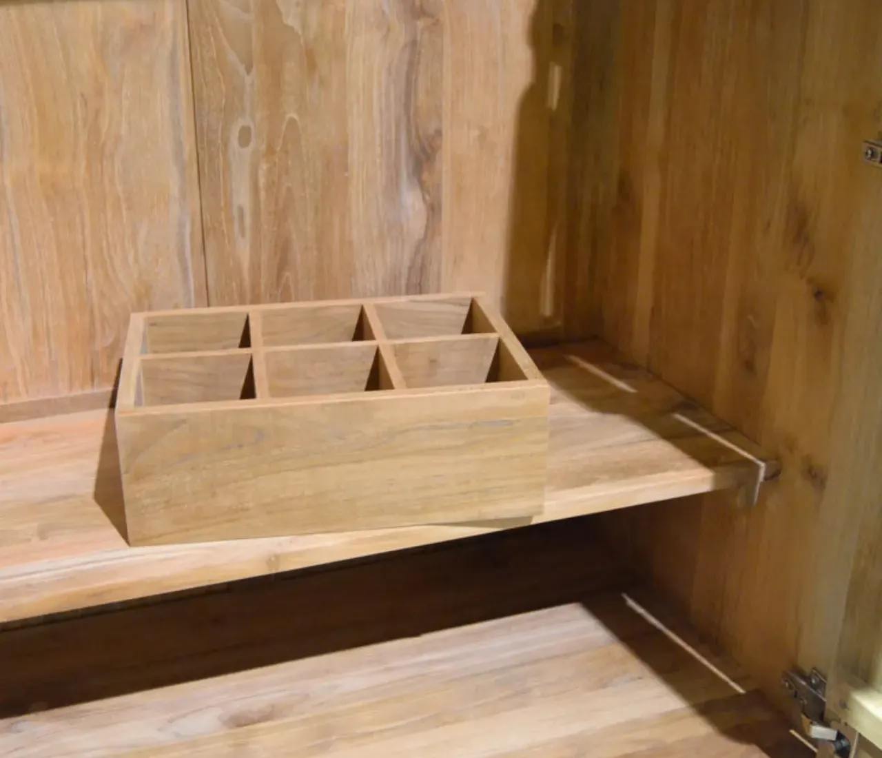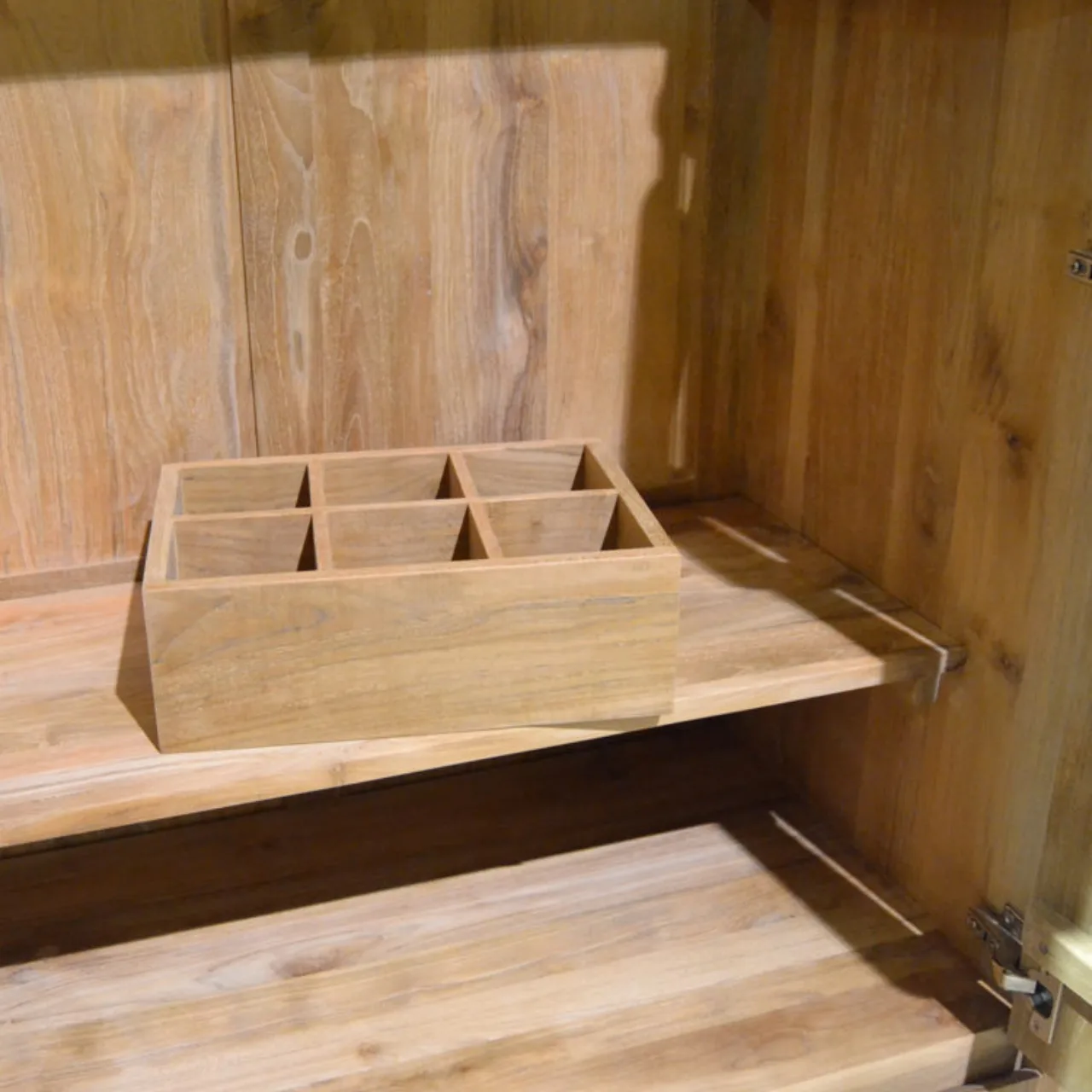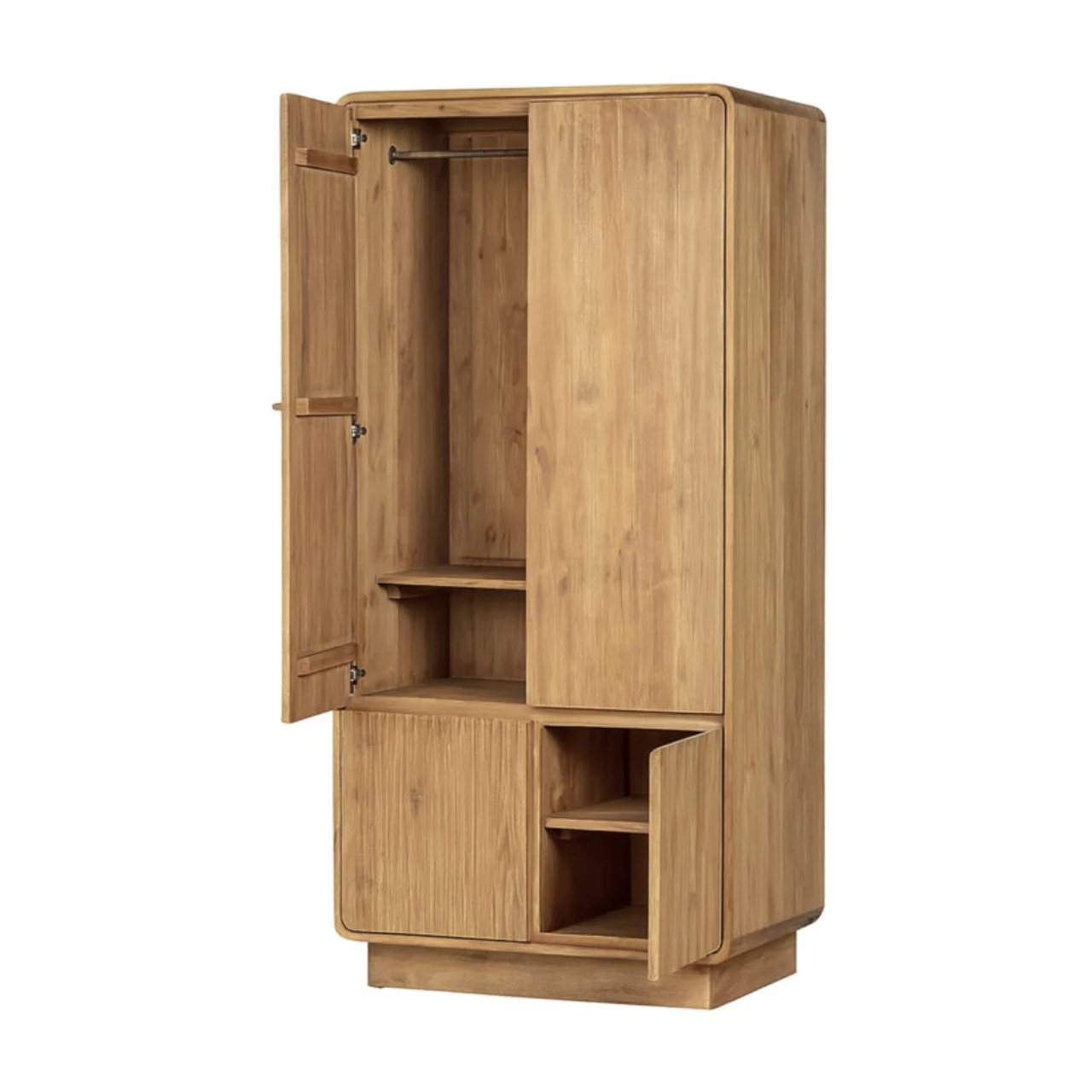 El armario Eyre combina diseño natural y funcionalidad en una pieza única de madera de teca maciza. Su acabado cálido y vetas naturales aportan un toque auténtico que realza cualquier ambiente, desde dormitorios hasta salones modernos.