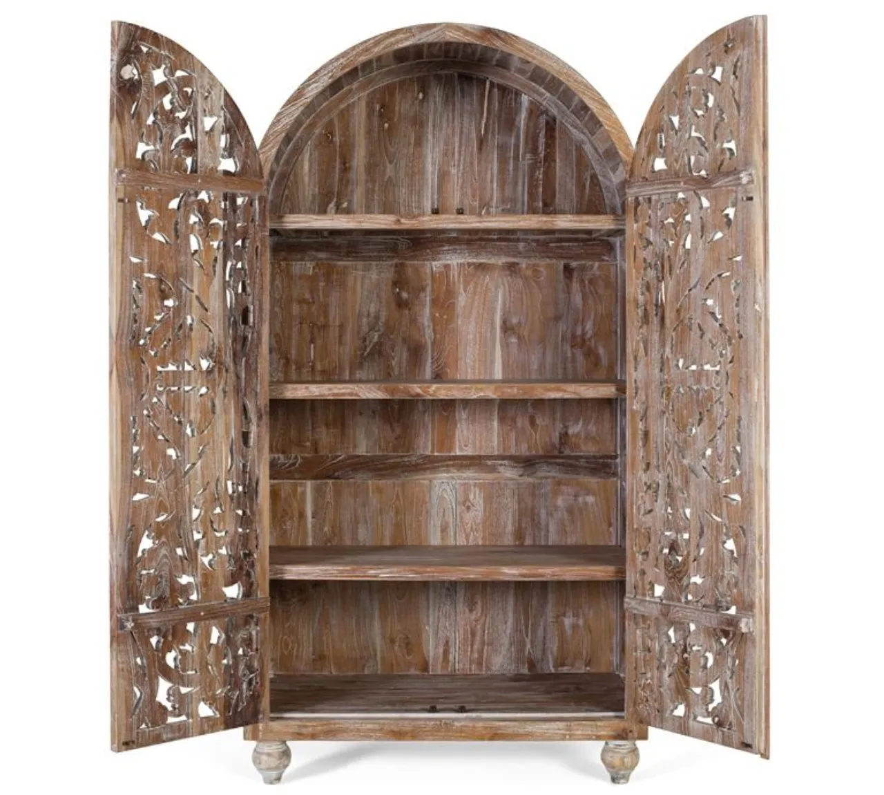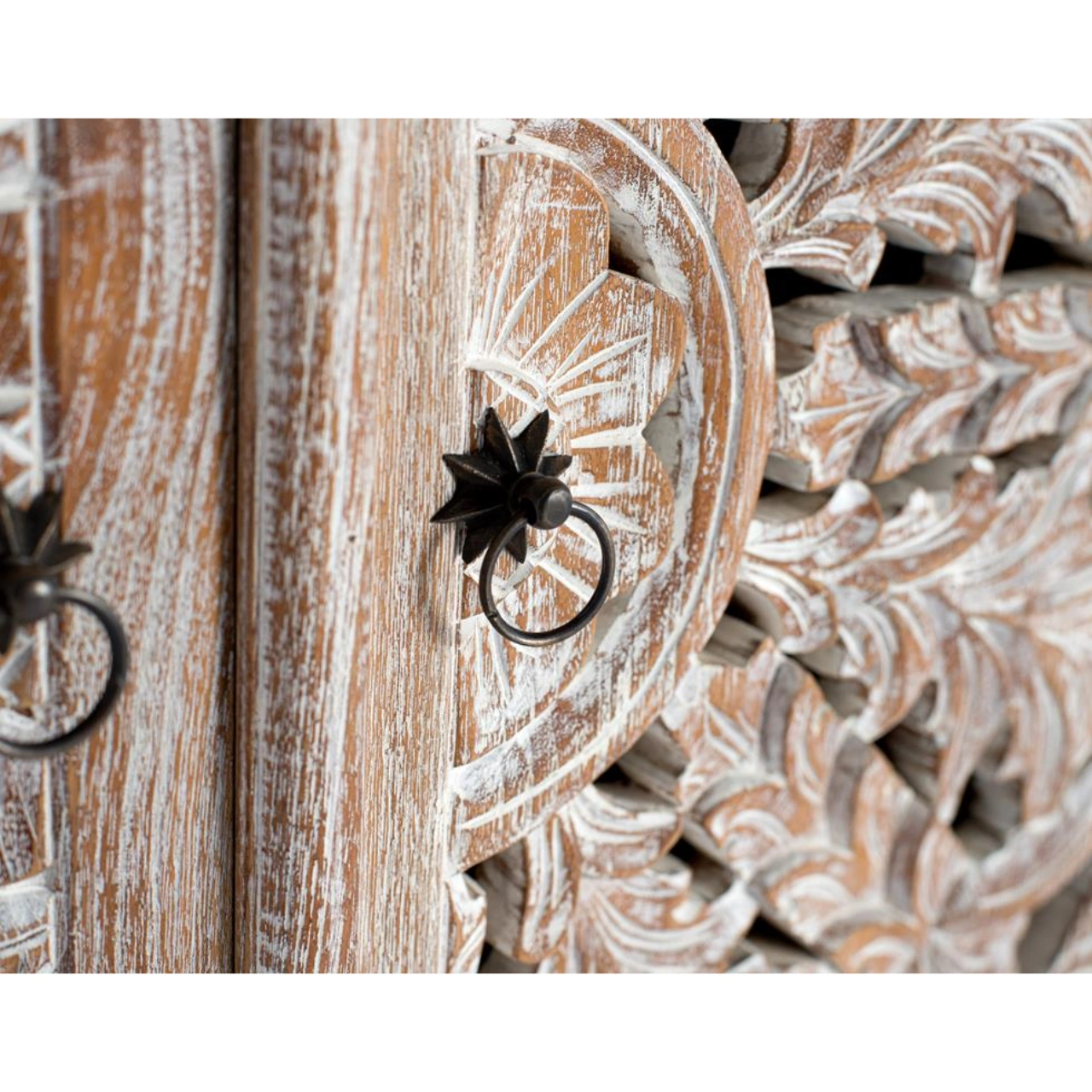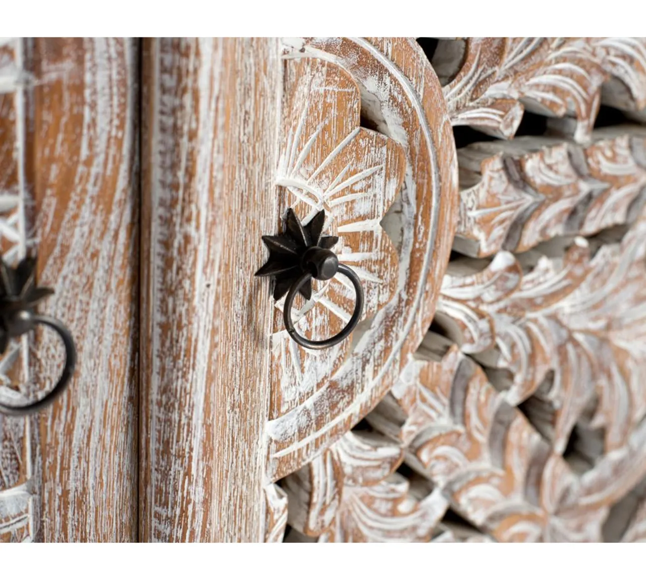 Crea un punto focal en tu espacio con este armario de madera maciza de teca, trabajado con una talla artesanal profunda y un acabado blanco lavado que resalta cada relieve. Su frontal incorpora dos puertas arqueadas decoradas con un medallón central tallado, aportando un estilo exótico, tradicional y lleno de carácter.