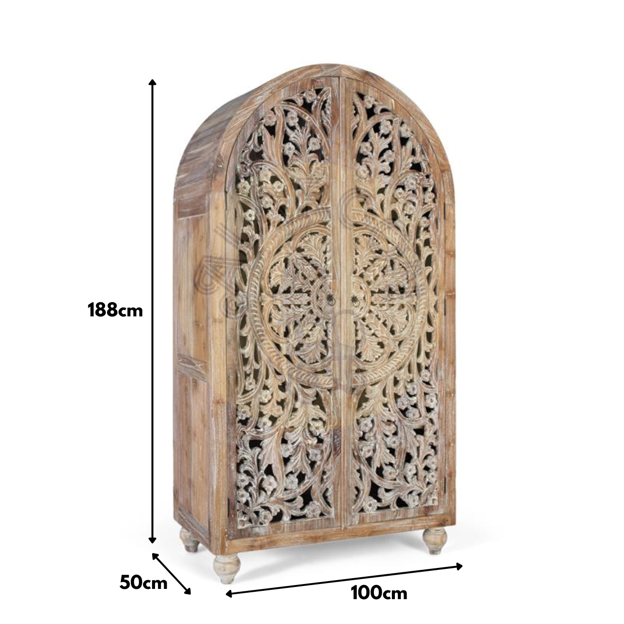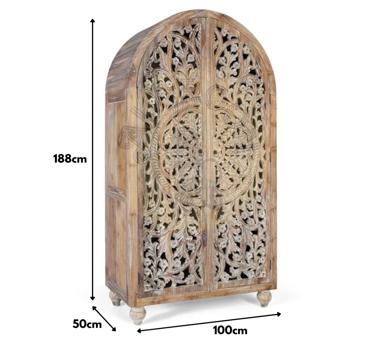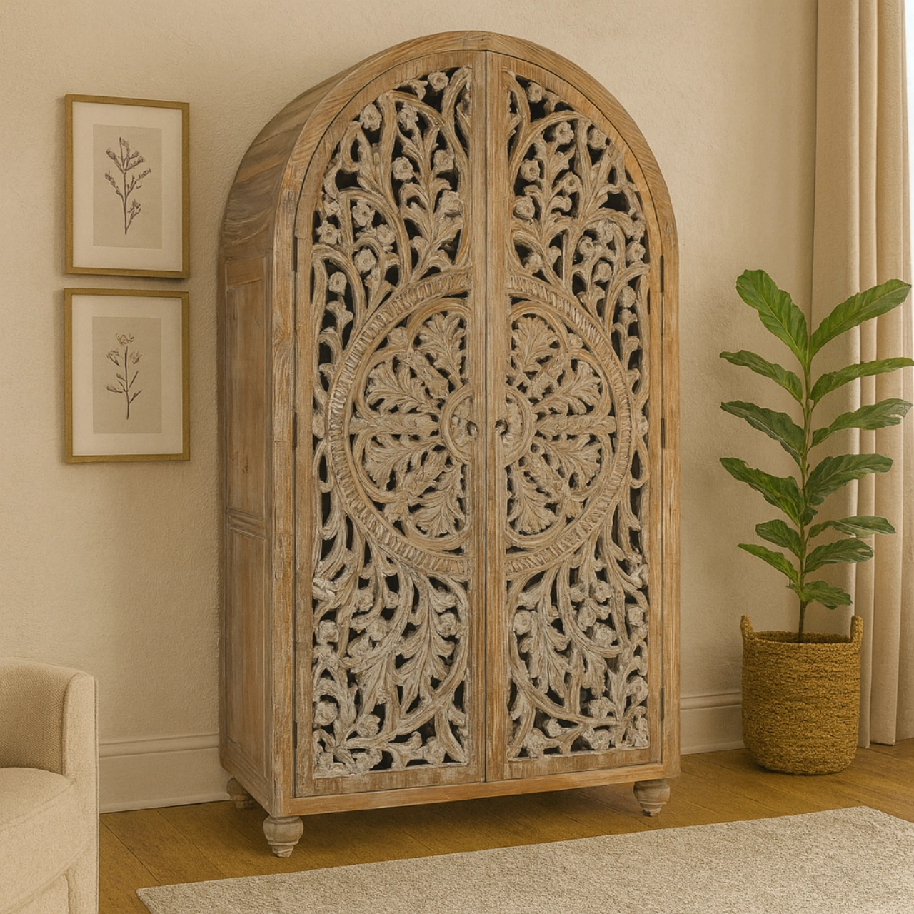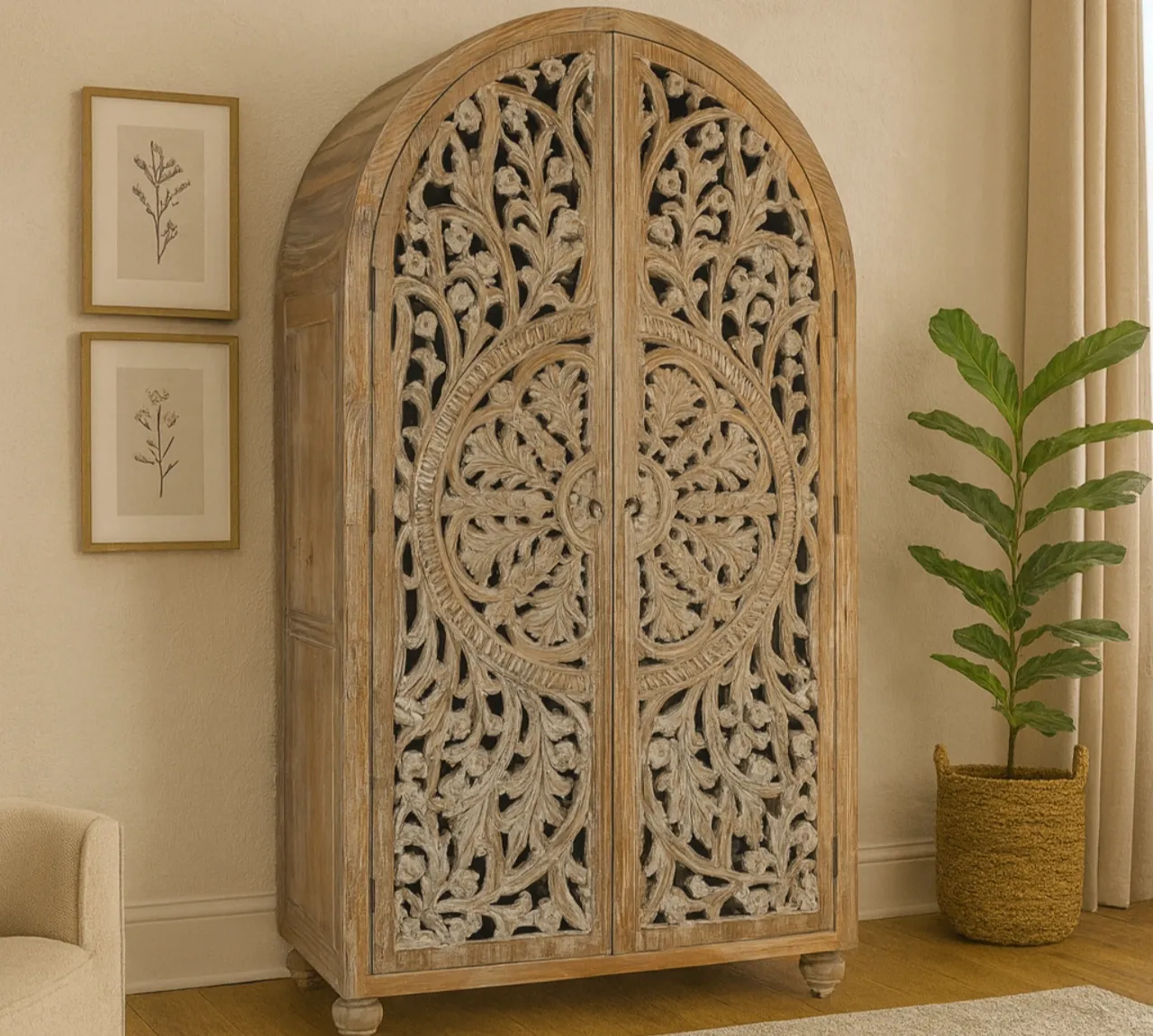 Crea un punto focal en tu espacio con este armario de madera maciza de teca, trabajado con una talla artesanal profunda y un acabado blanco lavado que resalta cada relieve. Su frontal incorpora dos puertas arqueadas decoradas con un medallón central tallado, aportando un estilo exótico, tradicional y lleno de carácter.