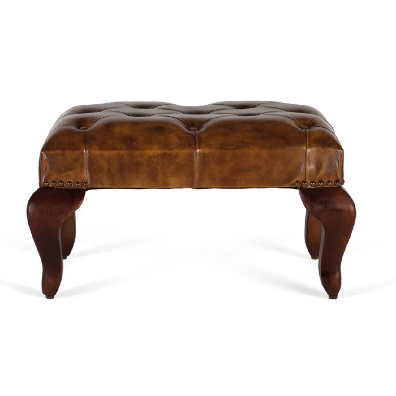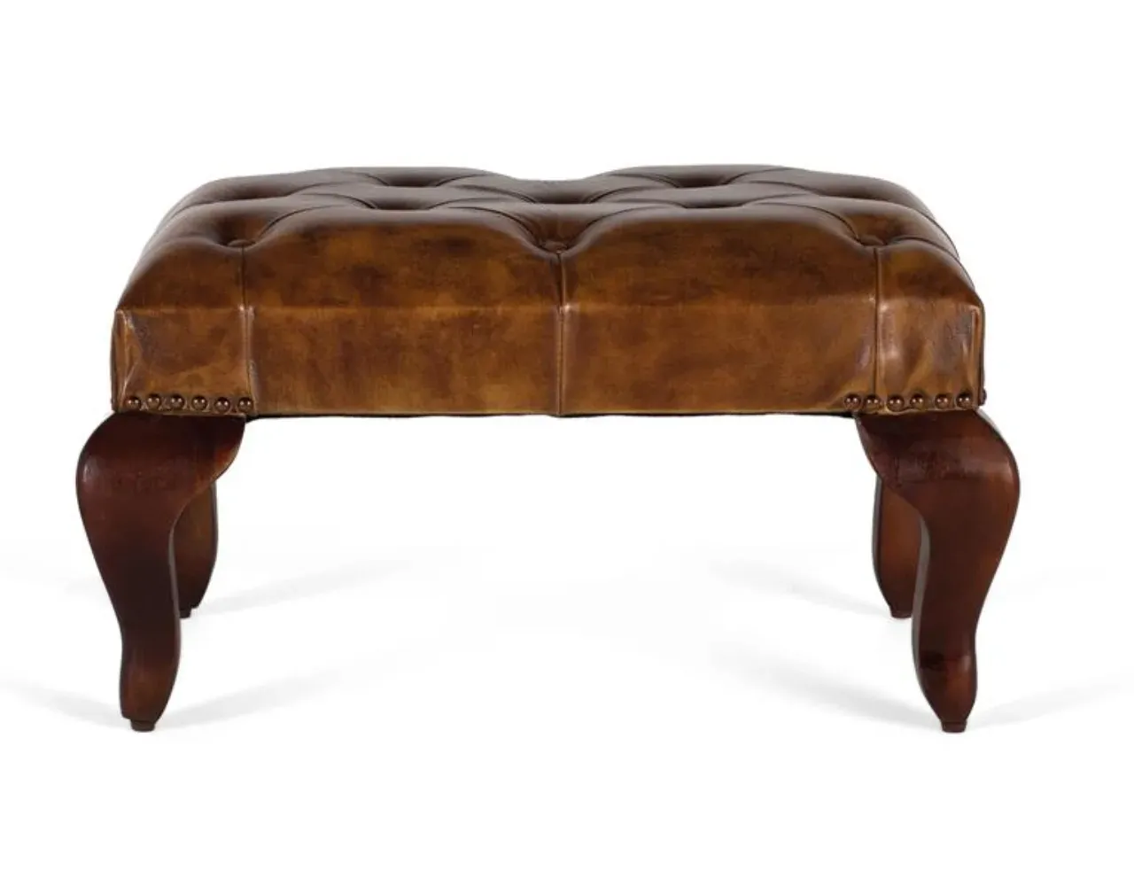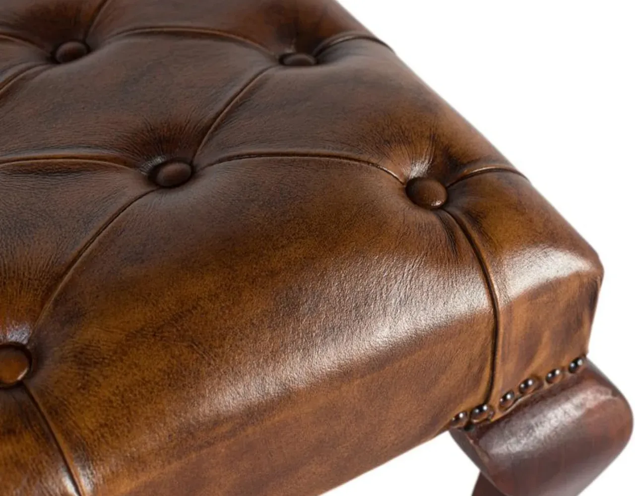 Elegancia clásica y carácter atemporal definen esta banqueta vintage fabricada en madera de acacia, con patas curvadas que aportan estabilidad y una presencia sofisticada. El asiento tapizado en piel color nogal con acabado envejecido destaca por su capitoné decorativo y el remate de tachuelas metálicas, detalles que refuerzan su estilo artesanal.