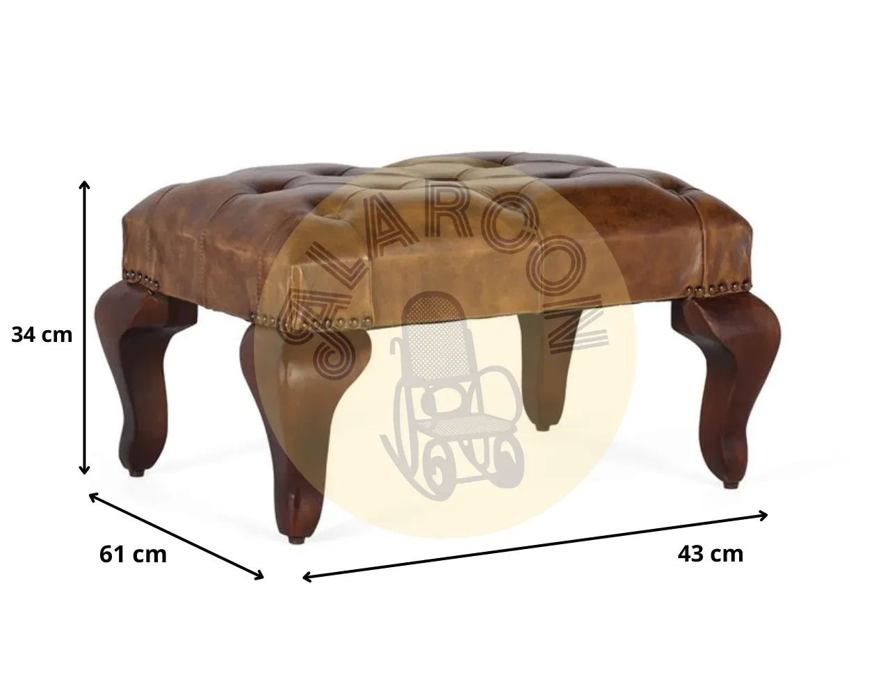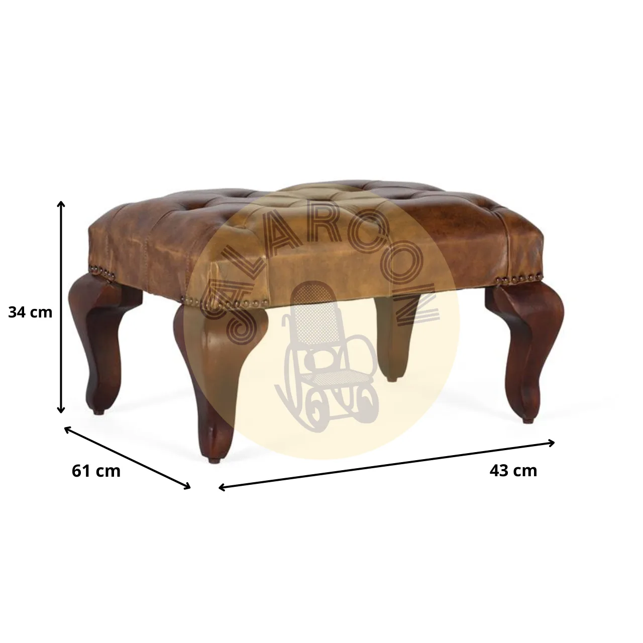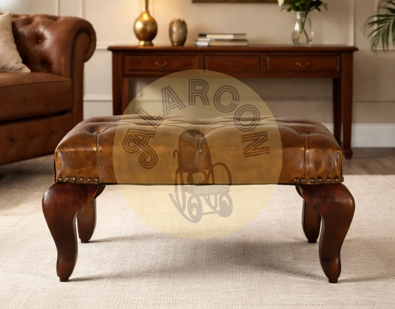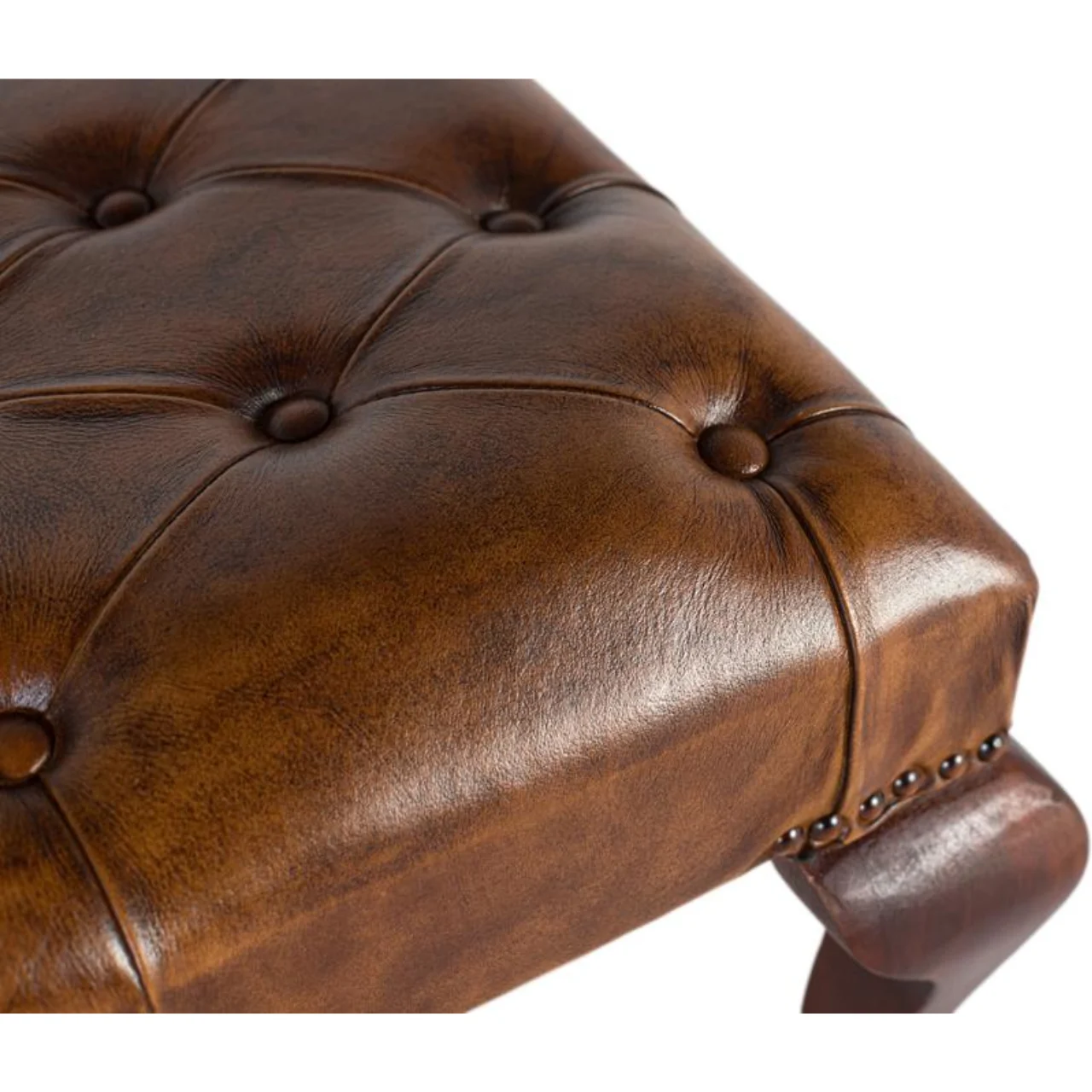 Elegancia clásica y carácter atemporal definen esta banqueta vintage fabricada en madera de acacia, con patas curvadas que aportan estabilidad y una presencia sofisticada. El asiento tapizado en piel color nogal con acabado envejecido destaca por su capitoné decorativo y el remate de tachuelas metálicas, detalles que refuerzan su estilo artesanal.