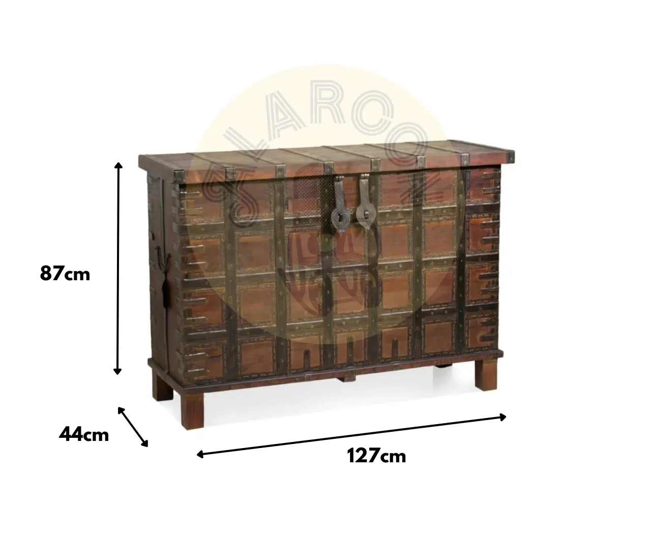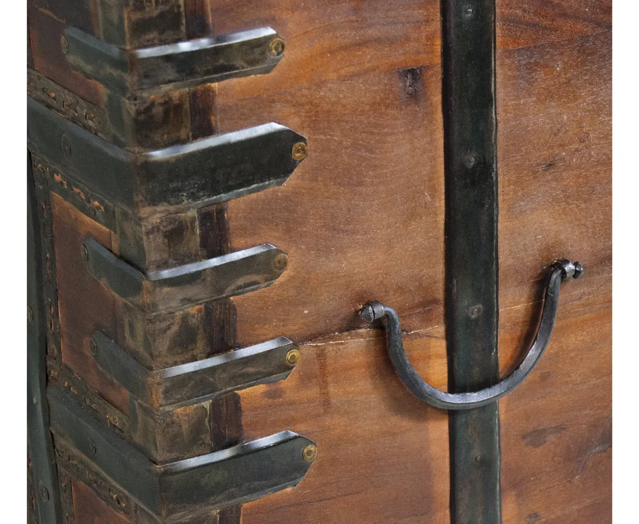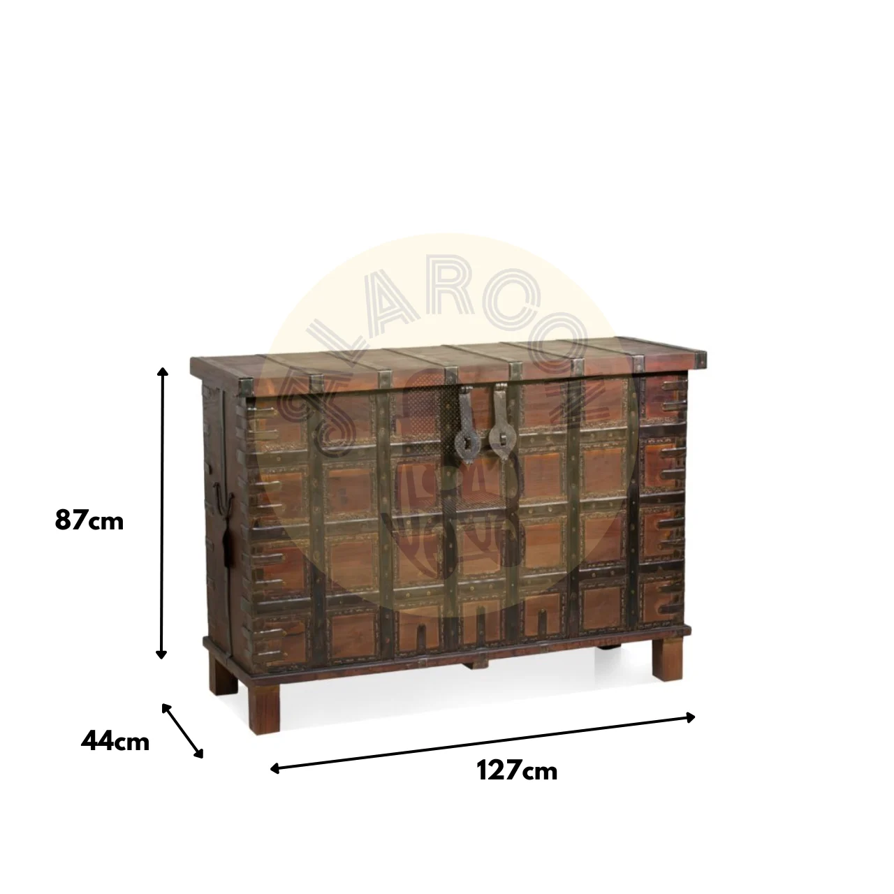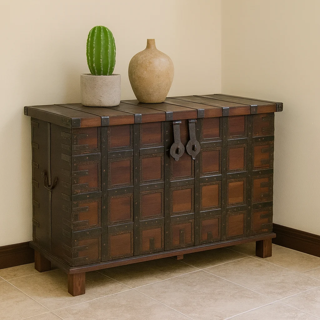 El baúl Alhambra está fabricado en madera reciclada y detalles en metal, ofreciendo una pieza única que combina resistencia, funcionalidad y un estilo artesanal lleno de carácter.
