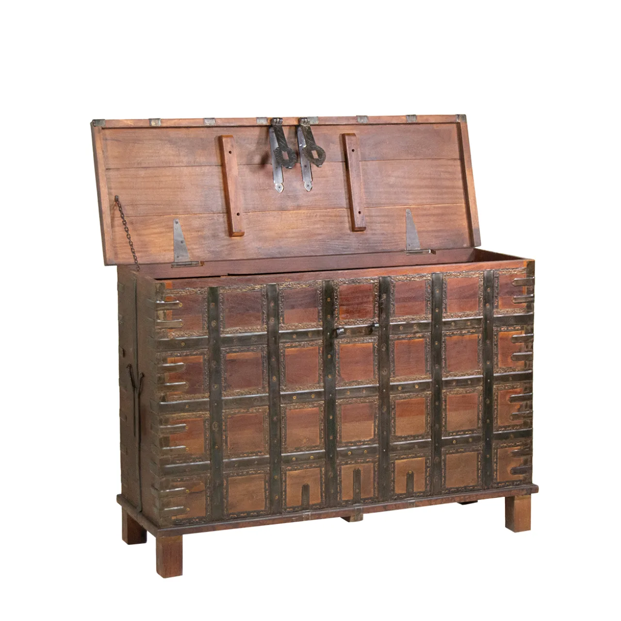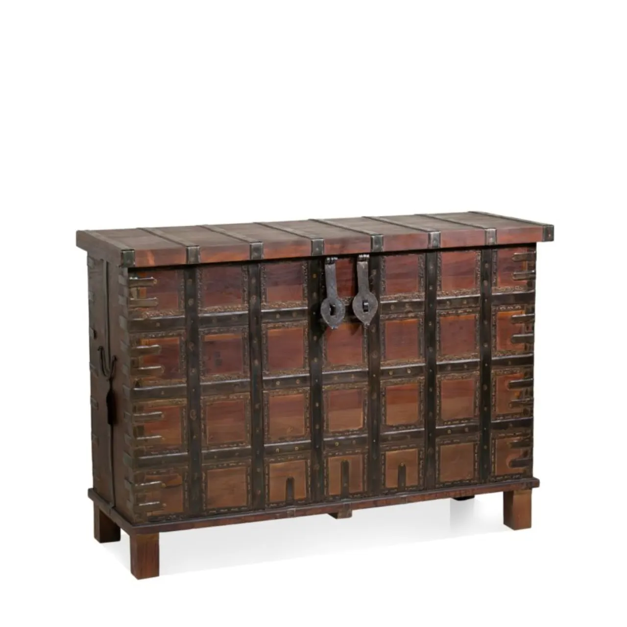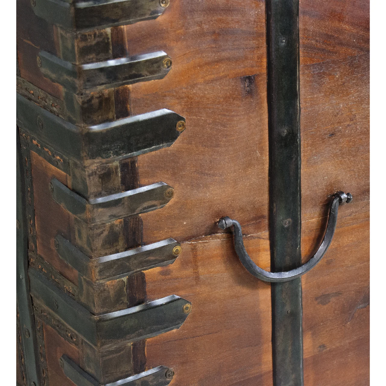 El baúl Alhambra está fabricado en madera reciclada y detalles en metal, ofreciendo una pieza única que combina resistencia, funcionalidad y un estilo artesanal lleno de carácter.