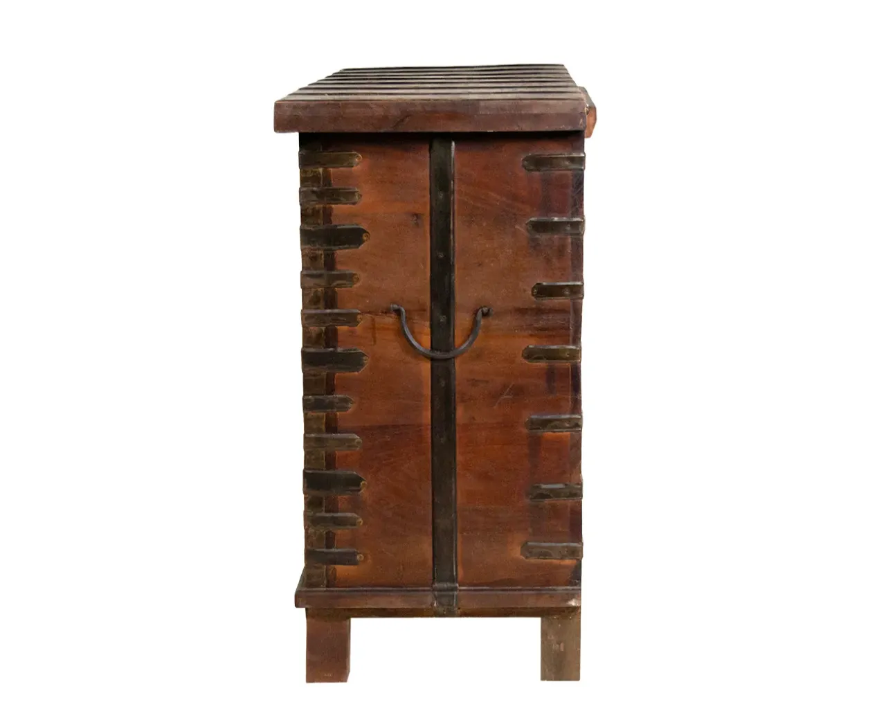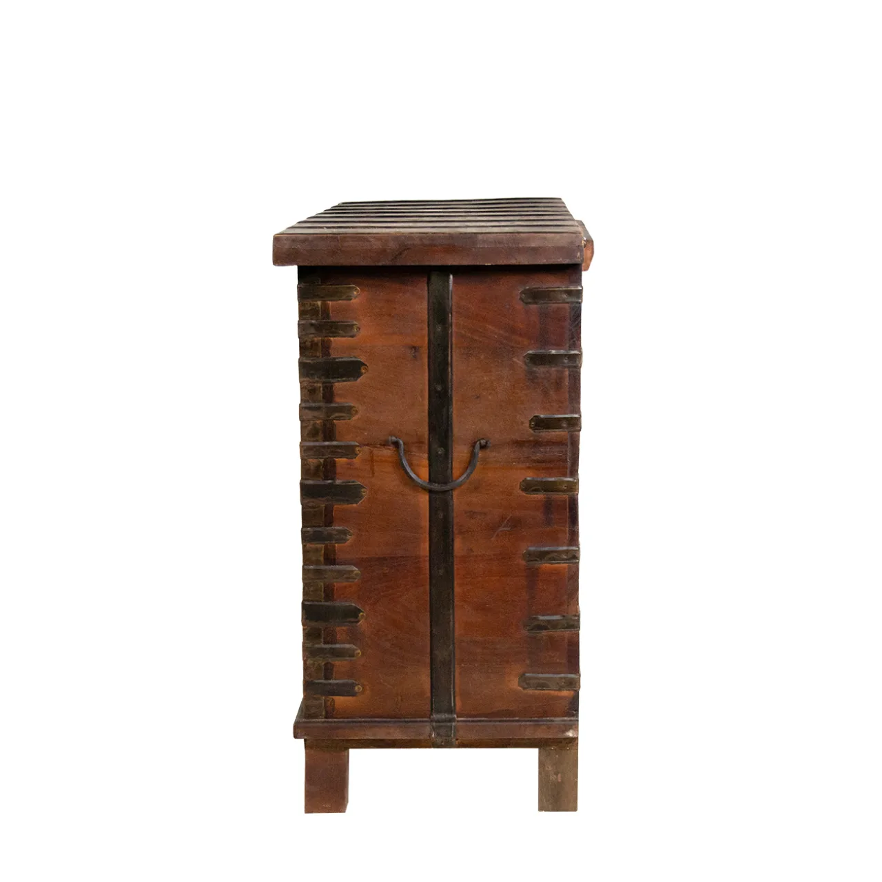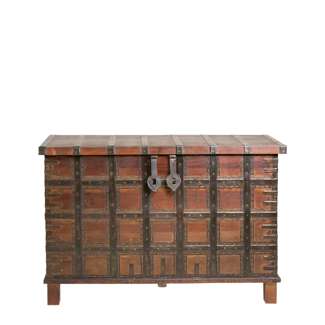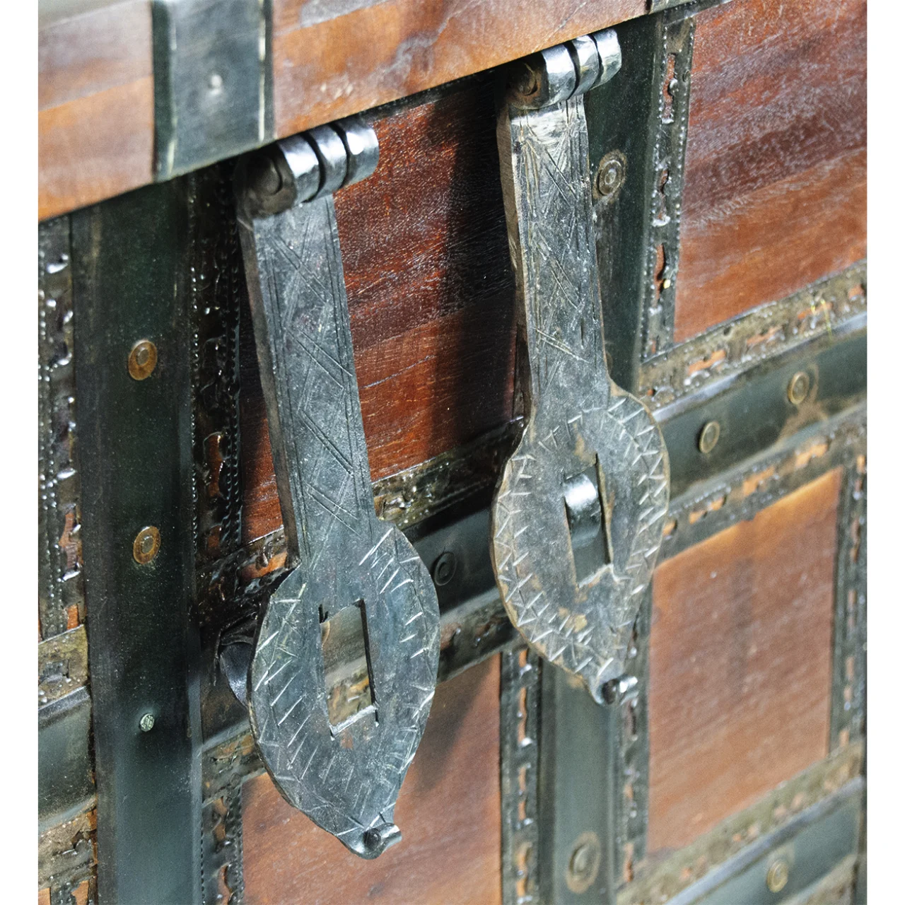 El baúl Alhambra está fabricado en madera reciclada y detalles en metal, ofreciendo una pieza única que combina resistencia, funcionalidad y un estilo artesanal lleno de carácter.