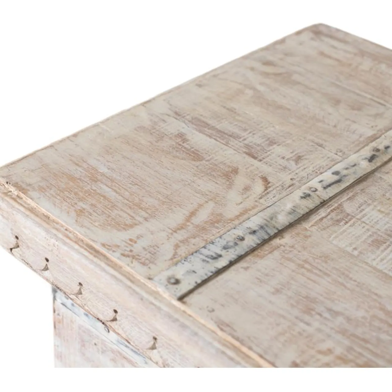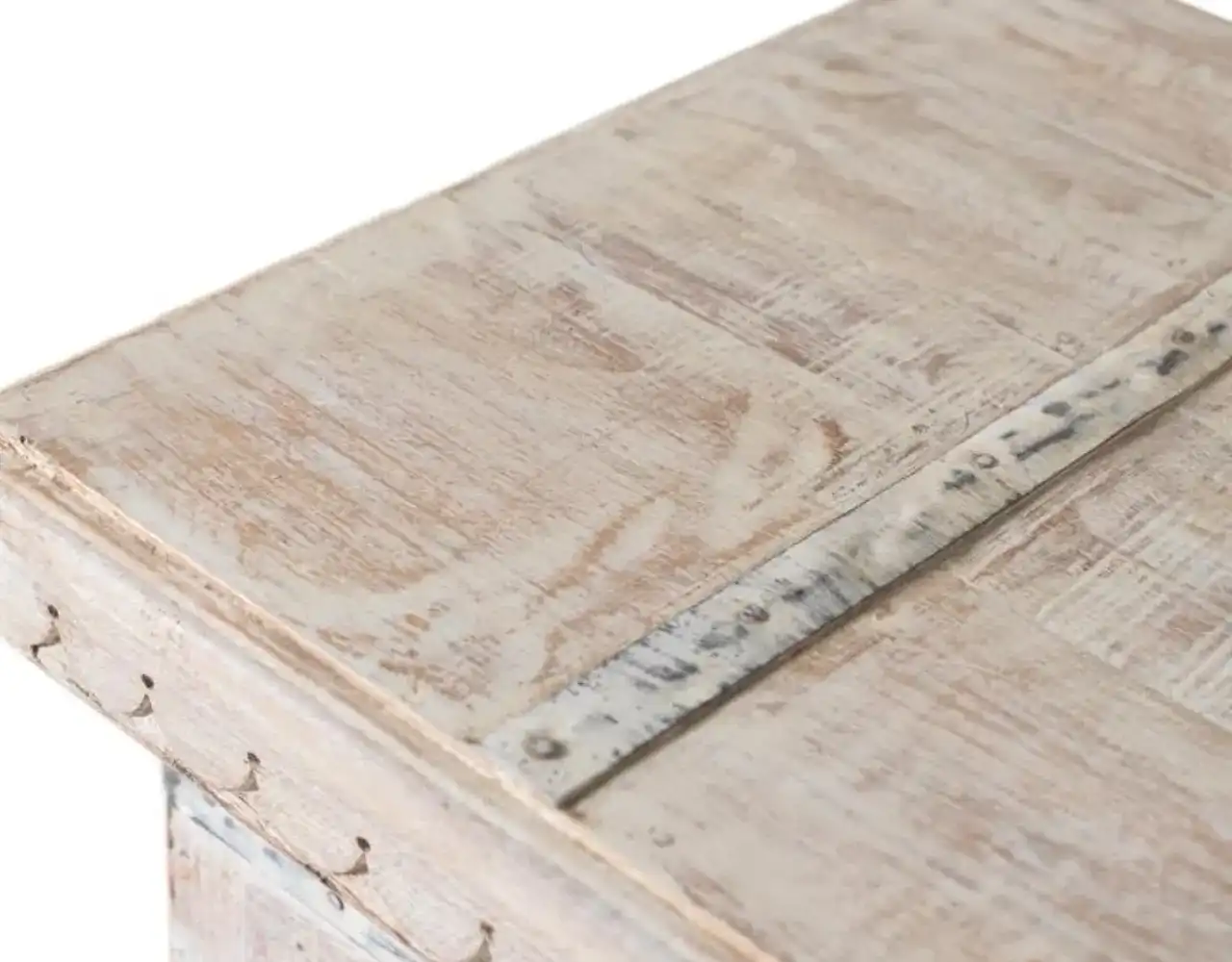 Añade carácter a tu espacio con este baúl de madera maciza de estilo vintage colonial, diseñado con un cuidado acabado blanco decapado que resalta su estética artesanal y envejecida. Cada detalle, desde sus vetas naturales hasta el efecto desgastado, contribuye a una pieza que se integra con elegancia en ambientes rústicos o clásicos.