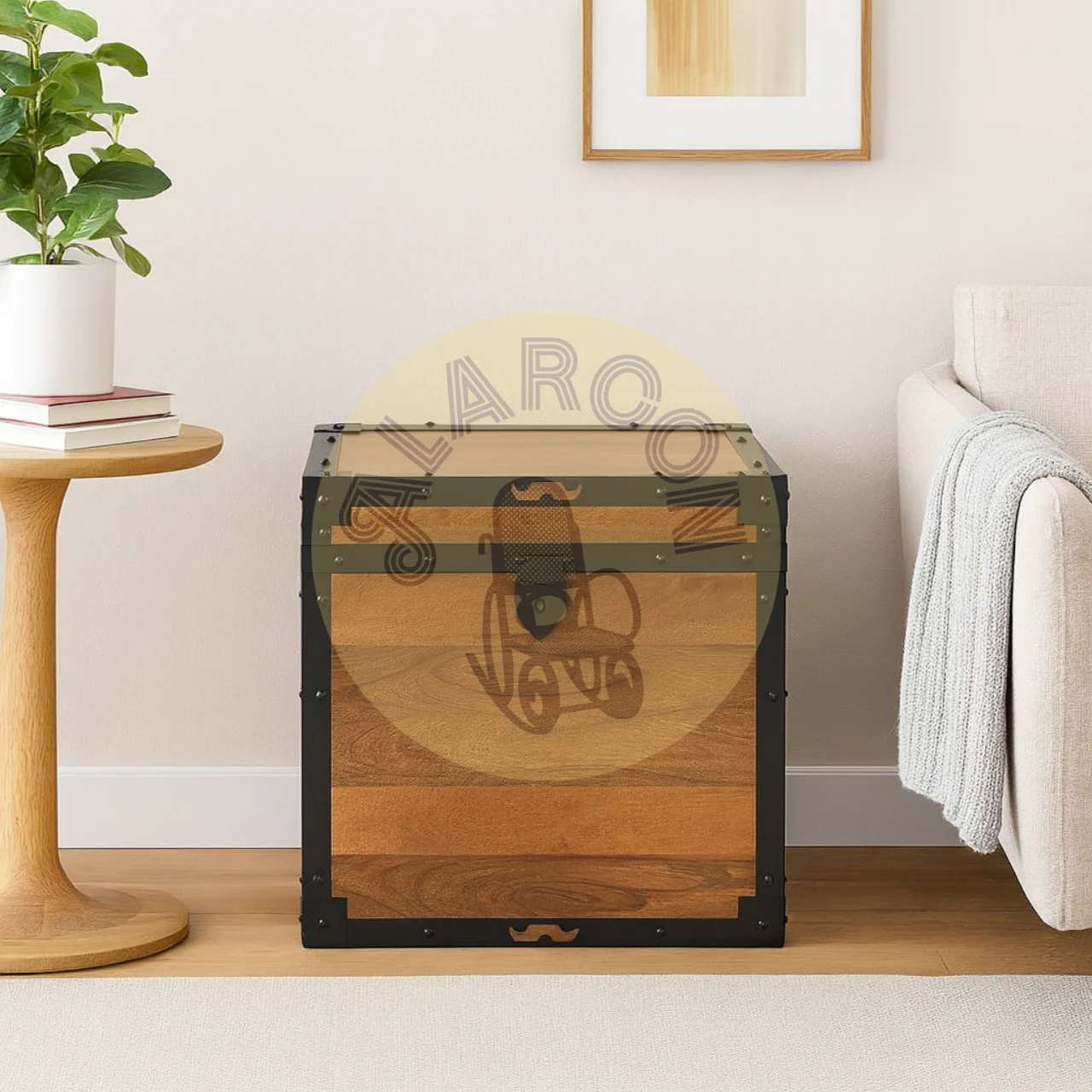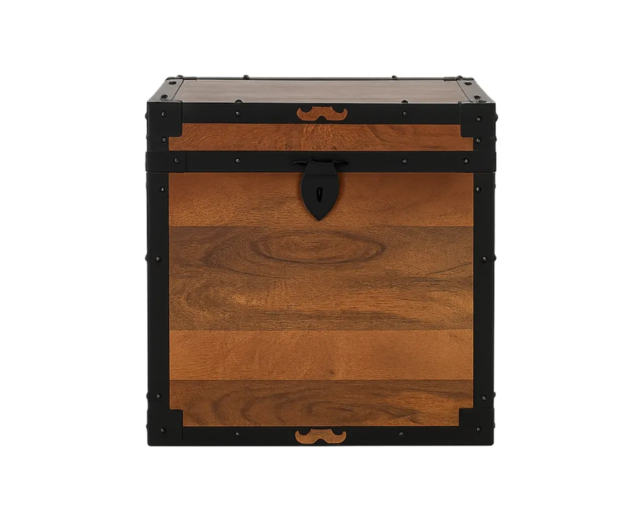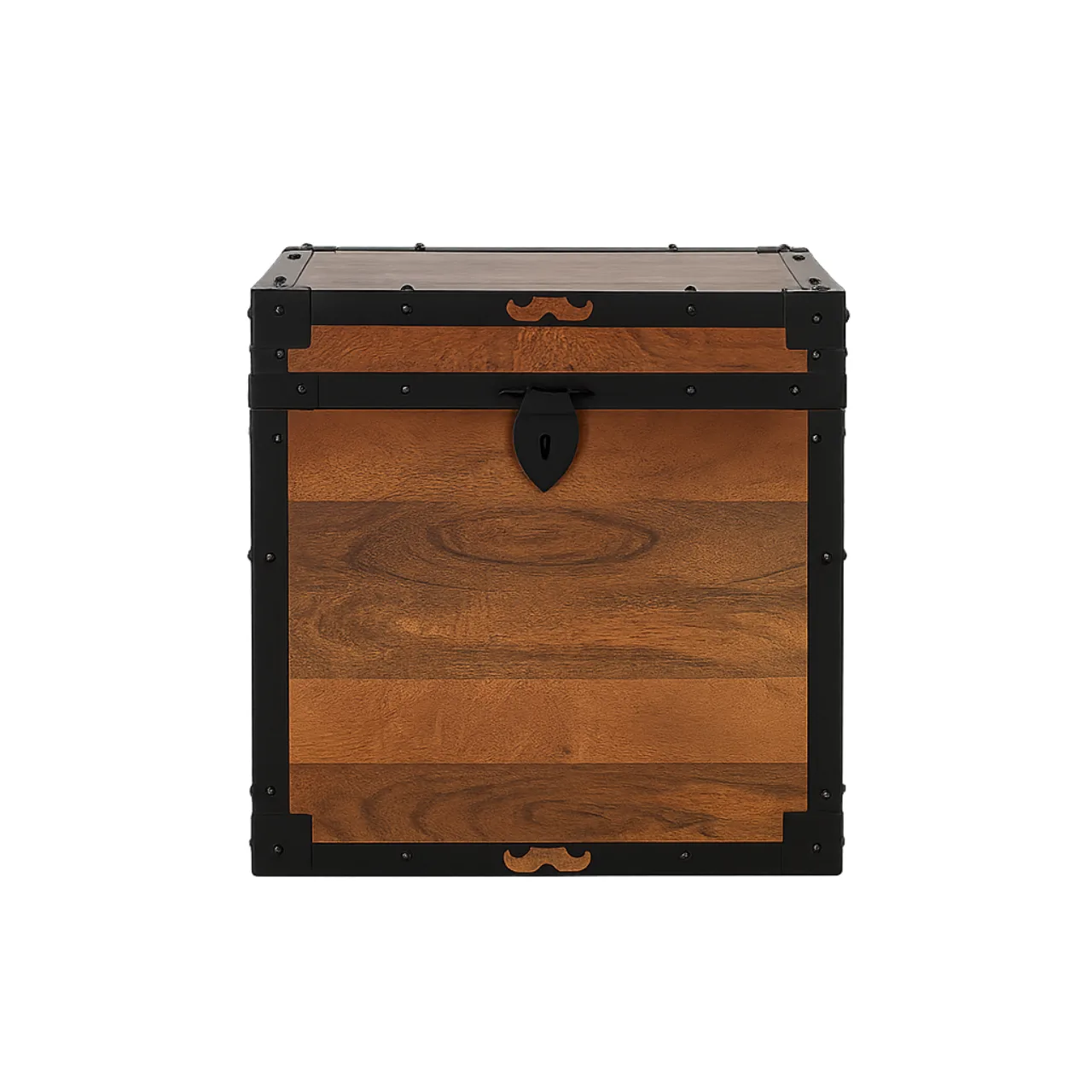 Fabricado en madera maciza de mango, este baúl combina resistencia y carácter. Sus herrajes de hierro negro recorren los bordes y esquinas, aportando un marcado estilo industrial vintage que destaca en cualquier estancia.