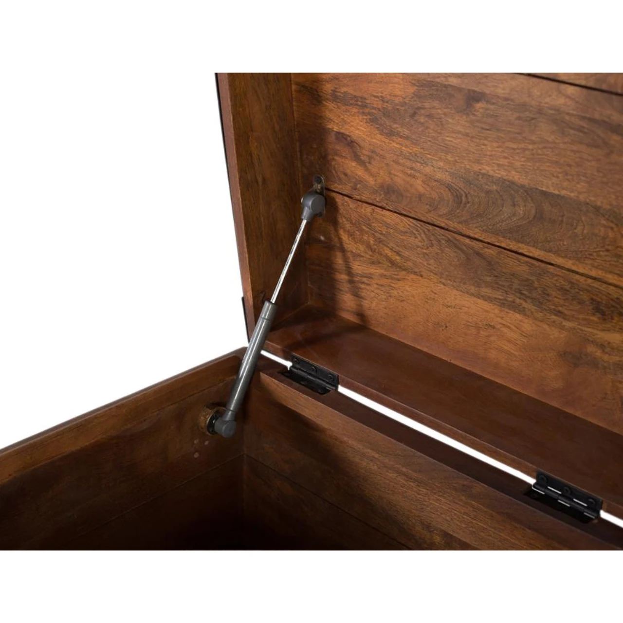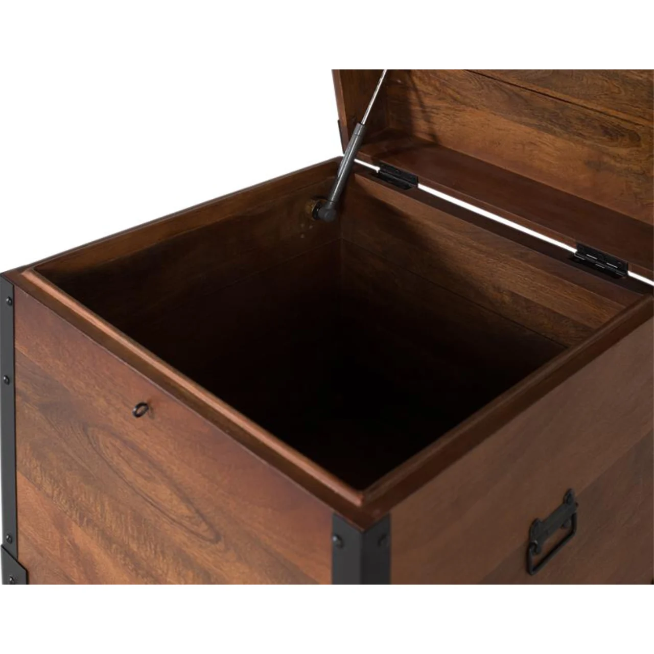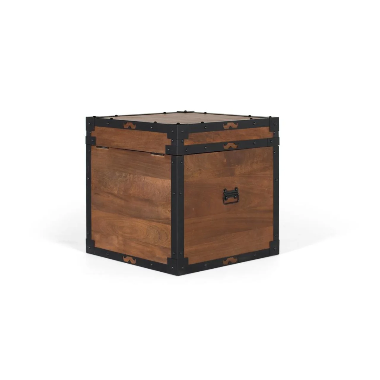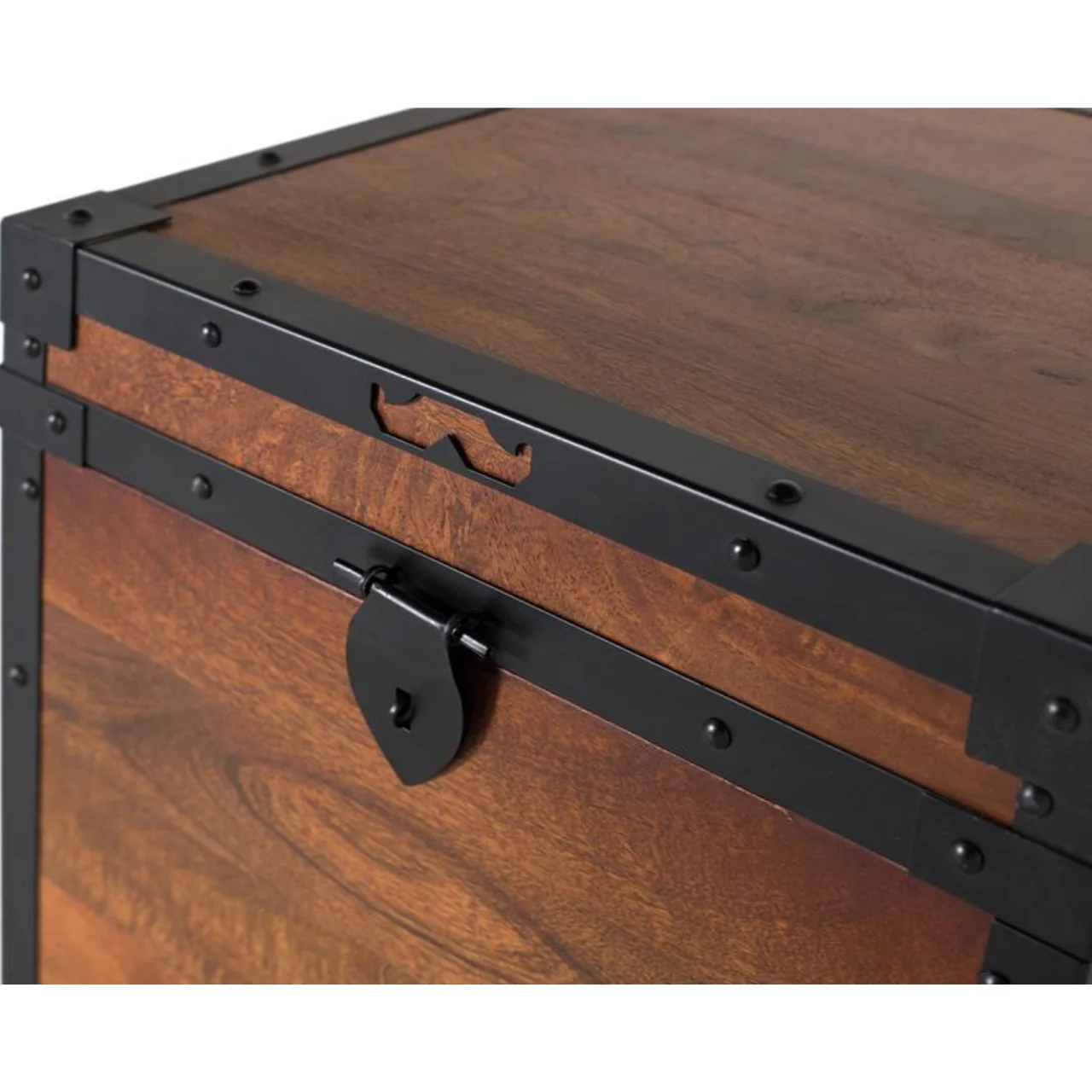 Fabricado en madera maciza de mango, este baúl combina resistencia y carácter. Sus herrajes de hierro negro recorren los bordes y esquinas, aportando un marcado estilo industrial vintage que destaca en cualquier estancia.