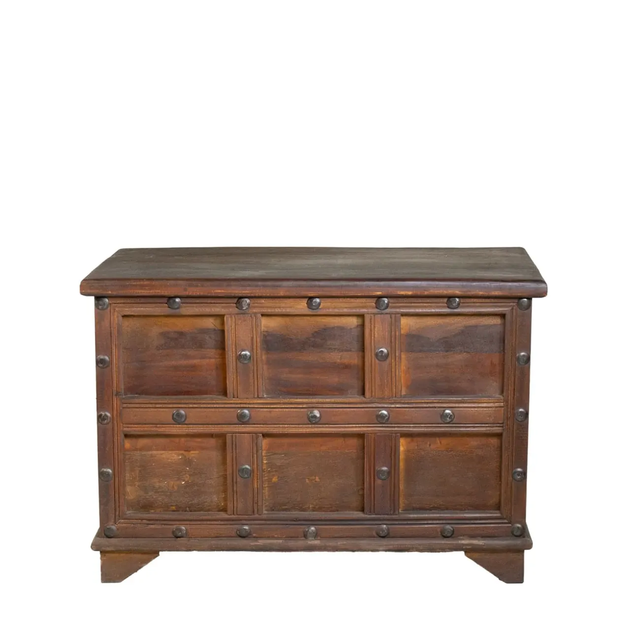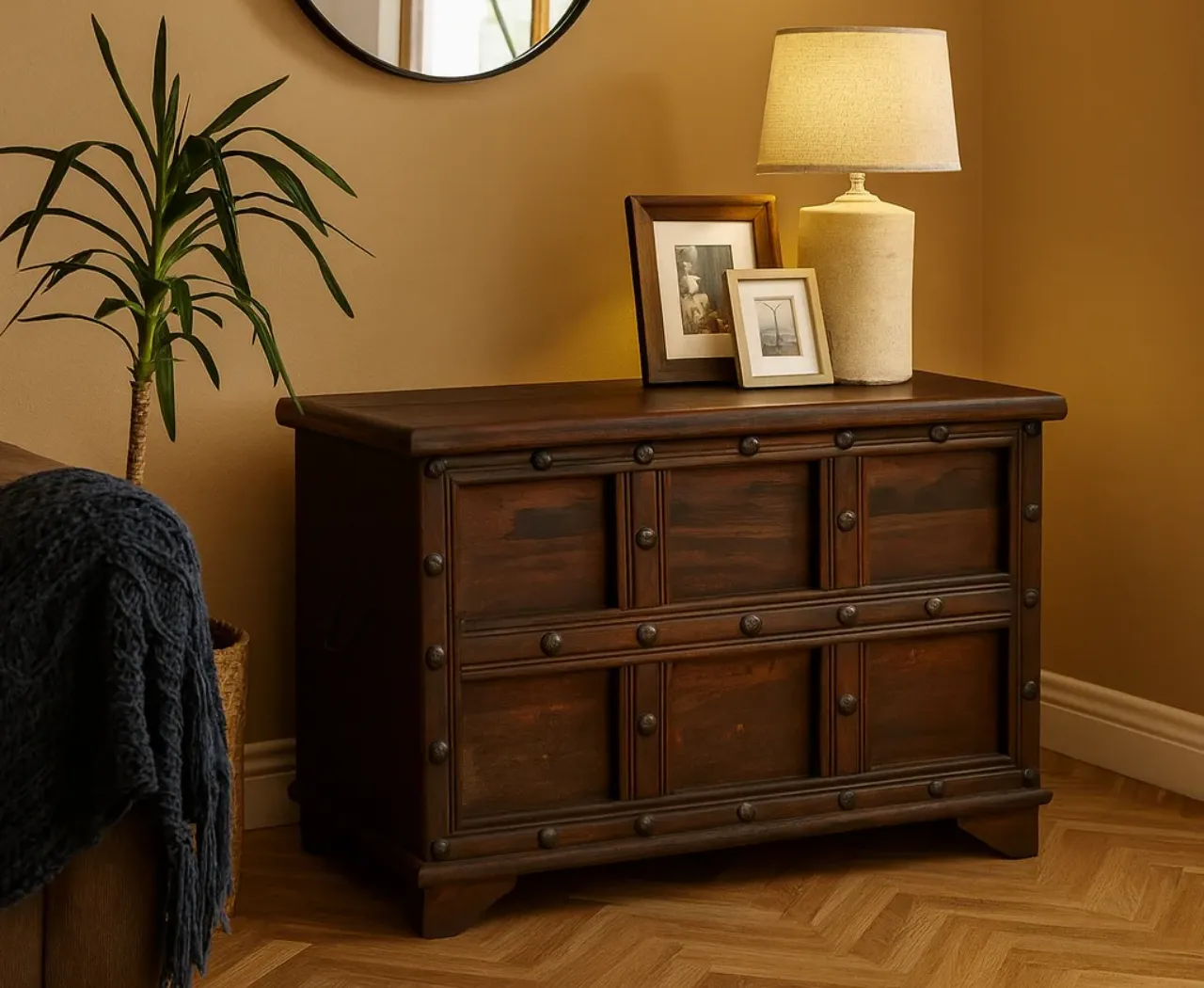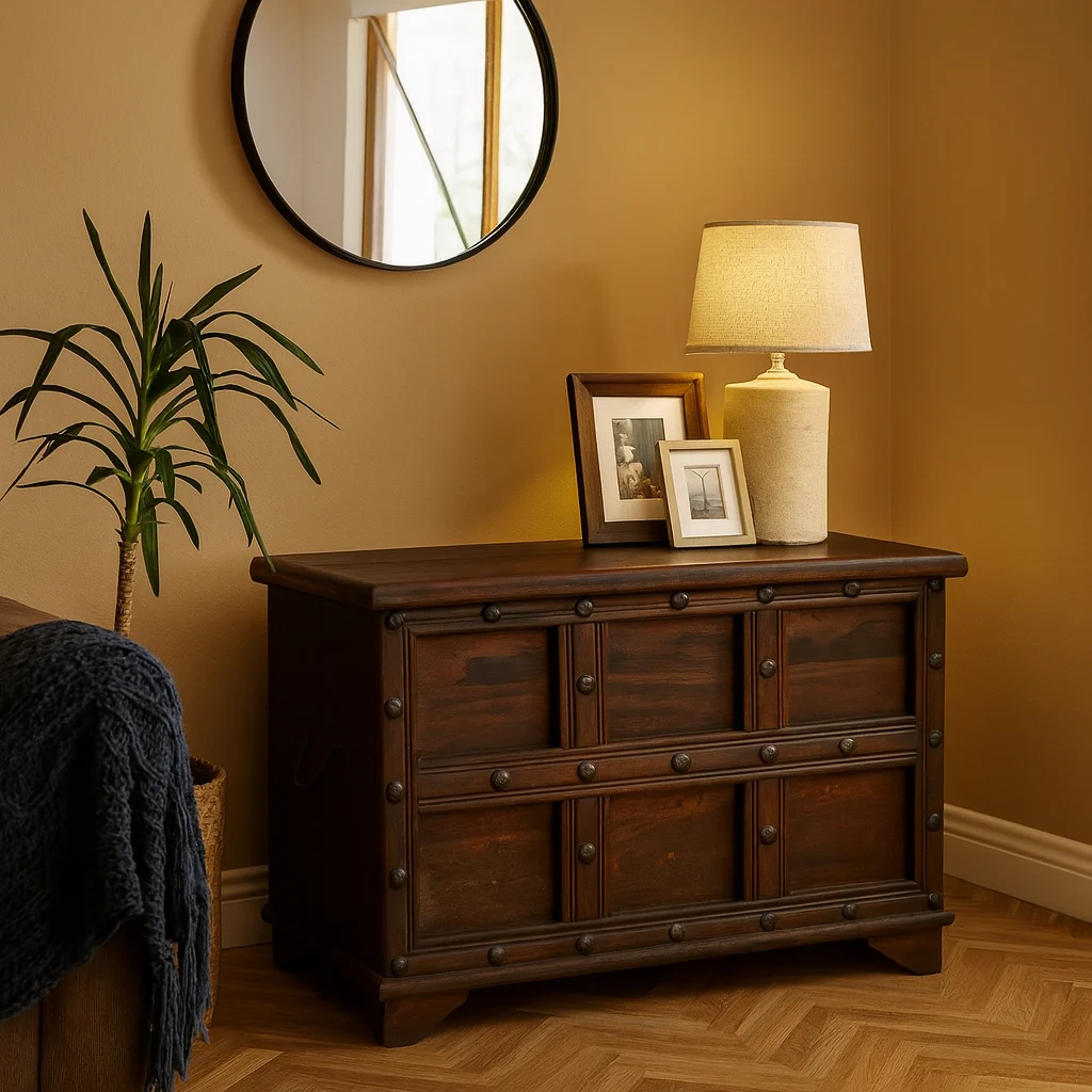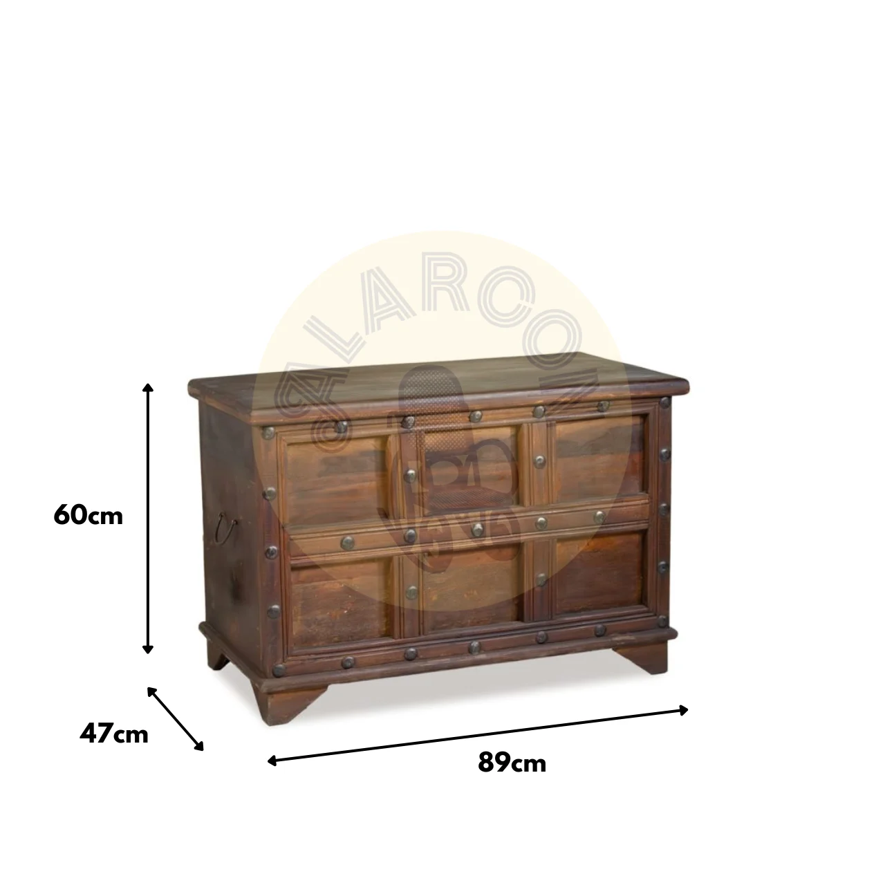 El baúl Alhambra está fabricado en madera reciclada y detalles en metal, ofreciendo una pieza única que combina resistencia, funcionalidad y un estilo artesanal lleno de carácter.