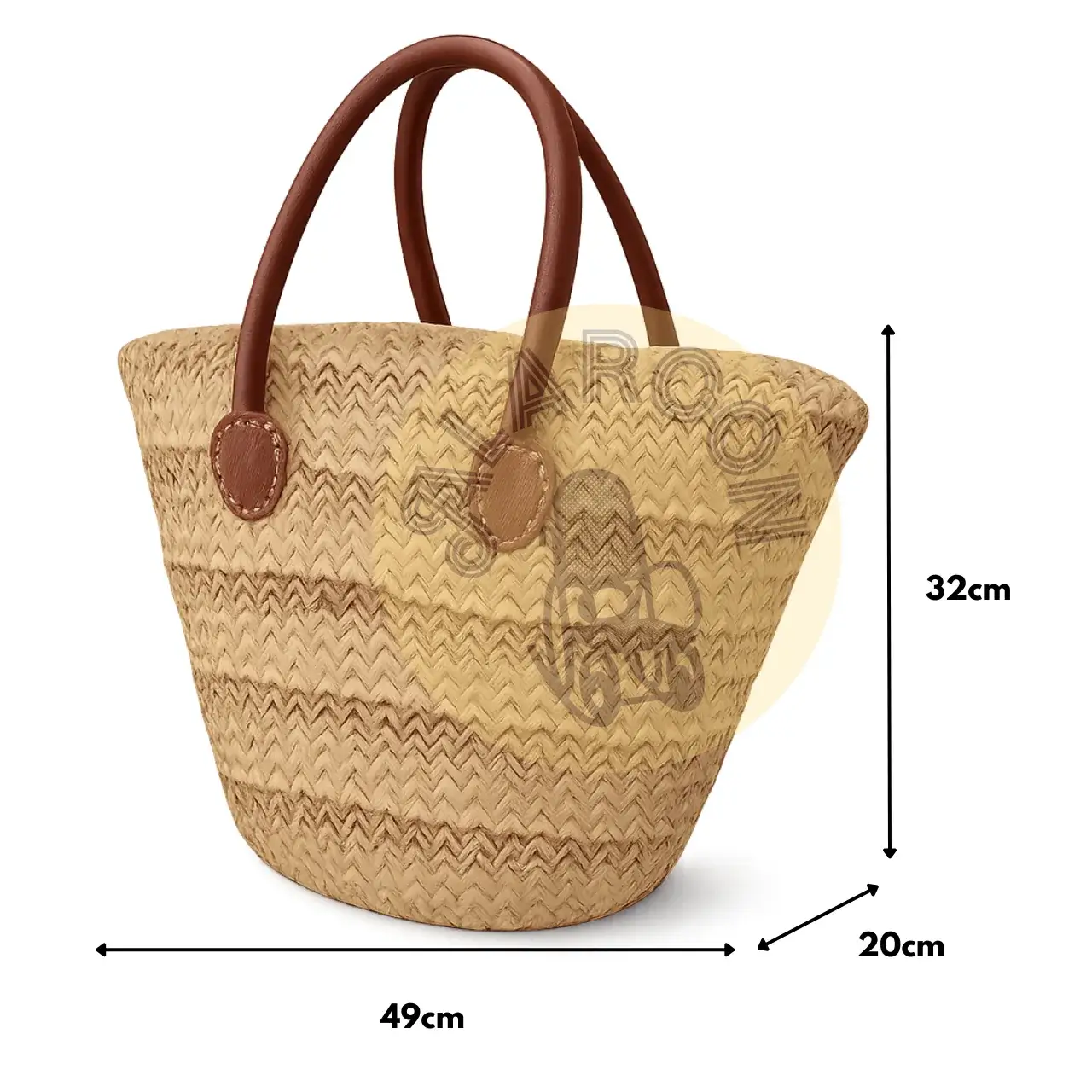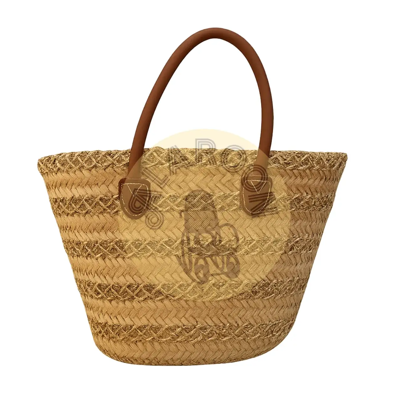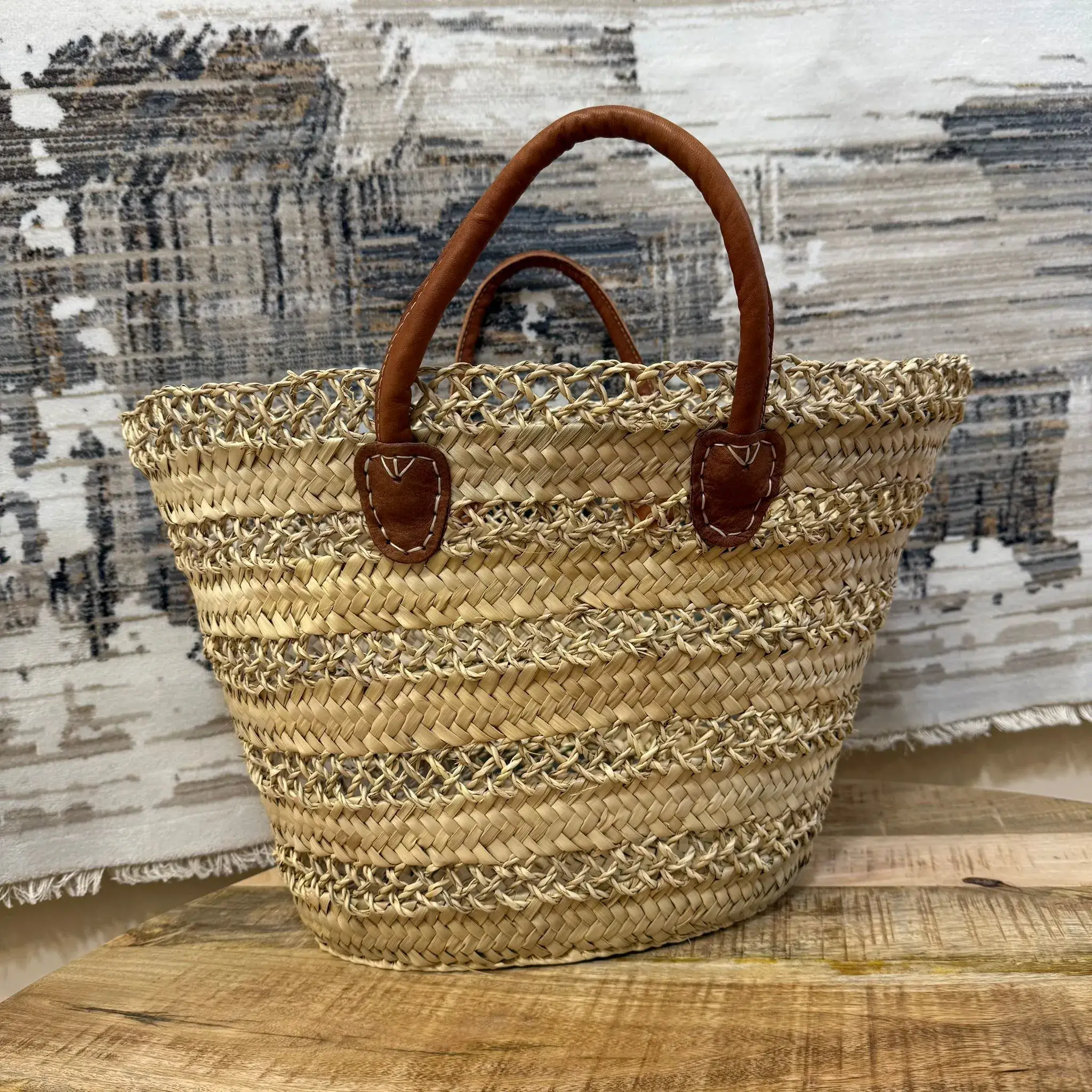 Las asas de cuero aportan firmeza y contraste visual, mientras los detalles trenzados realzan su carácter auténtico y decorativo. La textura combinada le otorga un aspecto orgánico y visualmente atractivo.
