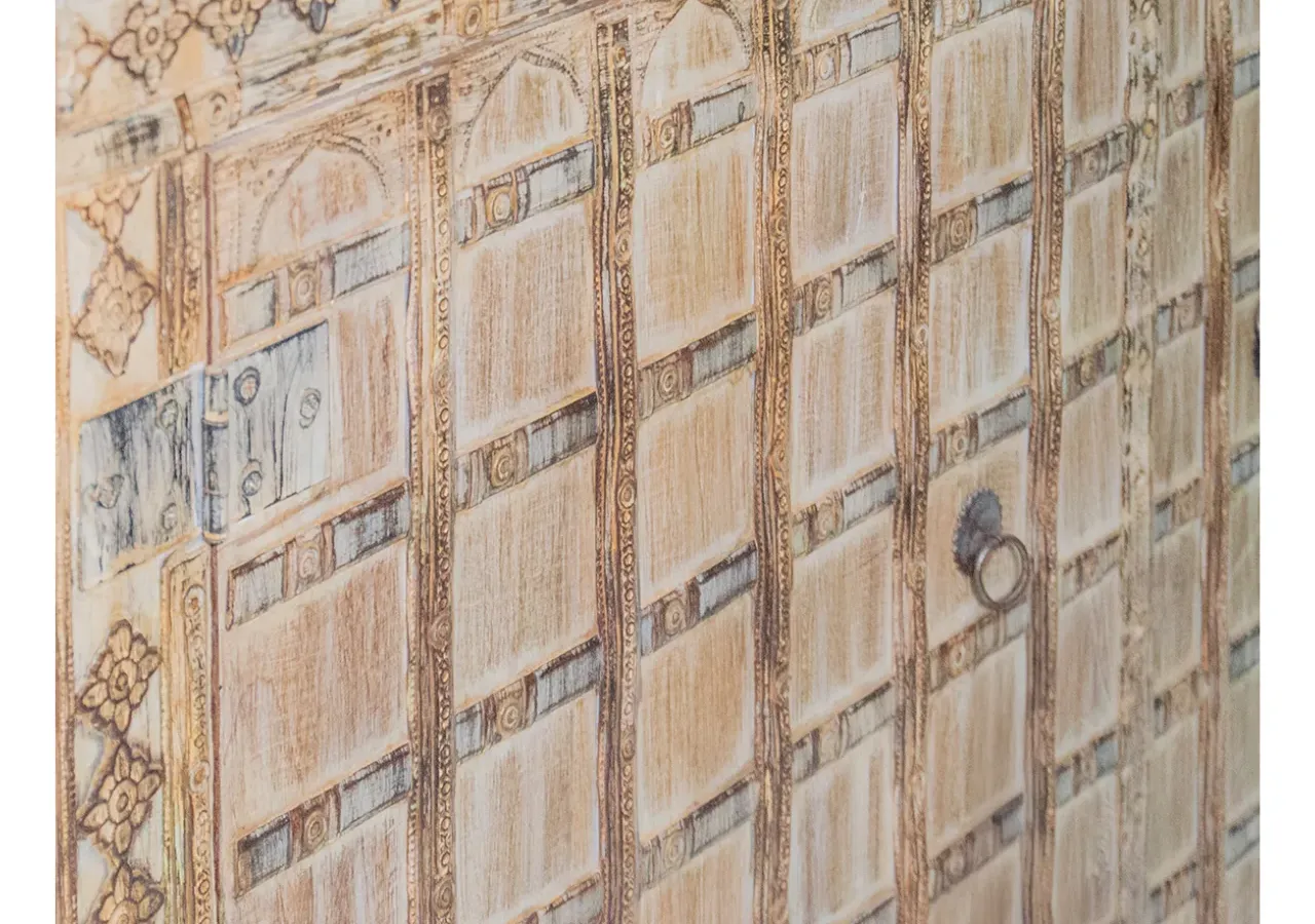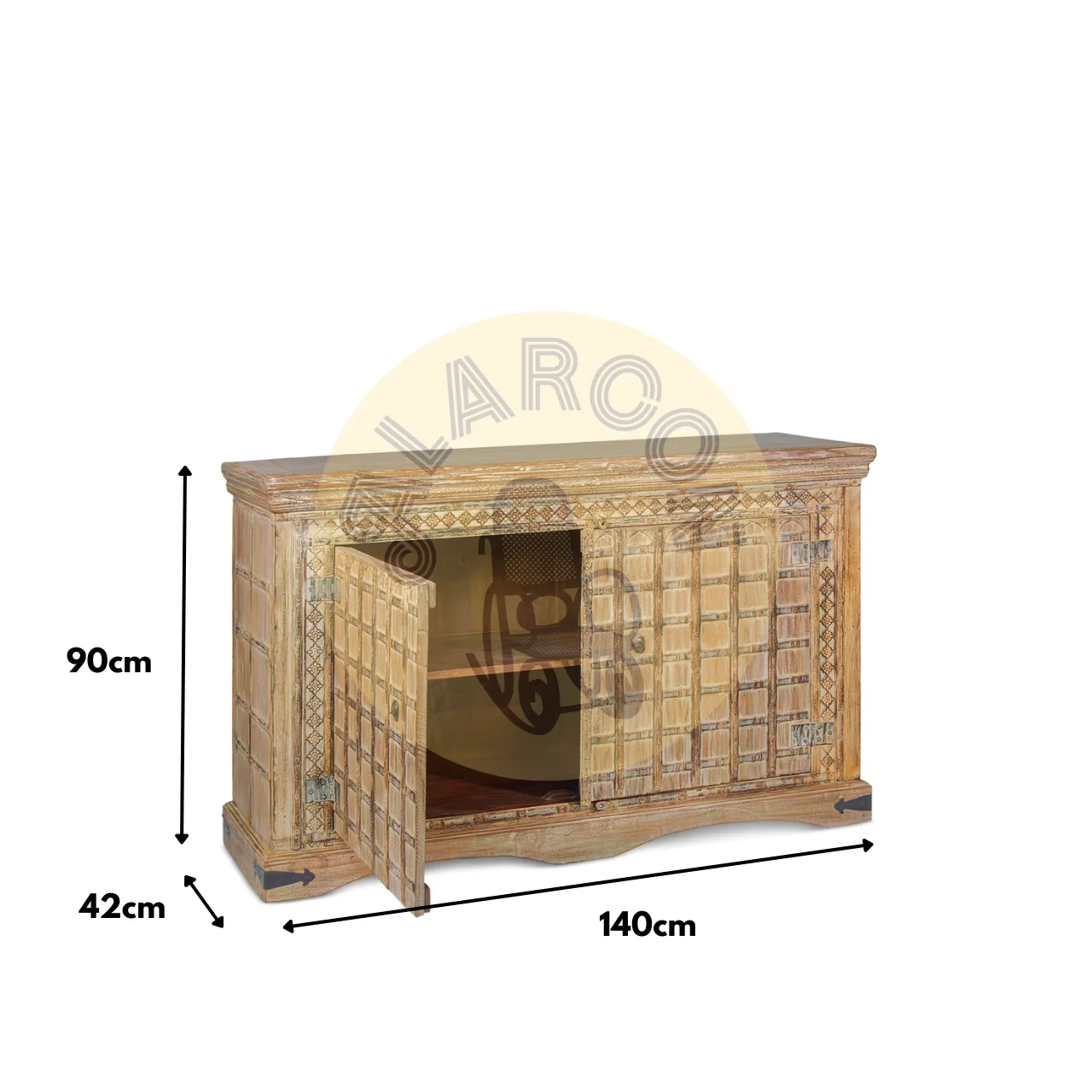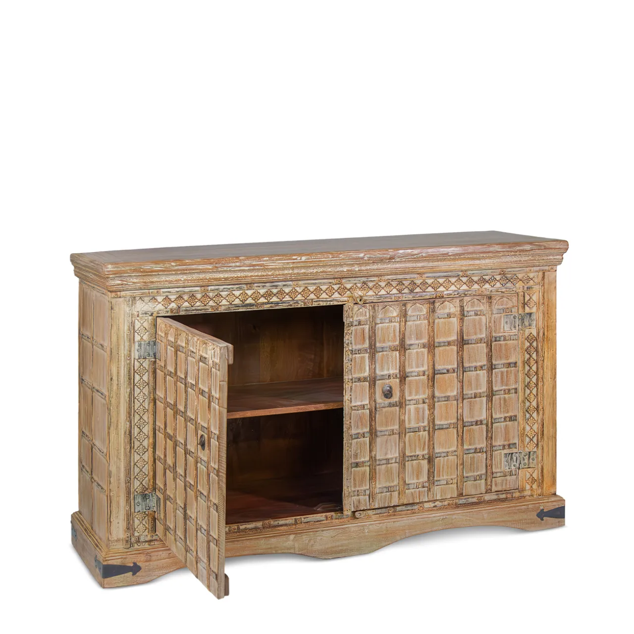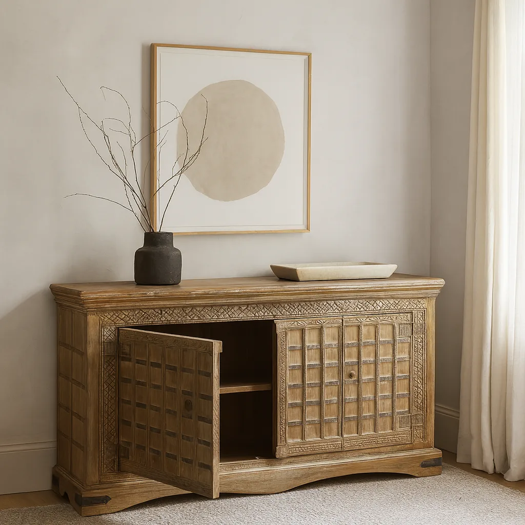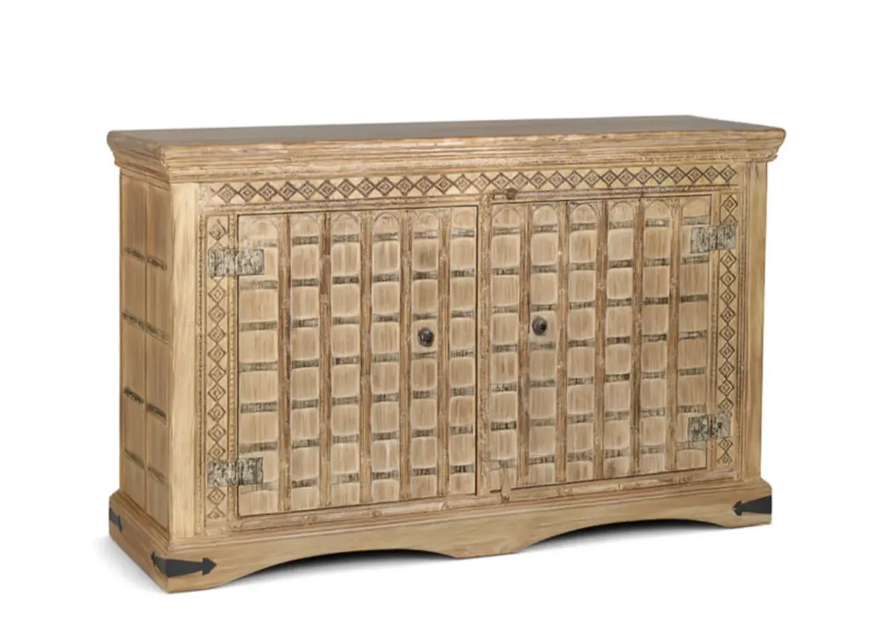 Este bufet de madera de acacia con detalles en hierro se caracteriza por su fabricación artesanal, ofreciendo una pieza resistente y con un diseño lleno de personalidad para el hogar.