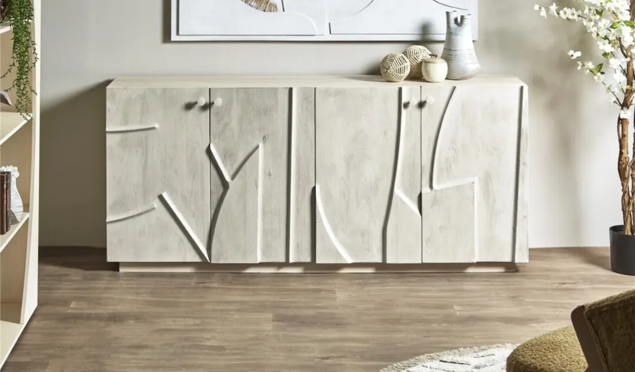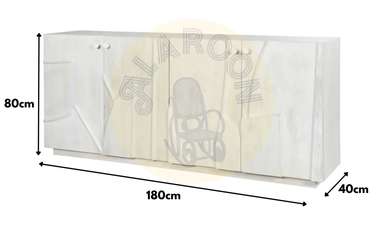 El buffet Musim está fabricado en madera de mango natural, destacando por su diseño robusto y acabado cálido que aporta elegancia y autenticidad a cualquier espacio. Su estilo versátil combina fácilmente con ambientes modernos o clásicos.