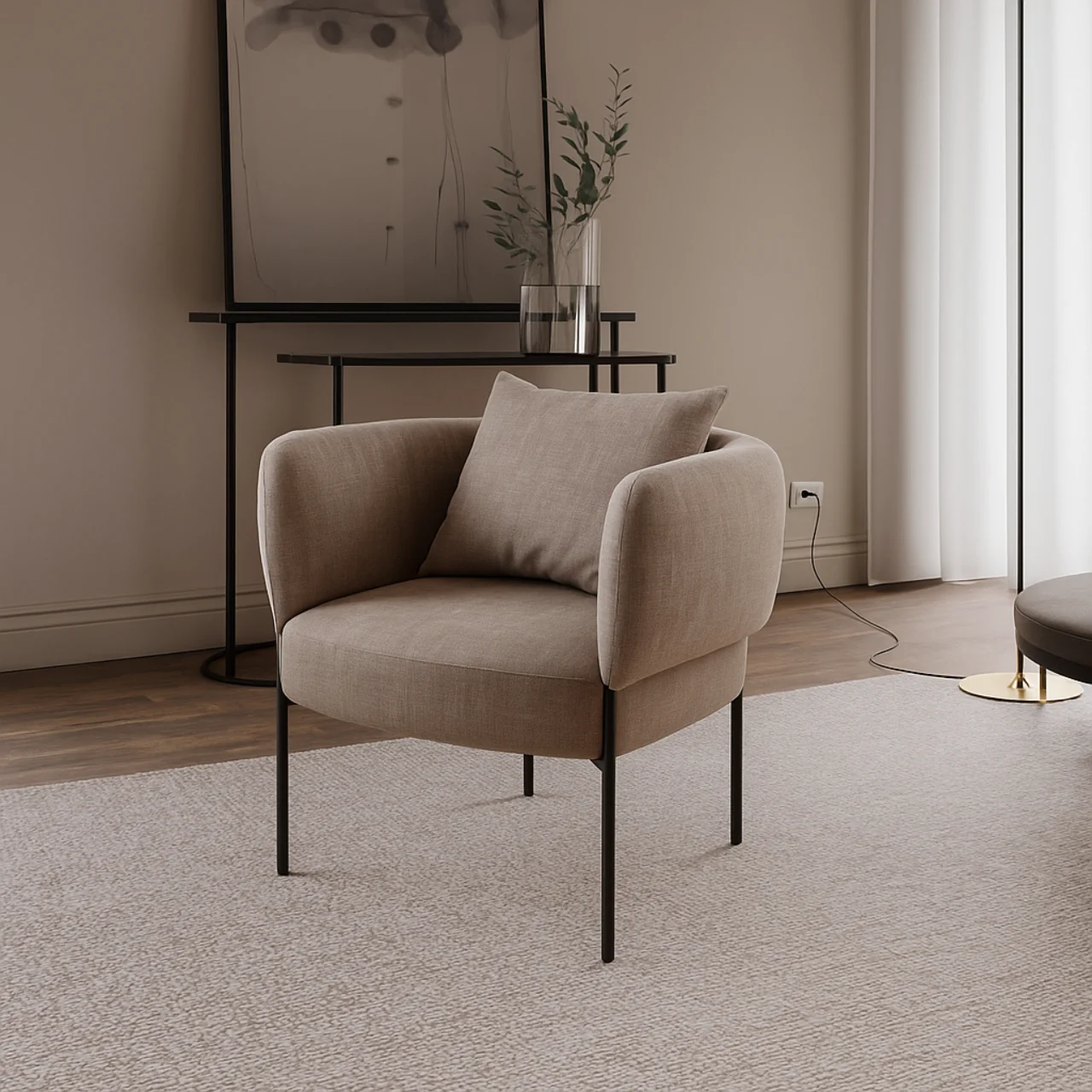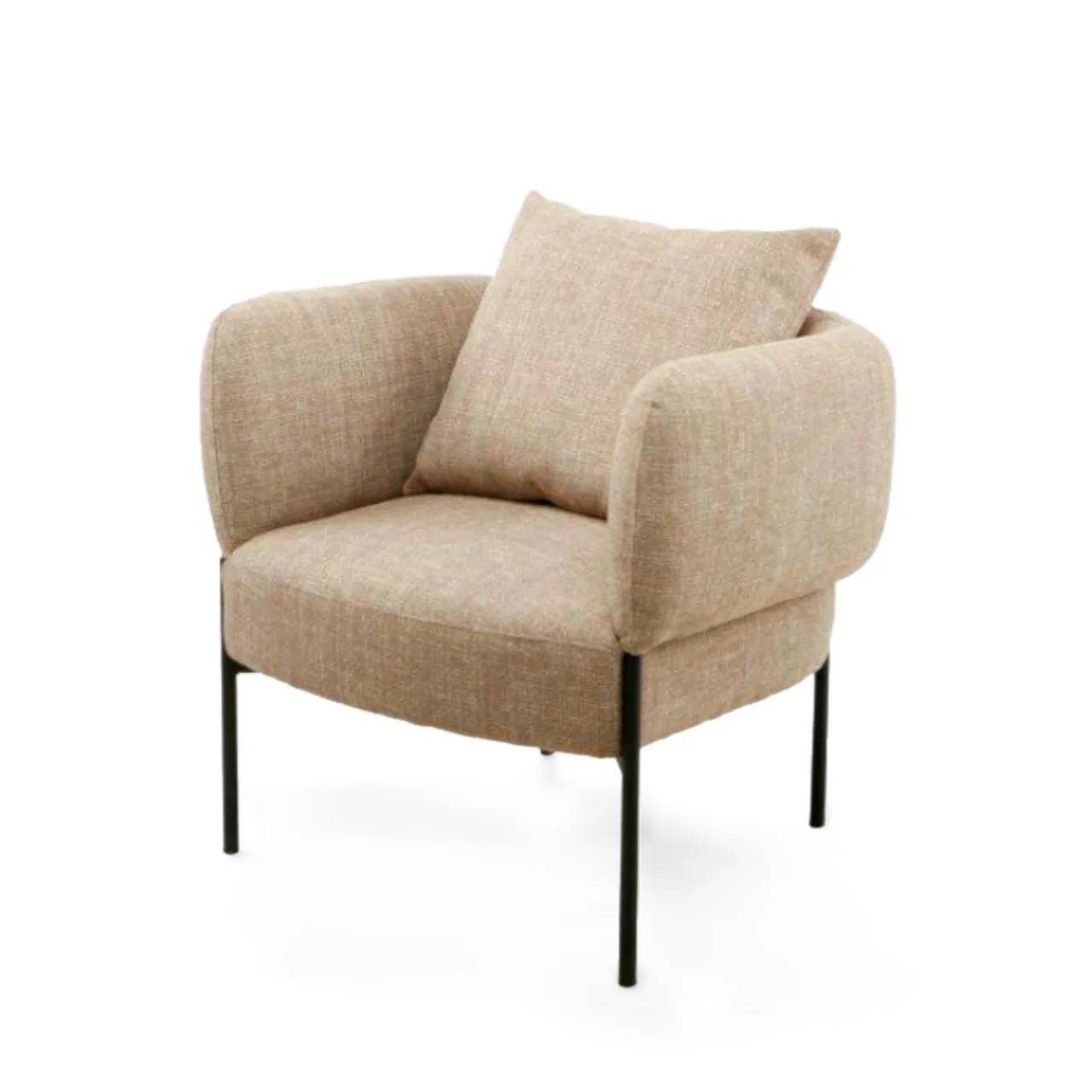 Las patas de metal negro aportan estabilidad, resistencia y un contraste elegante con el tapizado beige. Con capacidad para soportar hasta 120 kg, la butaca AGADIR combina estética, durabilidad y funcionalidad en una sola pieza.
