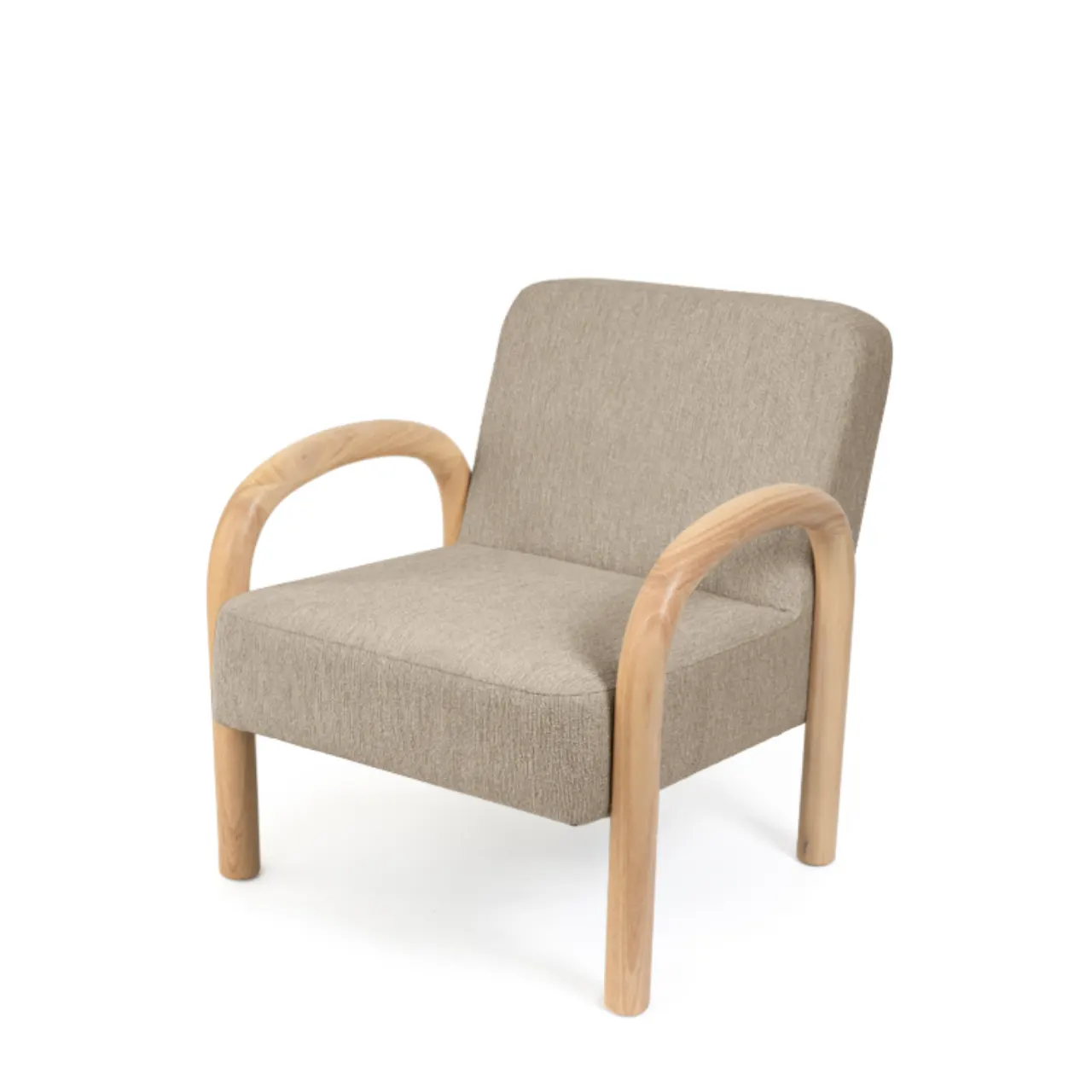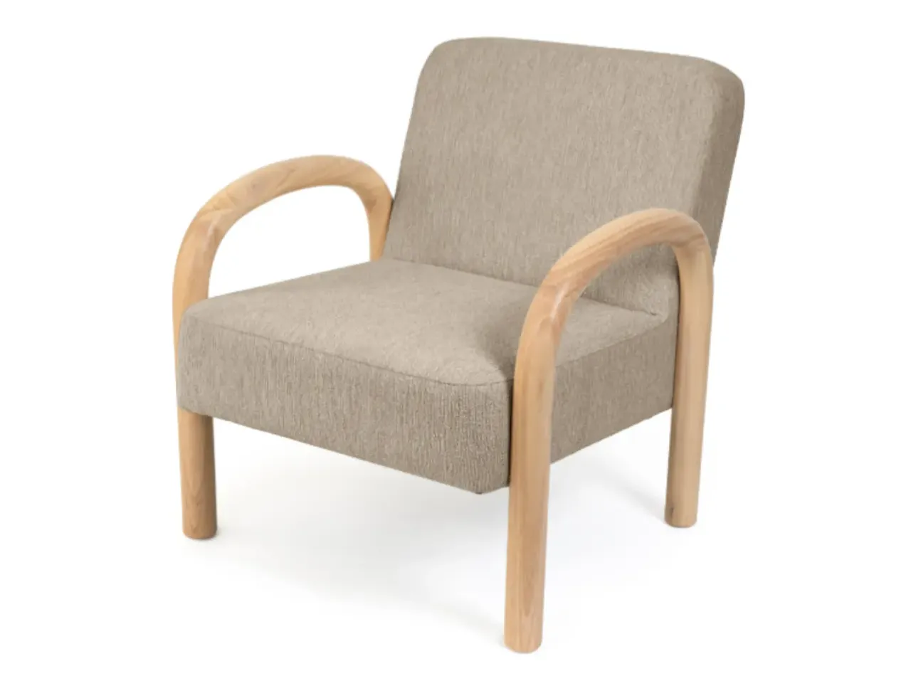La butaca DOROTHY en color beige destaca por su diseño envolvente y moderno, que añade un toque cálido y elegante a cualquier habitación. Sus patas redondeadas de madera de hevea natural, con un diámetro de 5,5 cm, no solo aportan solidez, sino también un aire orgánico que complementa espacios con estilo nórdico o japandi.
