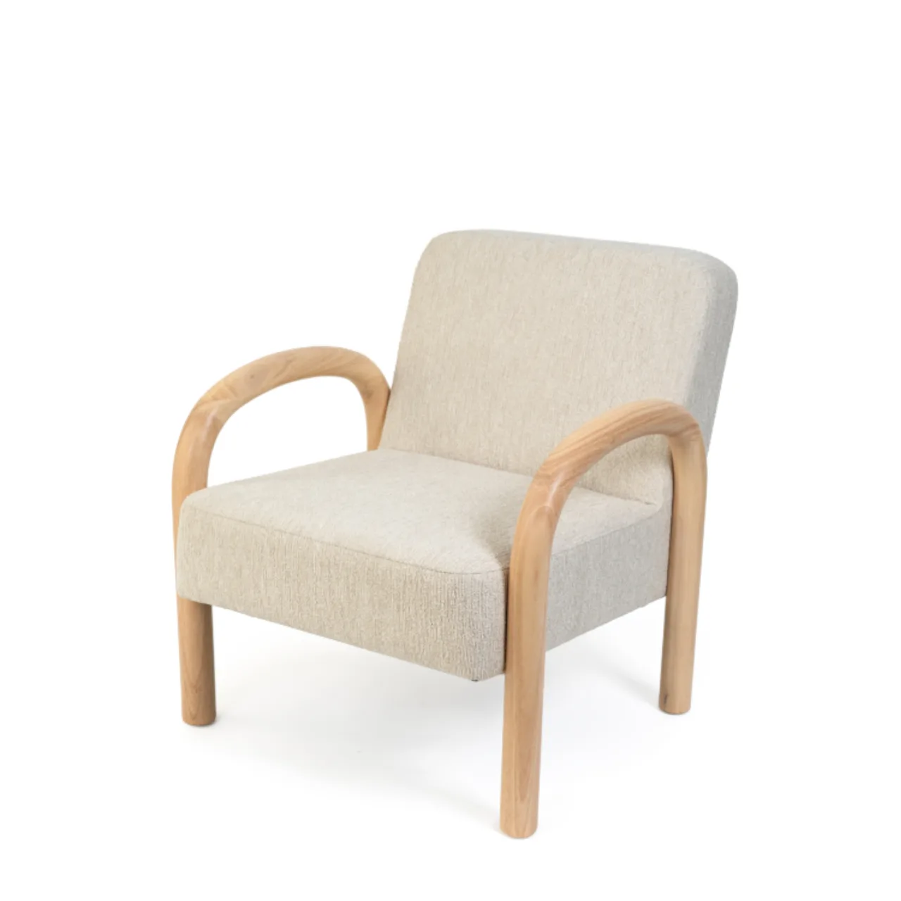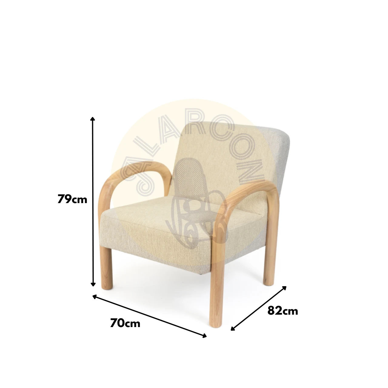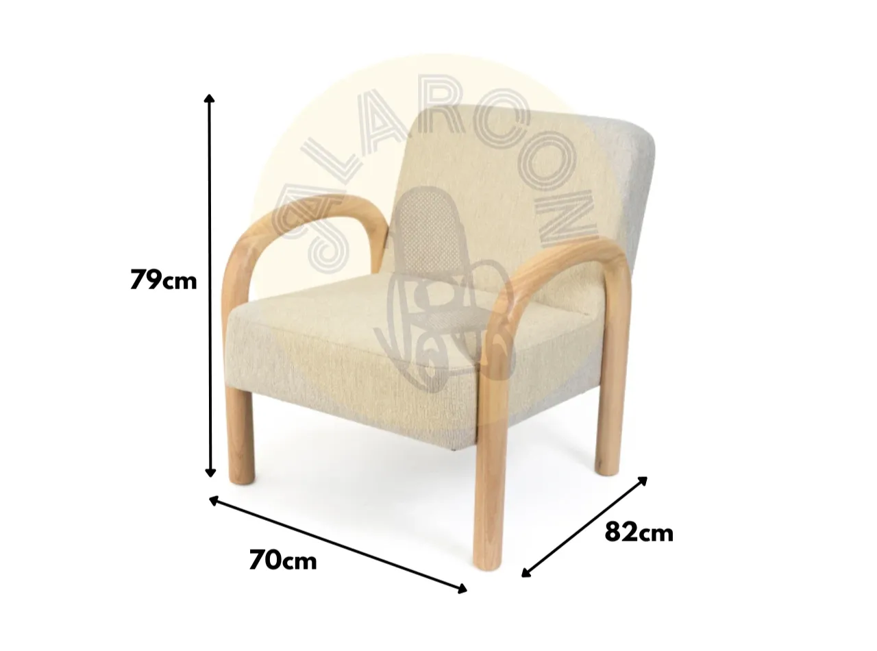 La butaca DOROTHY en color beige destaca por su diseño envolvente y moderno, que añade un toque cálido y elegante a cualquier habitación. Sus patas redondeadas de madera de hevea natural, con un diámetro de 5,5 cm, no solo aportan solidez, sino también un aire orgánico que complementa espacios con estilo nórdico o japandi.