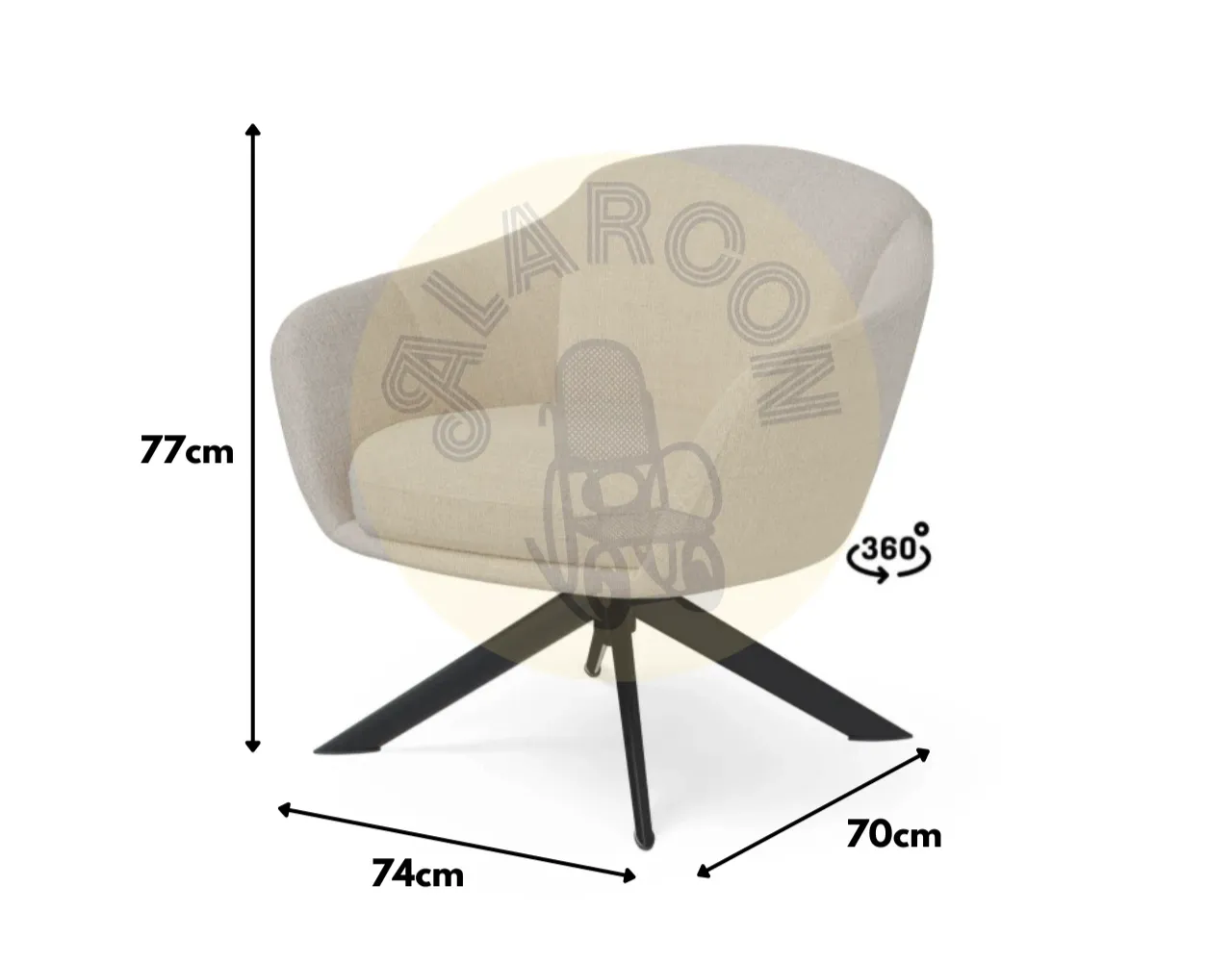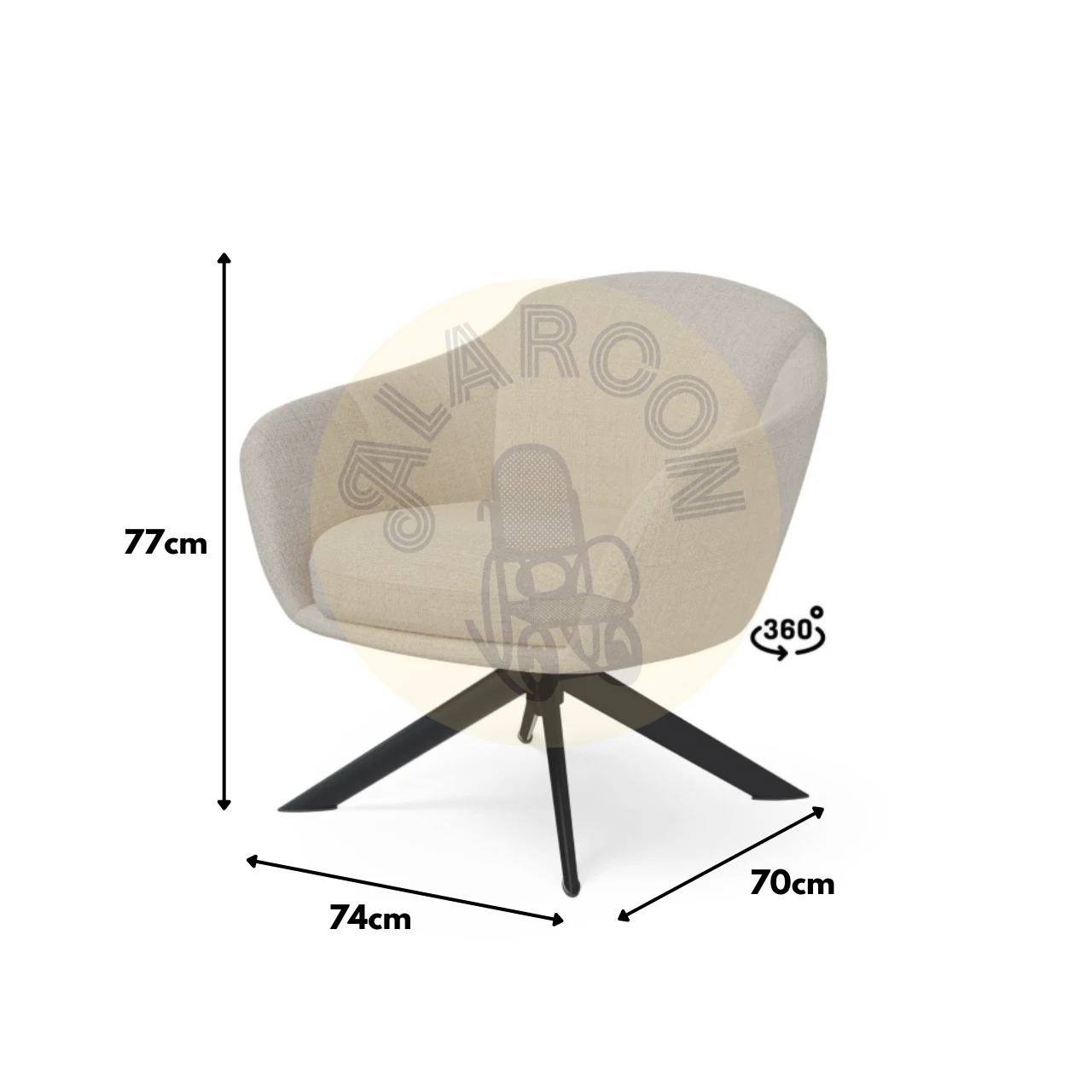 Con unas medidas de 74 cm de ancho, 77 cm de alto y 70 cm de fondo, esta butaca cuenta con un sistema giratorio de 360º que aporta libertad de movimiento y funcionalidad. Las líneas curvas del respaldo y los apoyabrazos amplios crean una silueta envolvente que favorece la comodidad.