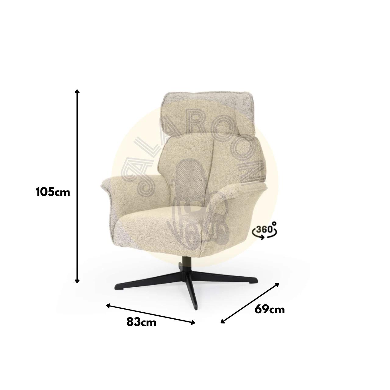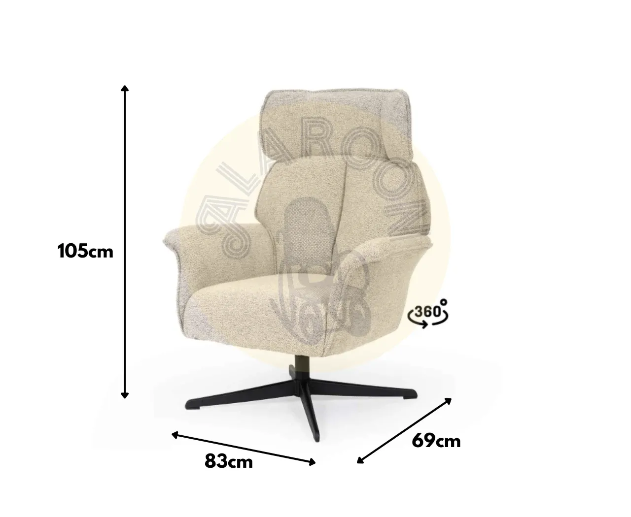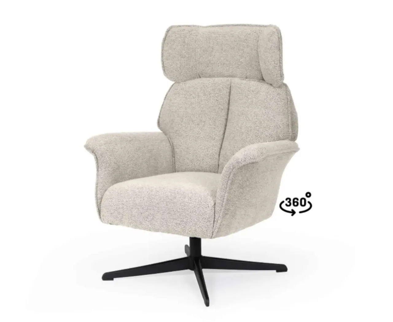 Tapizada en tejido de textura suave, disponible en tonos beige, gris y taupe, se integra fácilmente en interiores modernos, clásicos o nórdicos. La base metálica negra, robusta y estilizada, incorpora un mecanismo giratorio de 360°, aportando funcionalidad sin perder estética.