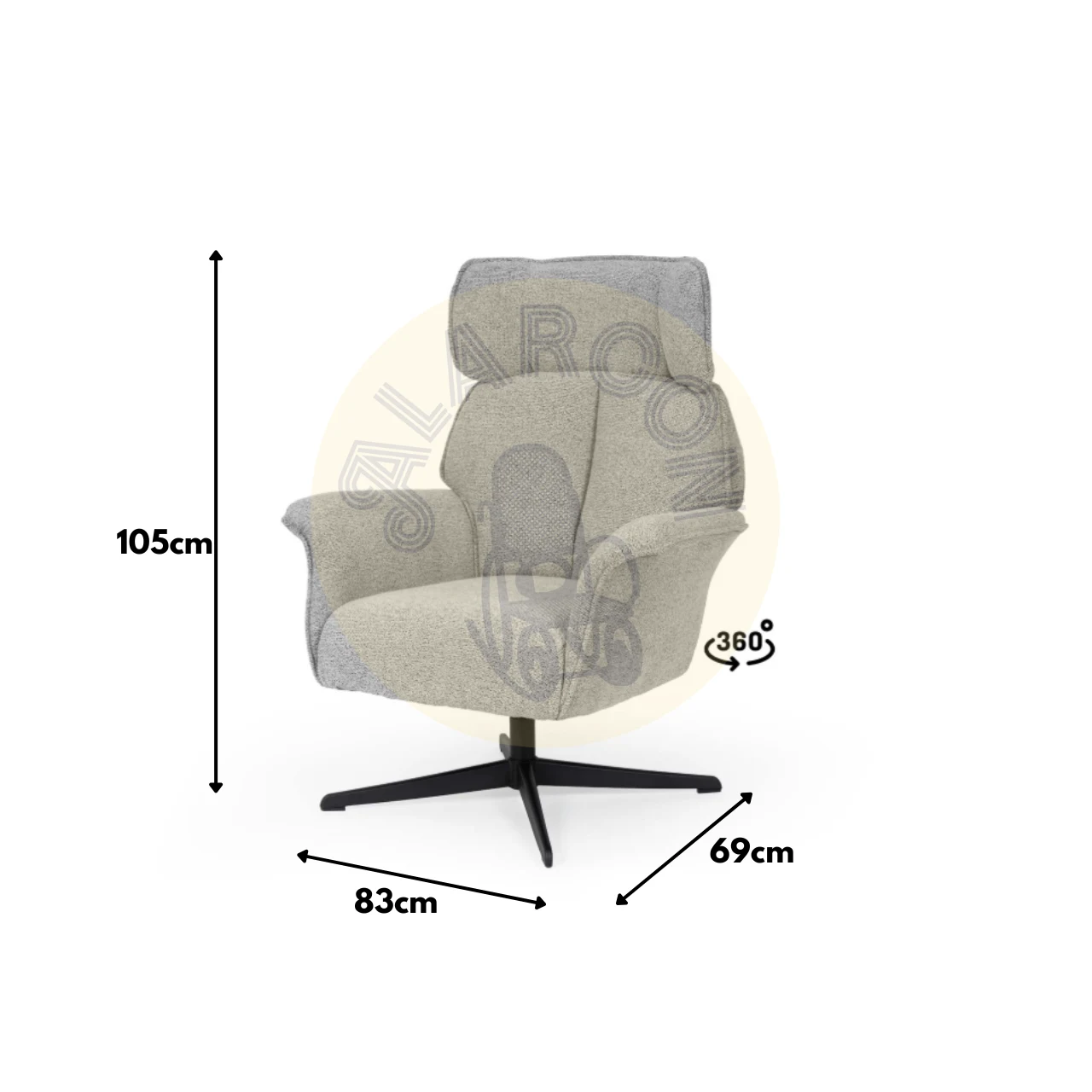 Tapizada en tejido de textura suave, disponible en tonos beige, gris y taupe, se integra fácilmente en interiores modernos, clásicos o nórdicos. La base metálica negra, robusta y estilizada, incorpora un mecanismo giratorio de 360°, aportando funcionalidad sin perder estética.