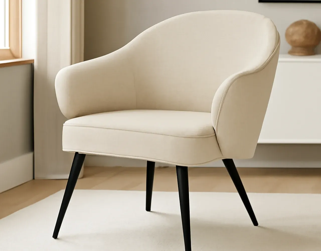 La butaca MACAO en beige  se caracteriza por su diseño curvilíneo y envolvente, perfecto para añadir un toque moderno y acogedor a cualquier espacio. Su estética contemporánea se adapta fácilmente a salones, dormitorios o áreas de descanso, aportando una sensación de elegancia y confort.