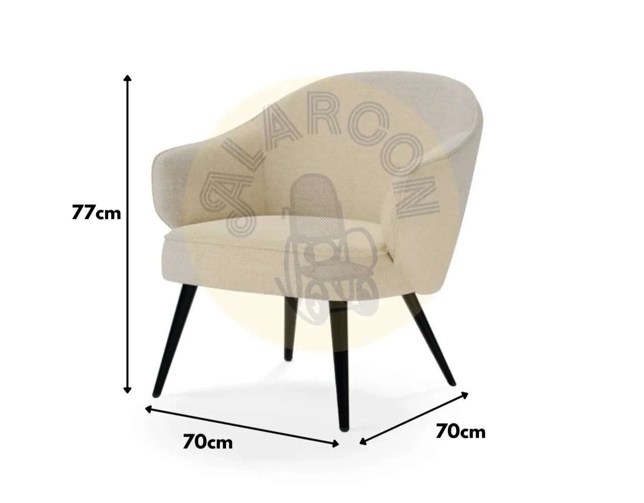 Con unas medidas de 70 cm de ancho, 77 cm de alto y 70 cm de fondo, esta butaca se adapta perfectamente a cualquier ambiente. Sus patas metálicas negras ofrecen estabilidad y contrastan de manera sofisticada con el diseño general, completando una pieza de gran estilo y funcionalidad.