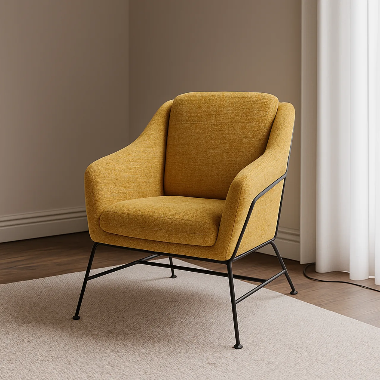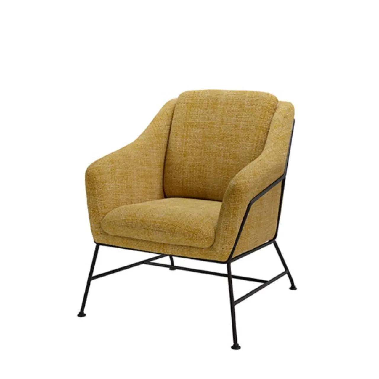 Patas de metal negro resistentes, aportando estabilidad y un contraste moderno con el tapizado Mostaza.