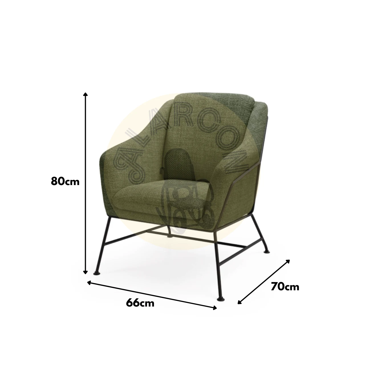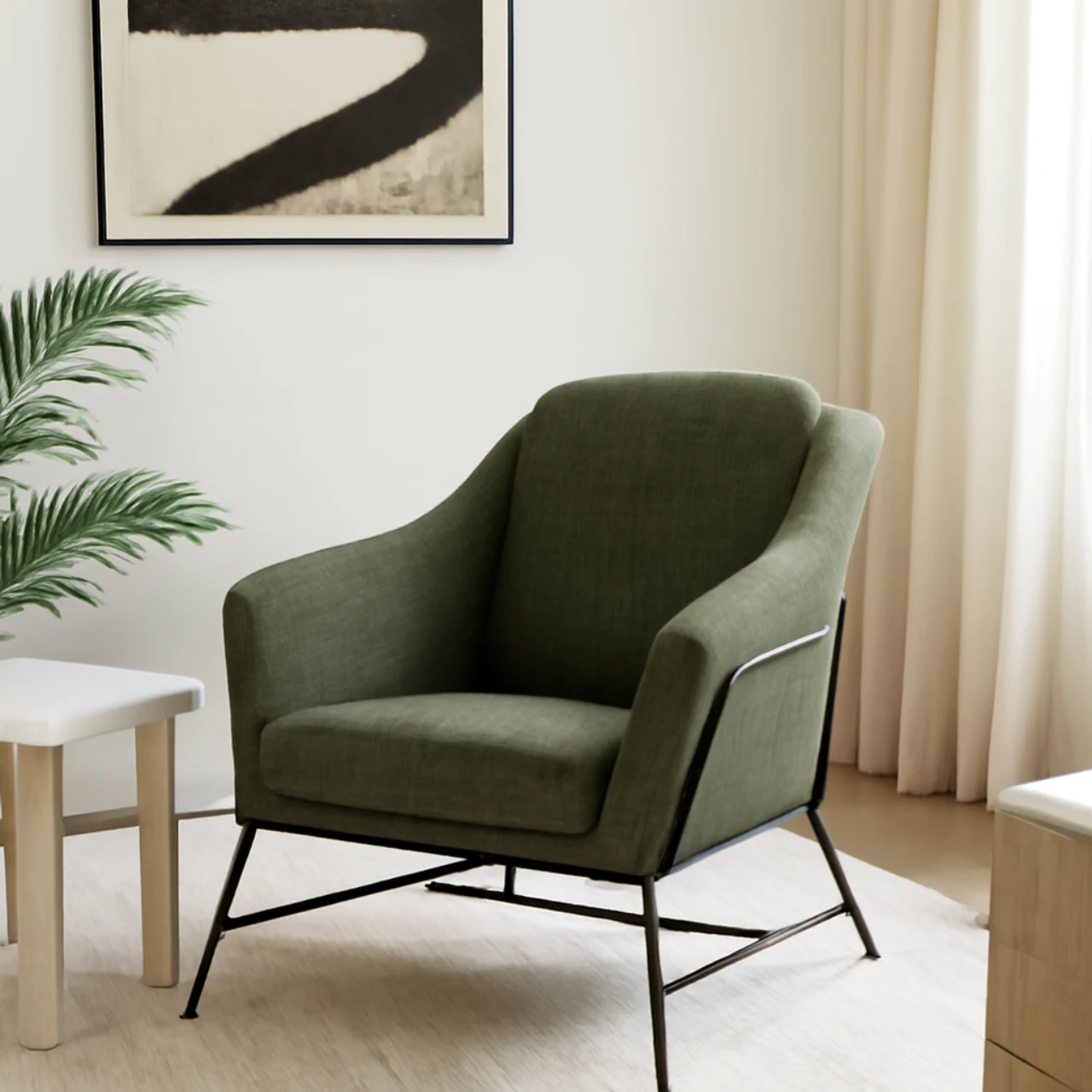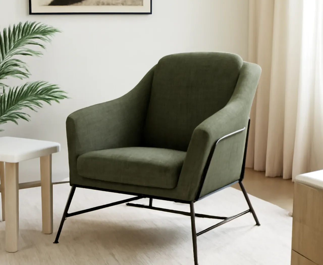 Las patas de metal negro, resistentes y estilizadas, generan un contraste moderno con el tapizado en Verde, creando una pieza con personalidad. Su estructura metálica trasera añade un toque contemporáneo, convirtiéndola en un elemento decorativo distintivo en cualquier estancia.