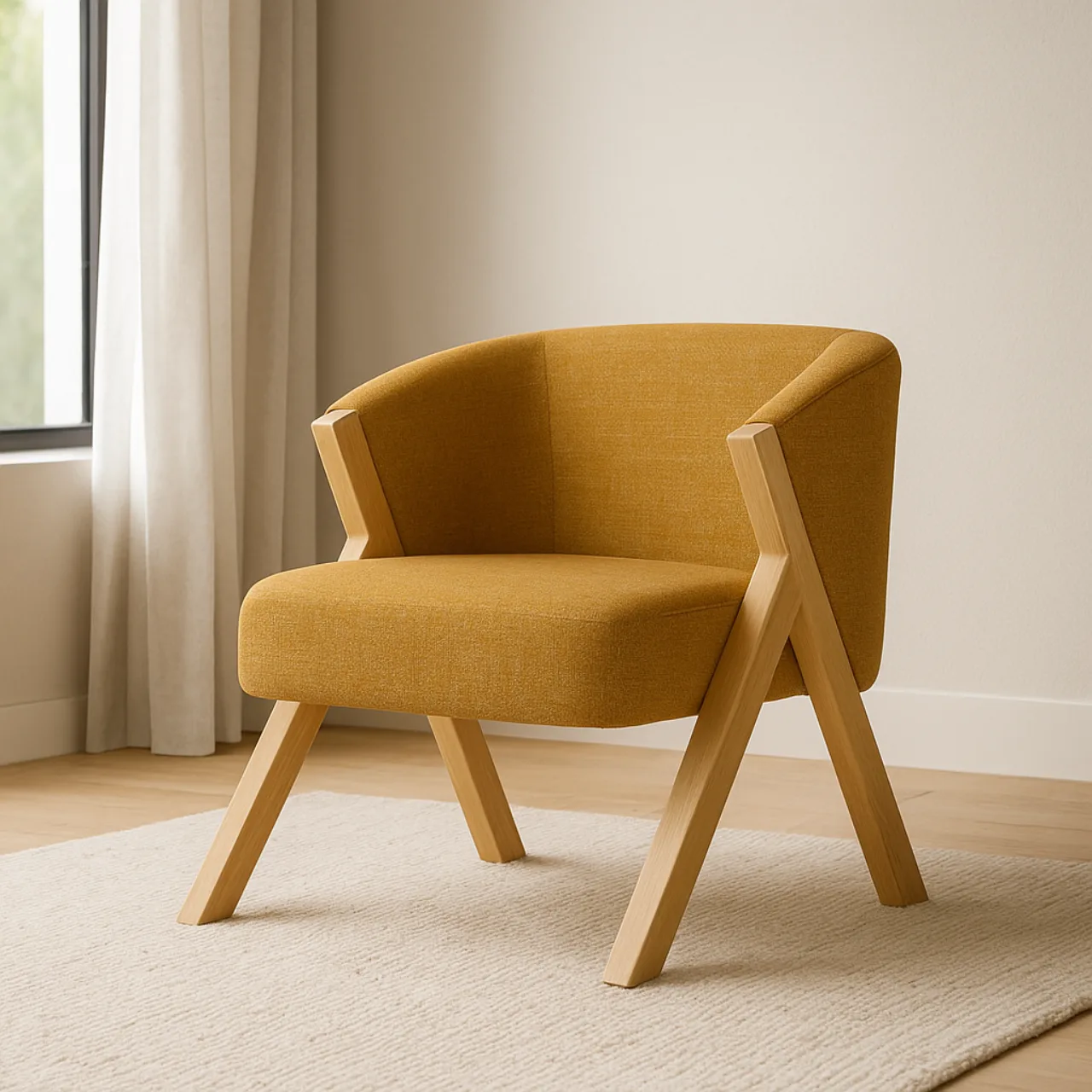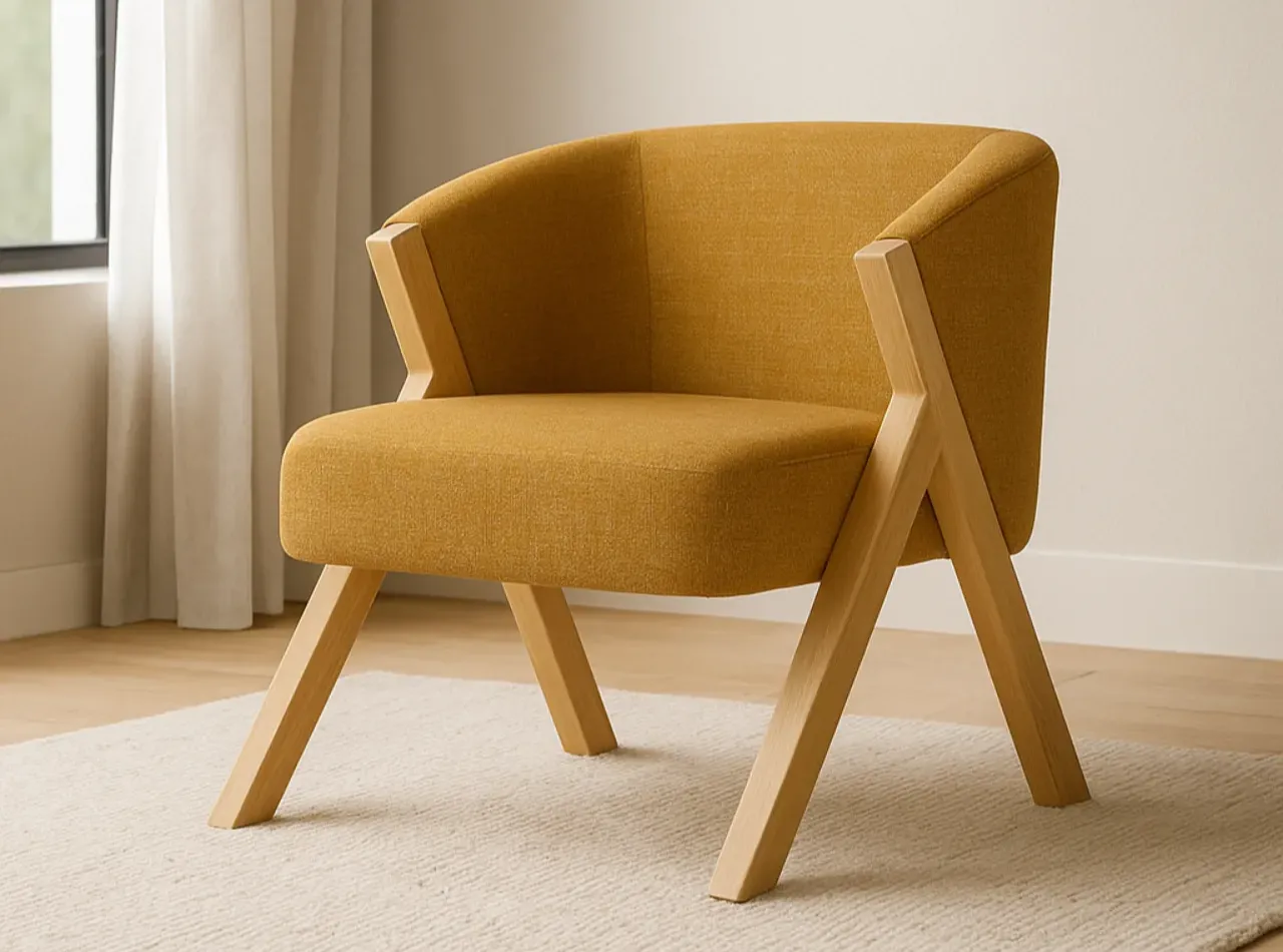 La butaca SINTRA en color mostaza destaca por su diseño envolvente y elegante, siendo la opción ideal para quienes buscan una pieza de estilo y comodidad. Su estructura de patas de madera le confiere un toque sofisticado, mientras que el asiento de tejido CHANEL/MOSTAZA asegura una sensación de confort en todo momento.