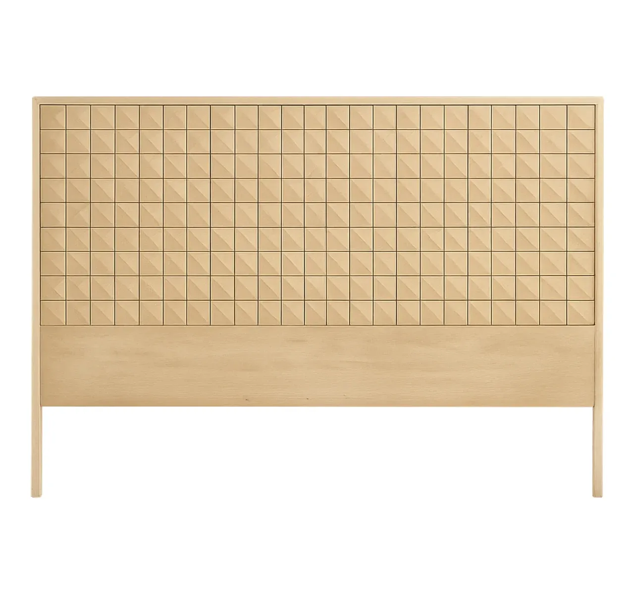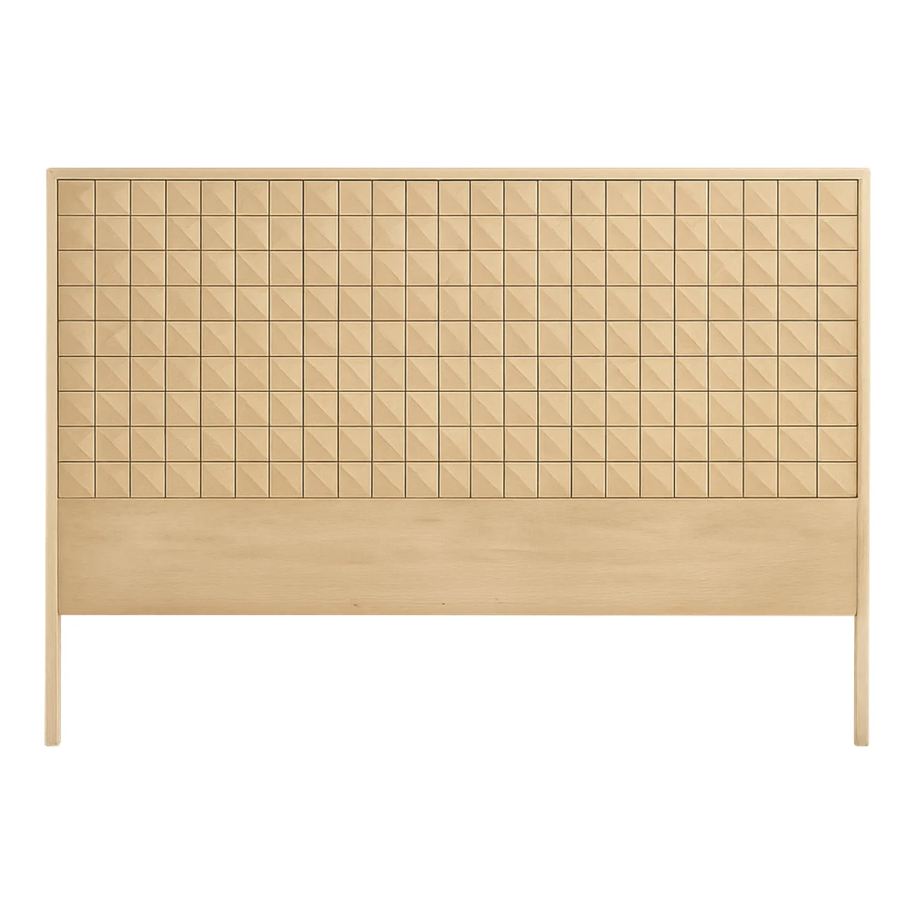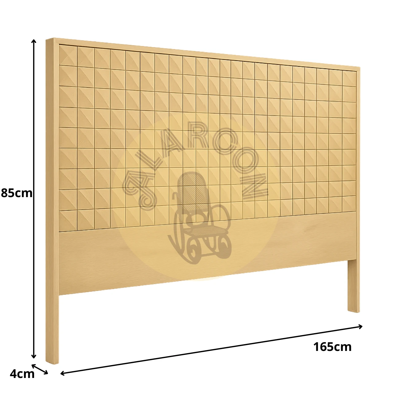 Fabricado en madera maciza de mango, este cabecero de 165 cm destaca por su diseño geométrico en relieve que aporta un efecto tridimensional único. Su acabado natural resalta las vetas y matices cálidos de la madera, creando una pieza con carácter y personalidad.
