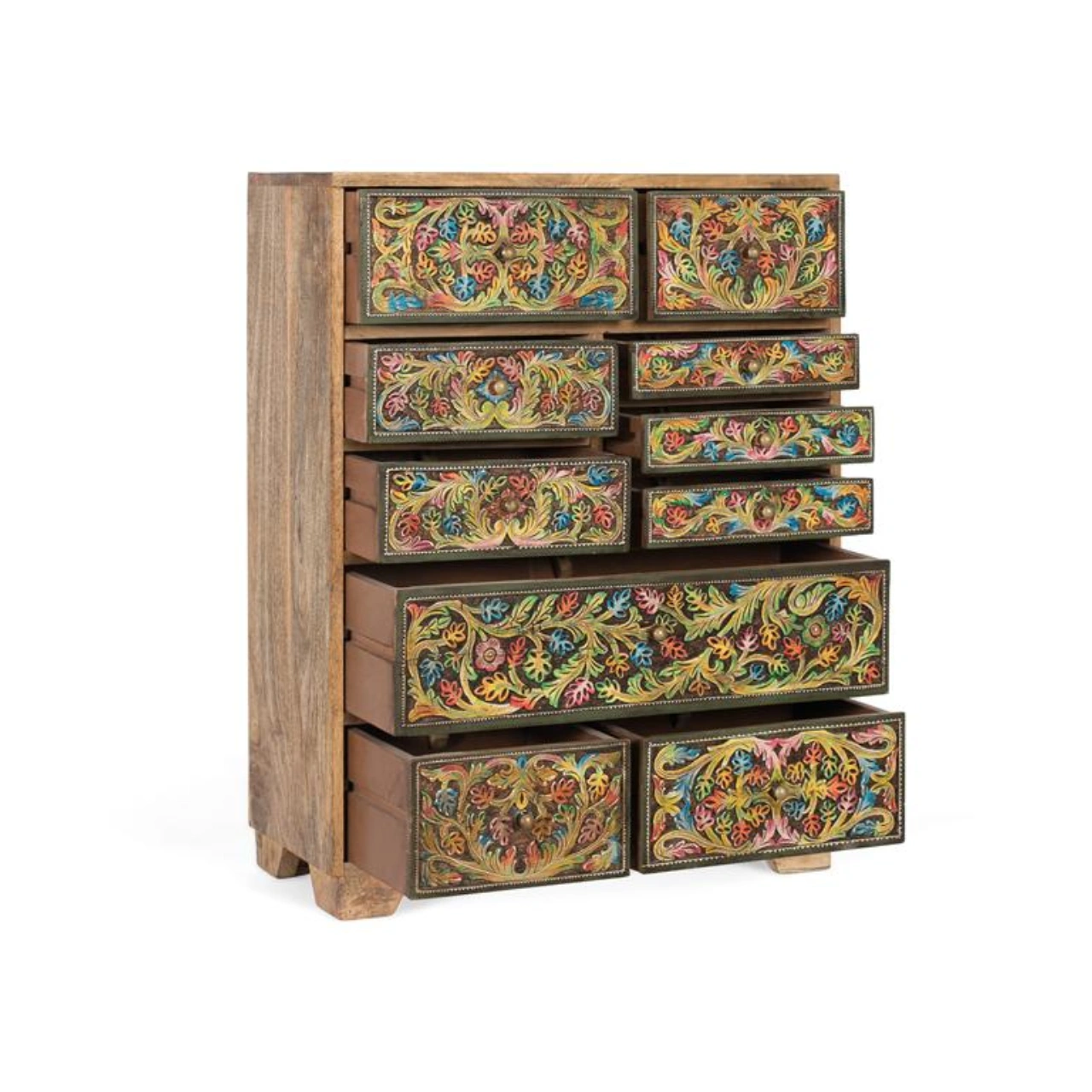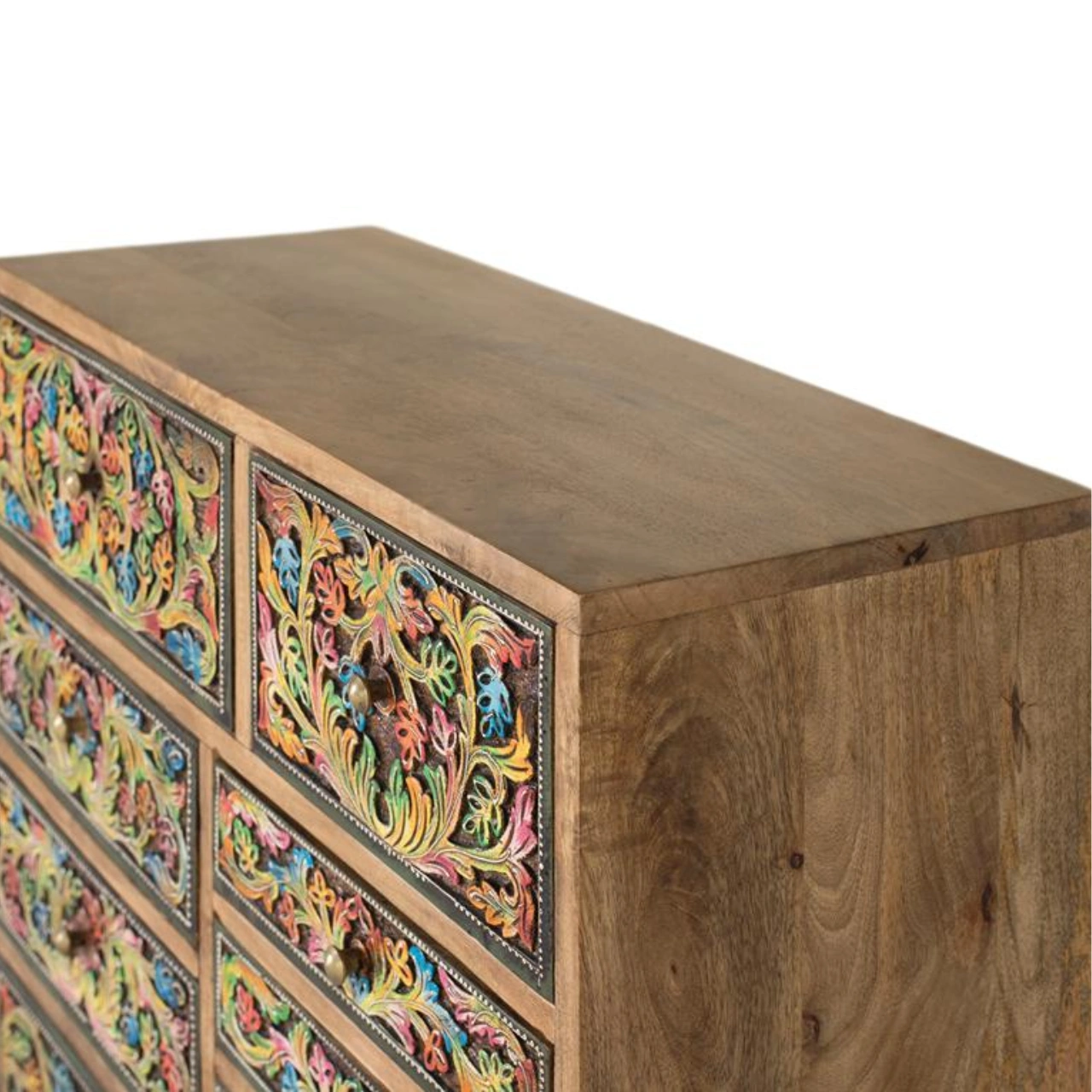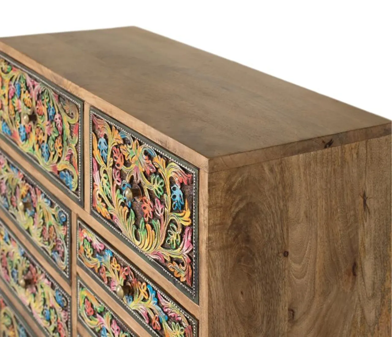 Añade personalidad y funcionalidad a tu hogar con esta cómoda de madera de mango en color natural, una pieza de estilo étnico que destaca por sus frontales pintados a mano con motivos florales multicolor. Su diseño artesanal realza las vetas y detalles naturales de la madera, creando un mueble único que aporta carácter y autenticidad a cualquier espacio interior.