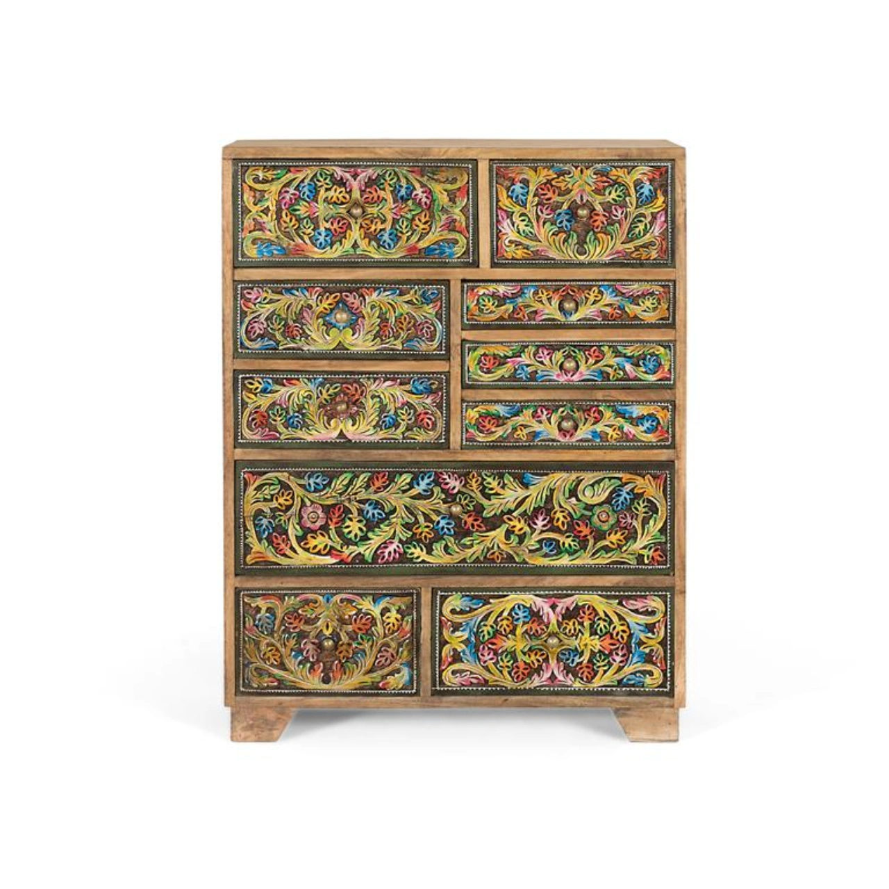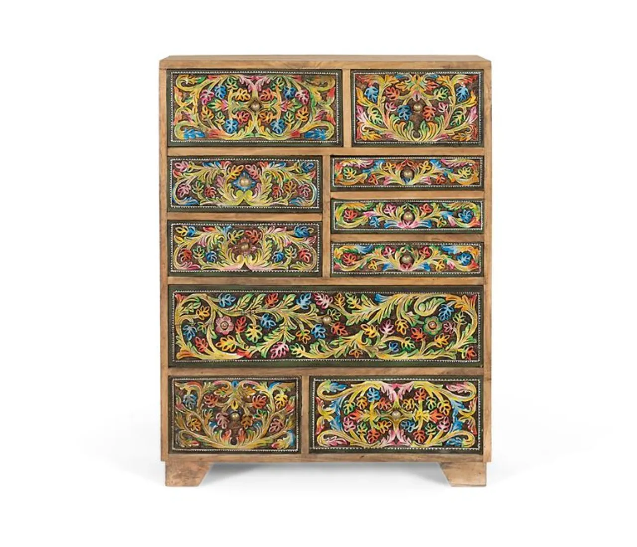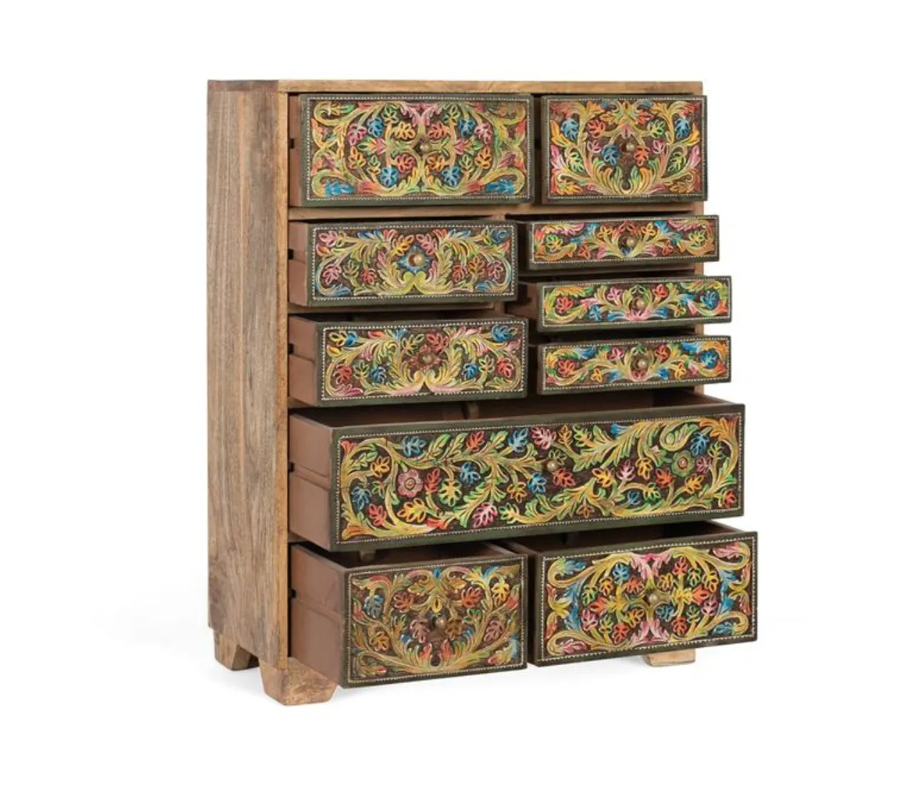 Añade personalidad y funcionalidad a tu hogar con esta cómoda de madera de mango en color natural, una pieza de estilo étnico que destaca por sus frontales pintados a mano con motivos florales multicolor. Su diseño artesanal realza las vetas y detalles naturales de la madera, creando un mueble único que aporta carácter y autenticidad a cualquier espacio interior.