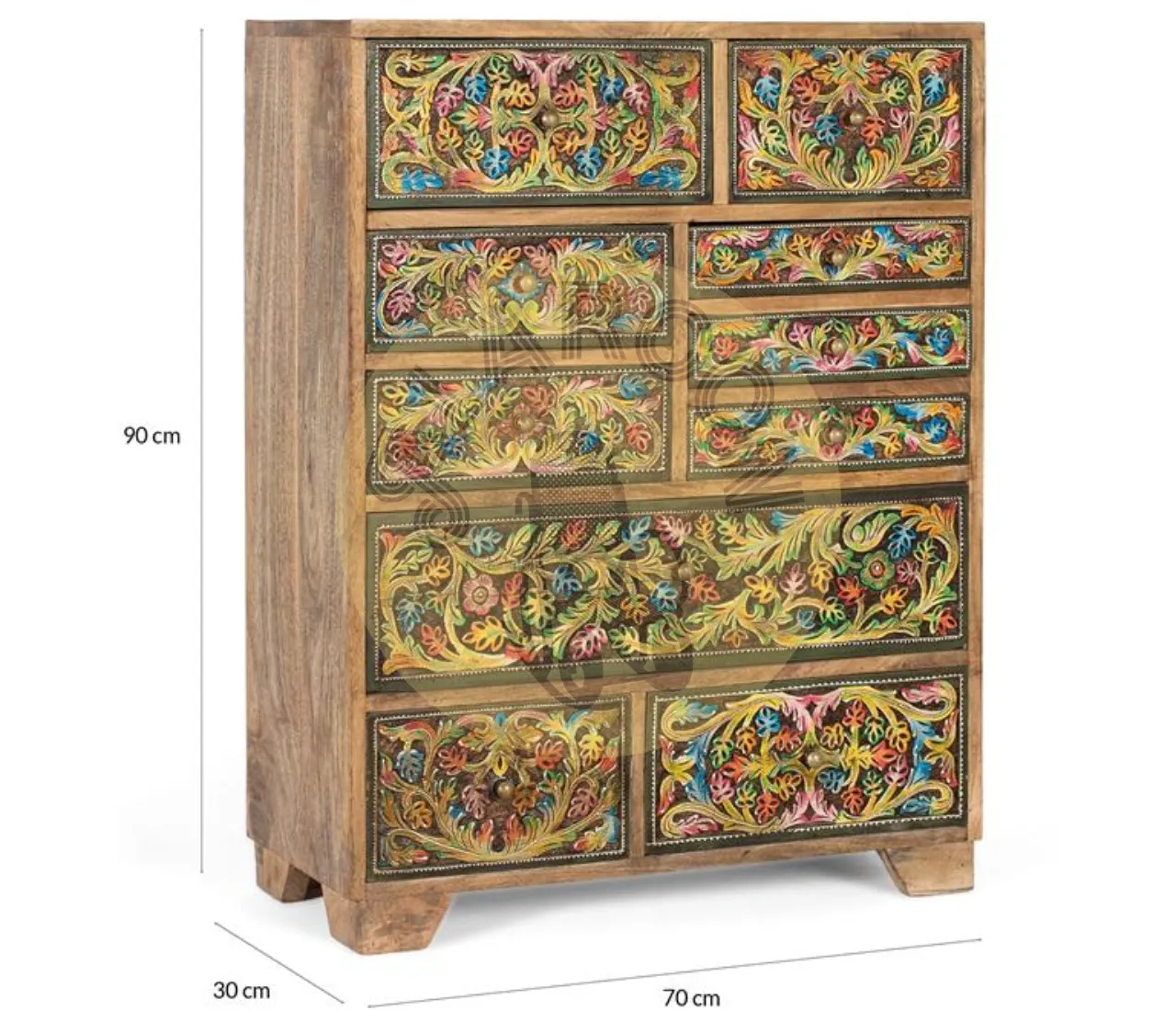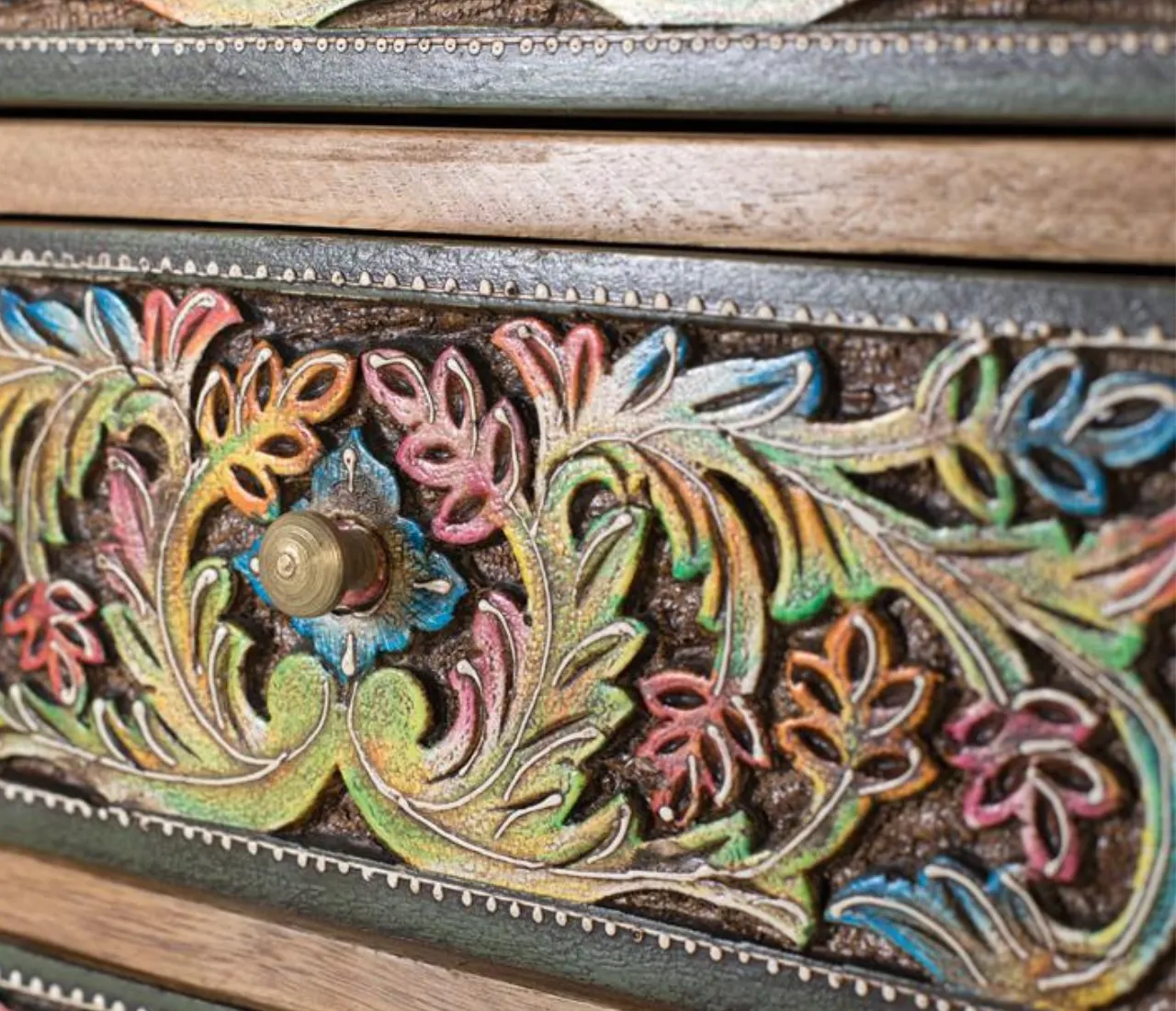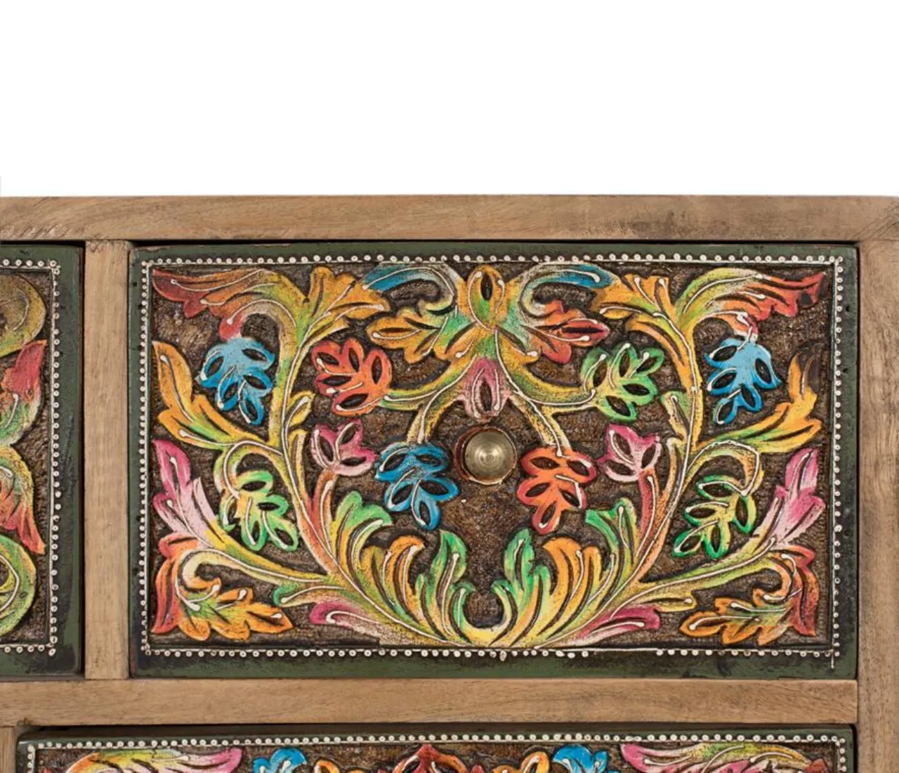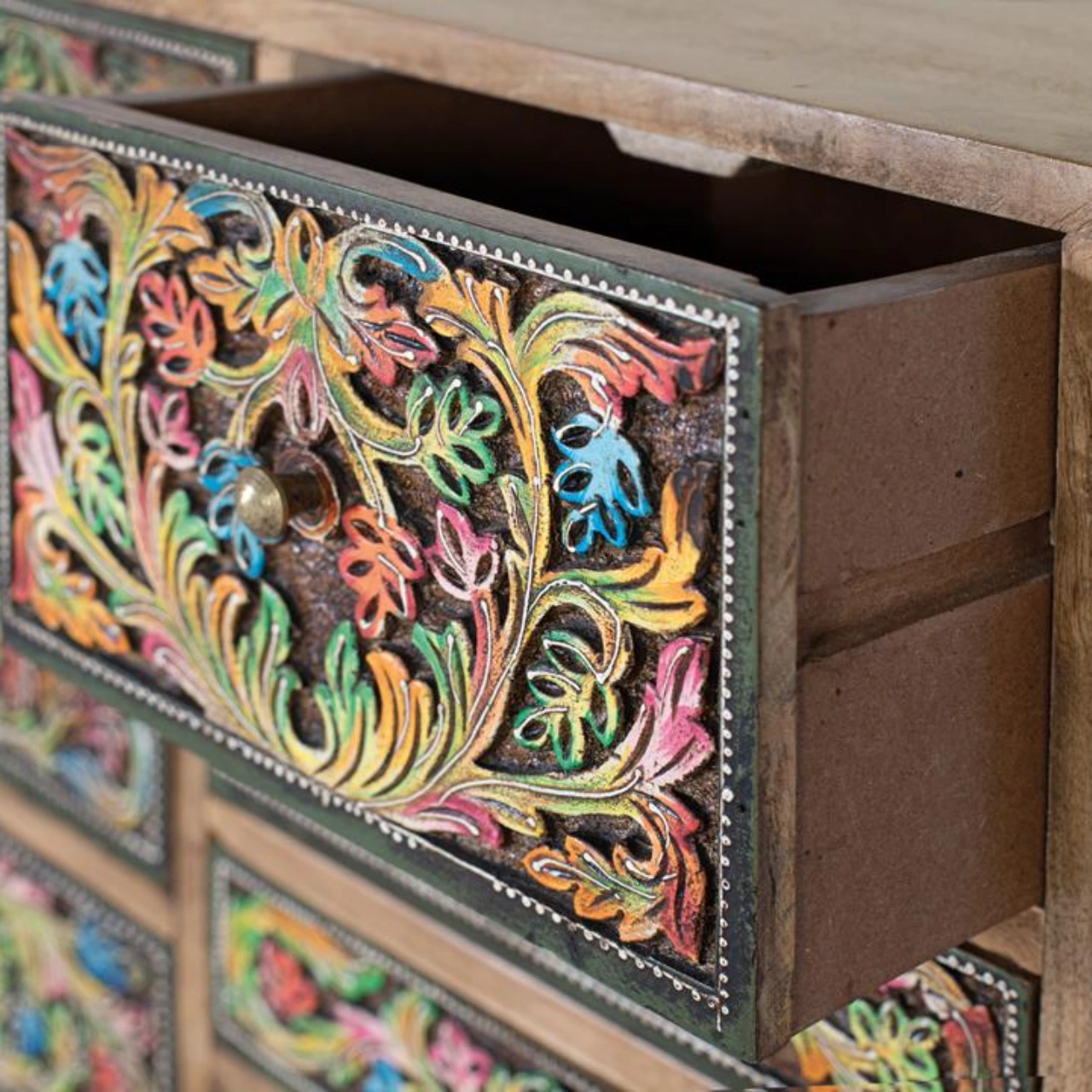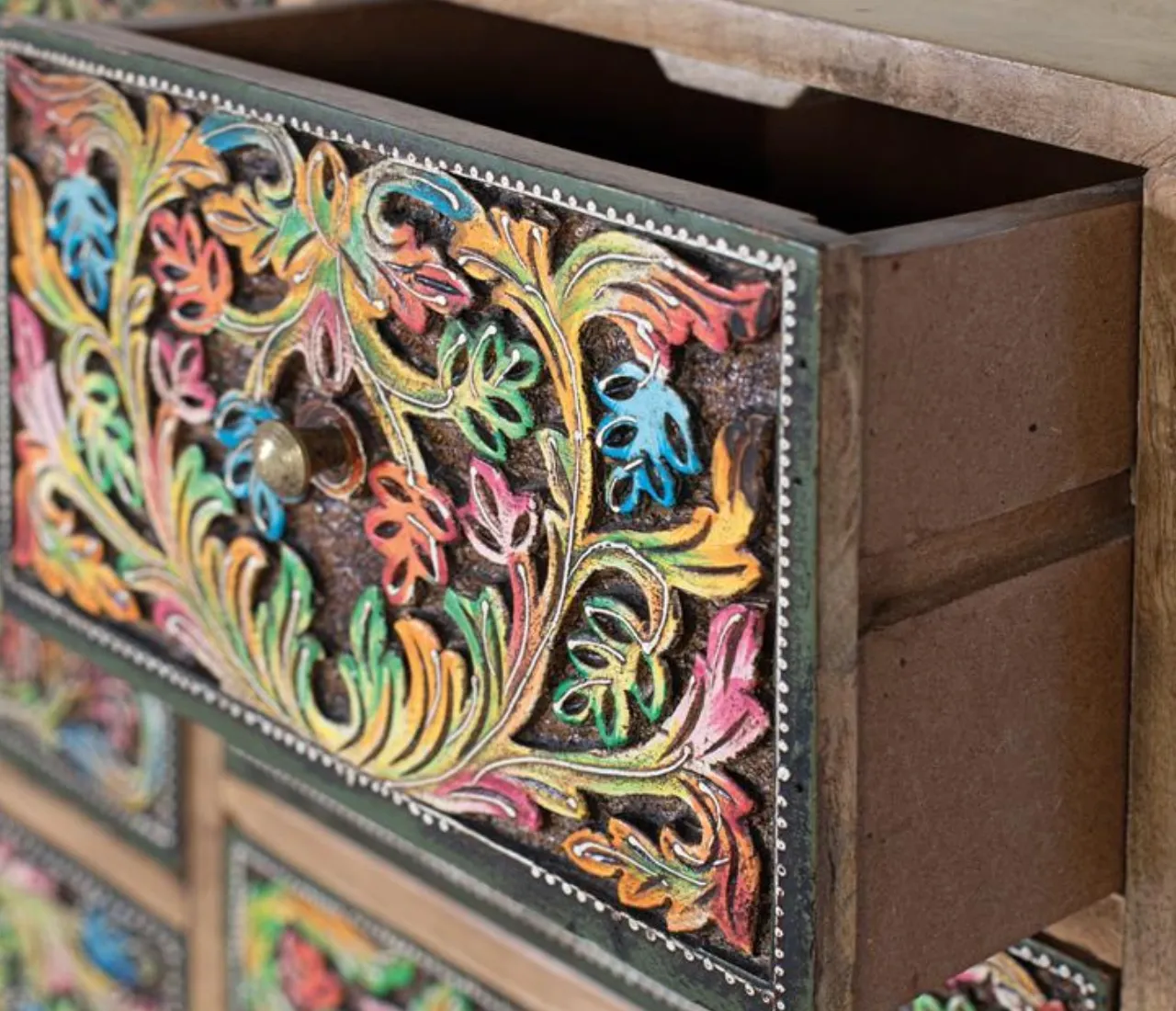 Diseño artesanal único: Frontales pintados a mano que convierten esta cómoda de madera de mango en una pieza decorativa exclusiva y muy valorada en interiores.