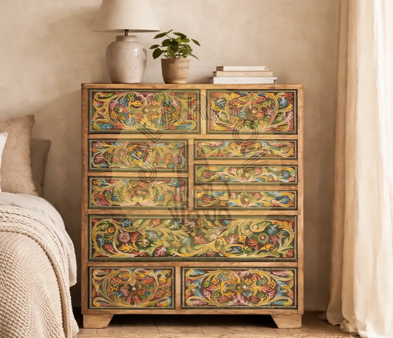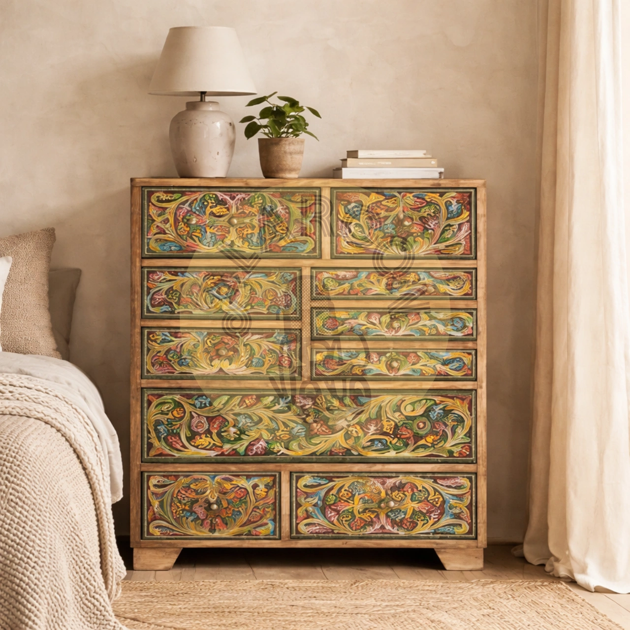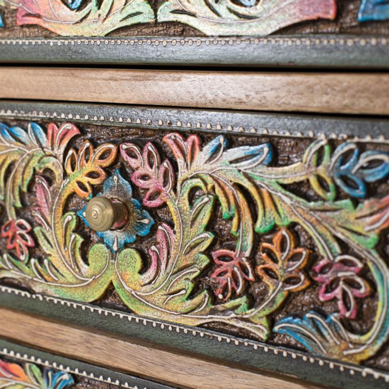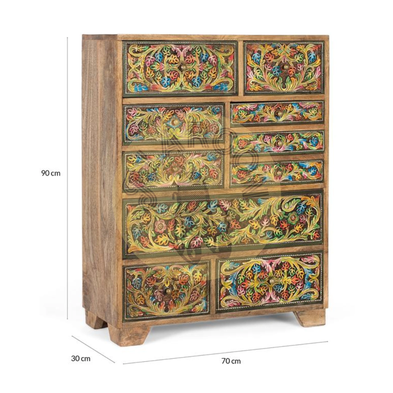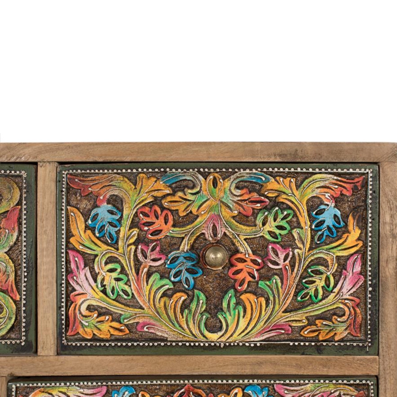 Diseño artesanal único: Frontales pintados a mano que convierten esta cómoda de madera de mango en una pieza decorativa exclusiva y muy valorada en interiores.