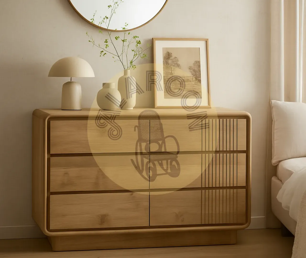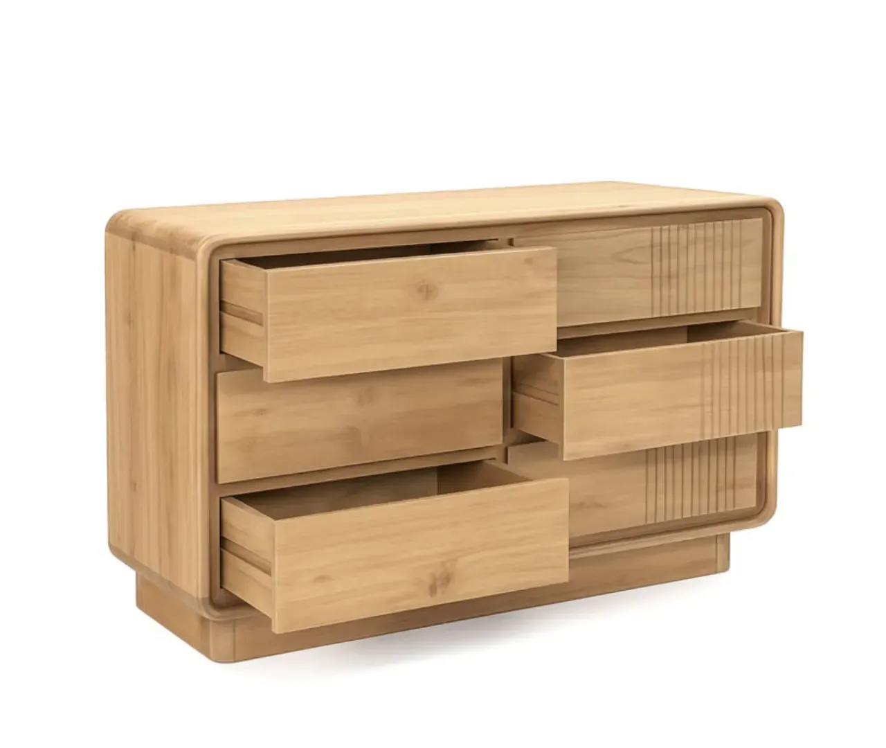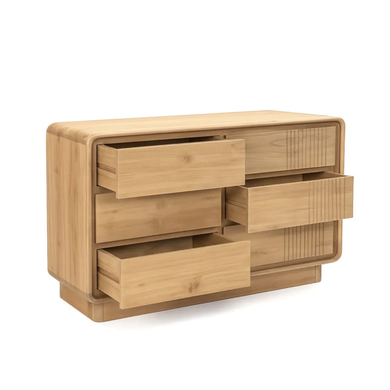 Con seis amplios cajones, esta cómoda proporciona un almacenamiento funcional y ordenado, manteniendo la elegancia en el dormitorio o salón. Su forma de líneas suaves y esquinas redondeadas añade un toque de modernidad al estilo clásico de la madera natural.