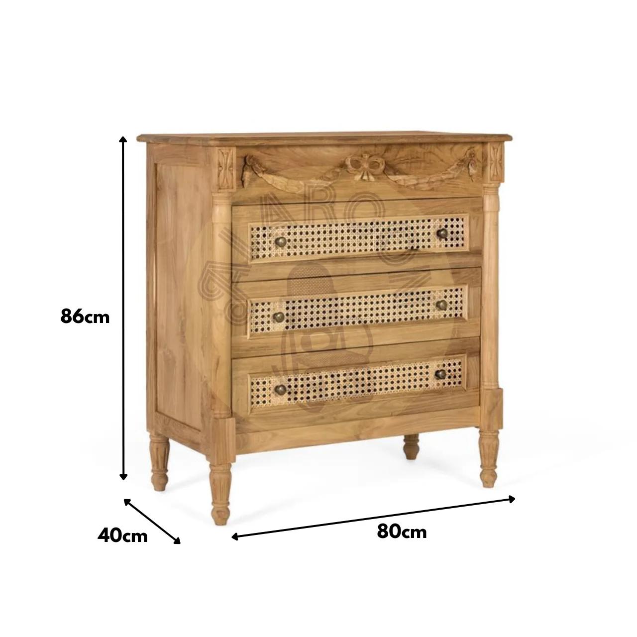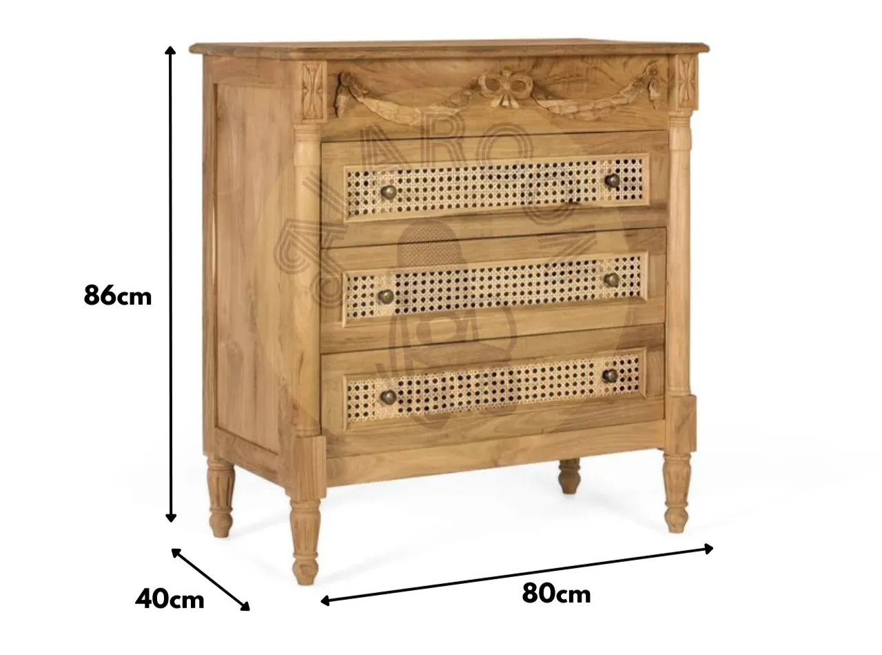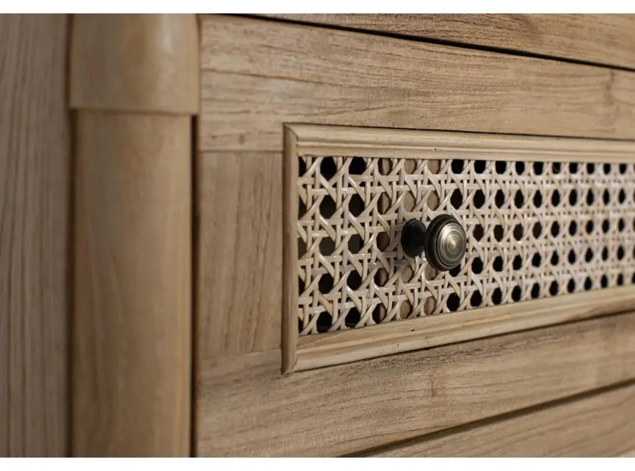 Con unas medidas de 80 cm de largo, 86 cm de alto y 40 cm de ancho, dispone de tres amplios cajones con frentes de rejilla de ratán trenzado, que aportan textura, ligereza visual y un toque decorativo distintivo.