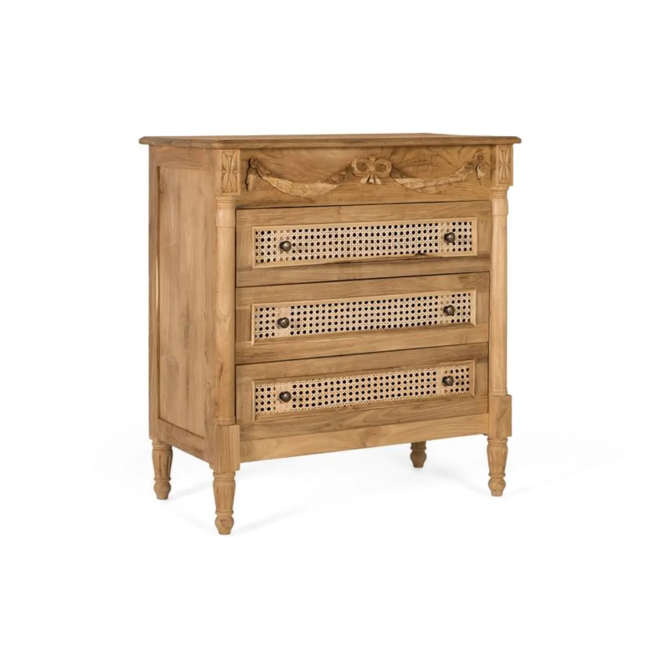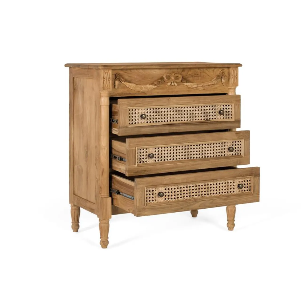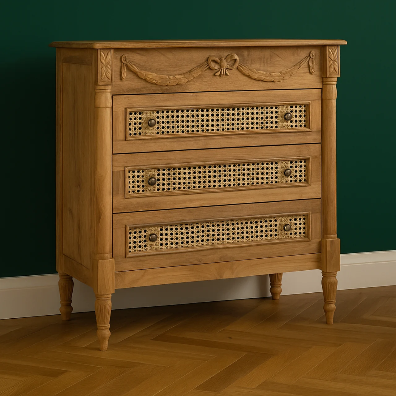 Con unas medidas de 80 cm de largo, 86 cm de alto y 40 cm de ancho, dispone de tres amplios cajones con frentes de rejilla de ratán trenzado, que aportan textura, ligereza visual y un toque decorativo distintivo.