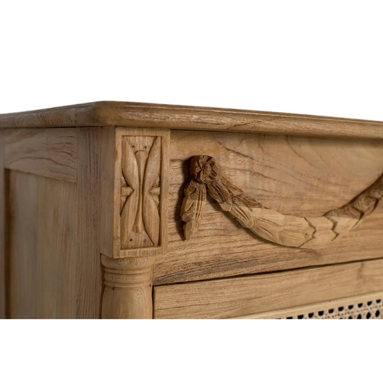 La cómoda de madera maciza de teca destaca por su acabado natural, que realza las vetas únicas y aporta calidez a cualquier espacio. Su diseño combina artesanía tradicional y elegancia atemporal, ideal para interiores provenzales, coloniales o de estilo natural.