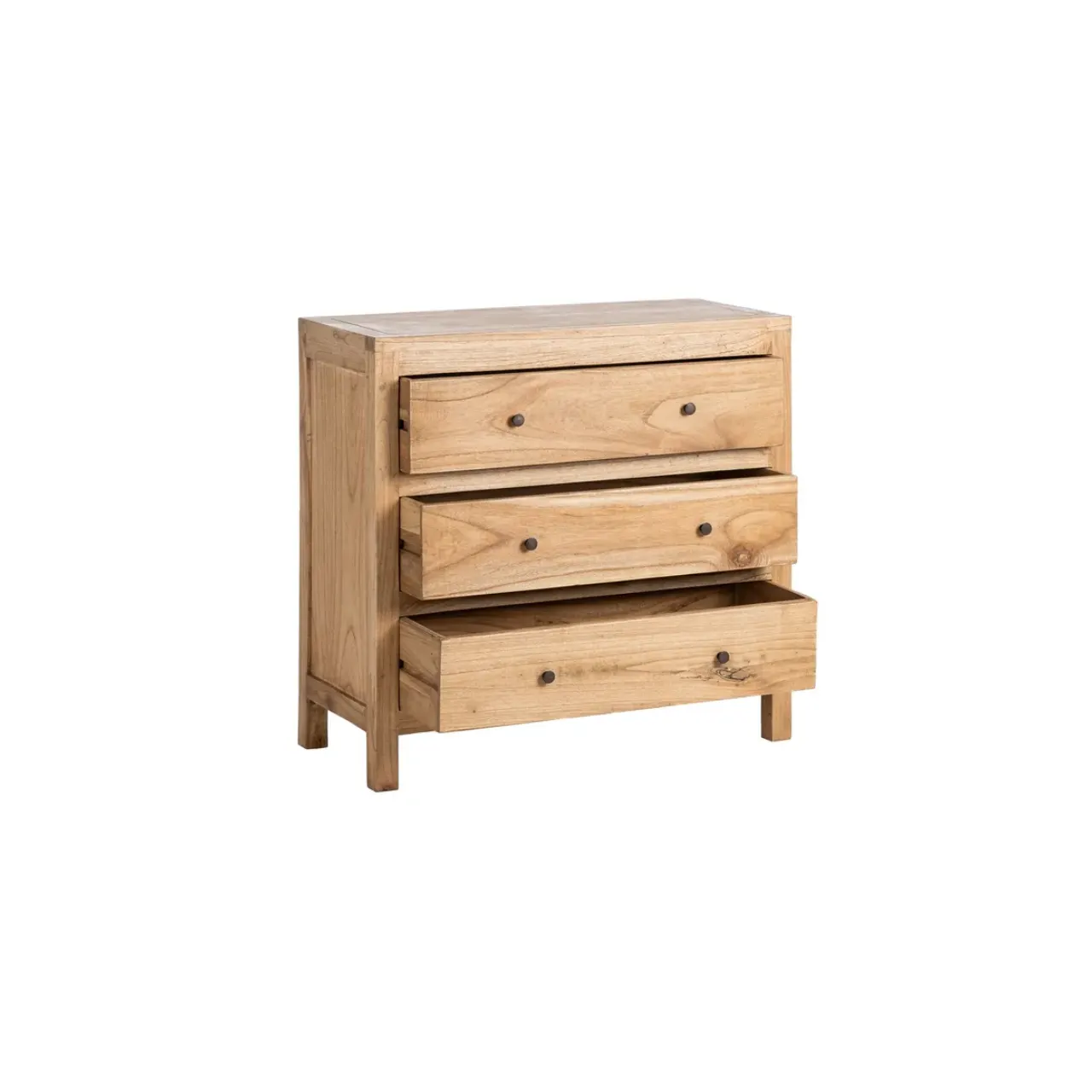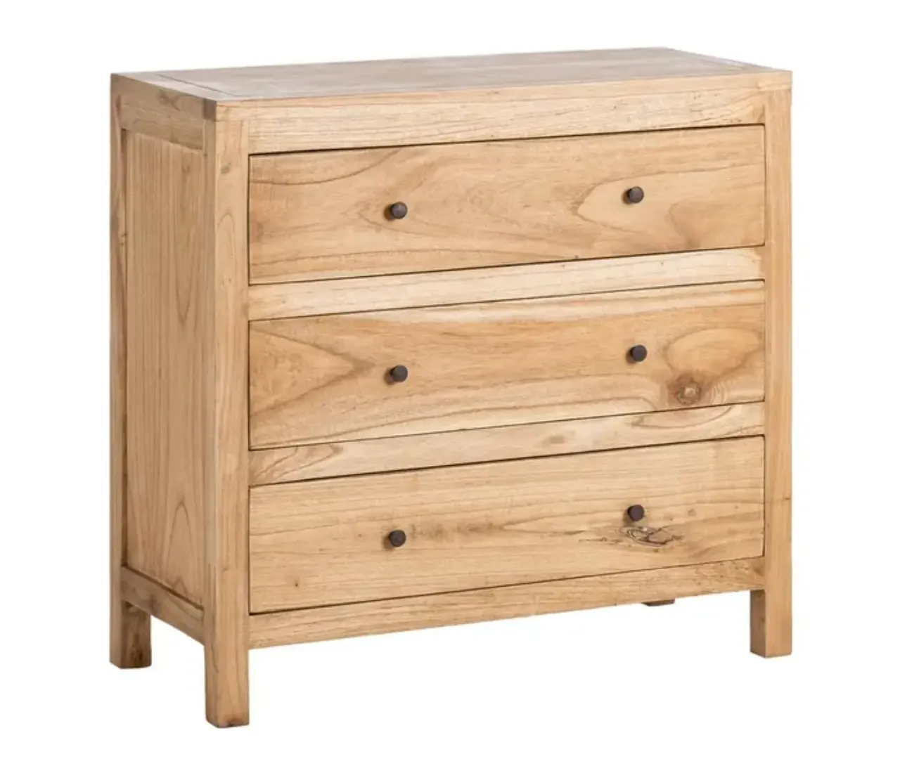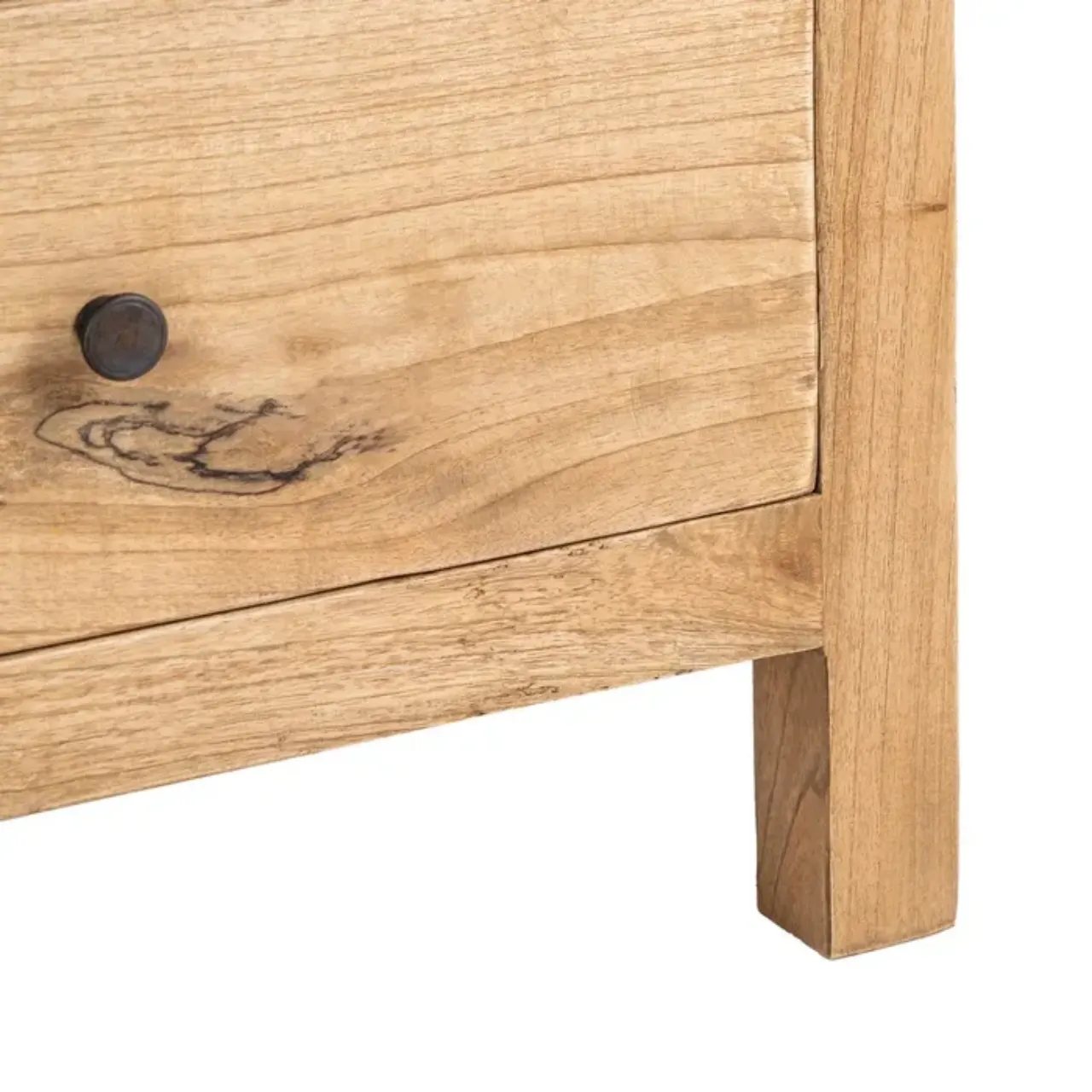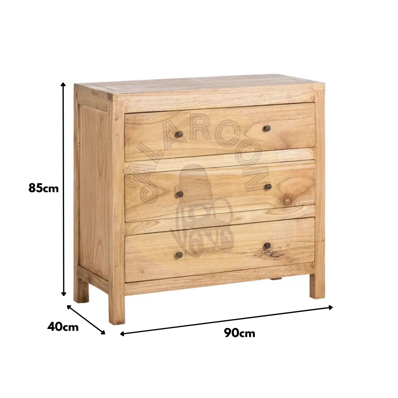 La cómoda de madera maciza de mindi destaca por su acabado natural, que realza las vetas y aporta un estilo cálido y atemporal al dormitorio.
