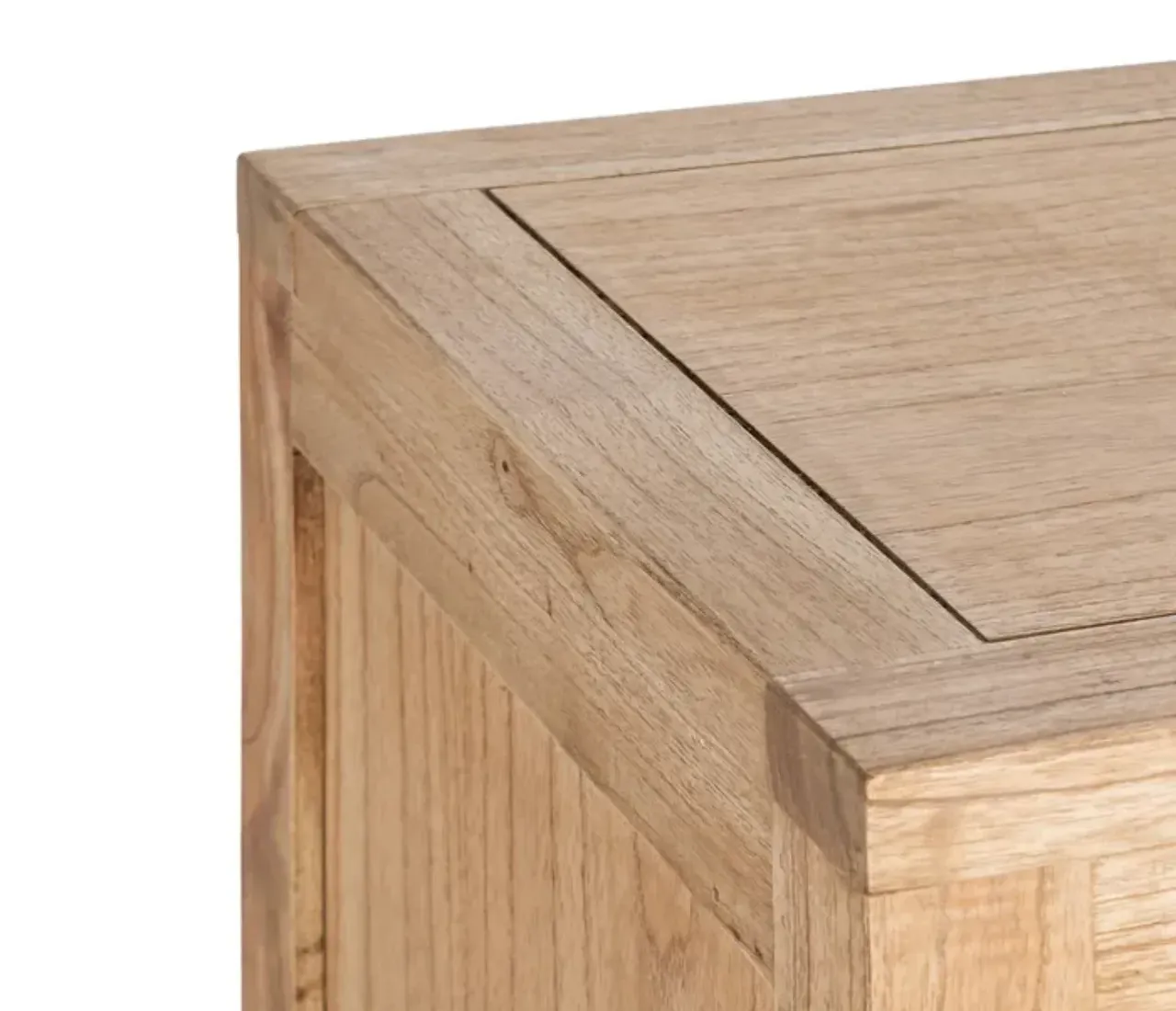 Madera maciza de mindi, resistente y duradera, con acabado natural que realza las vetas.