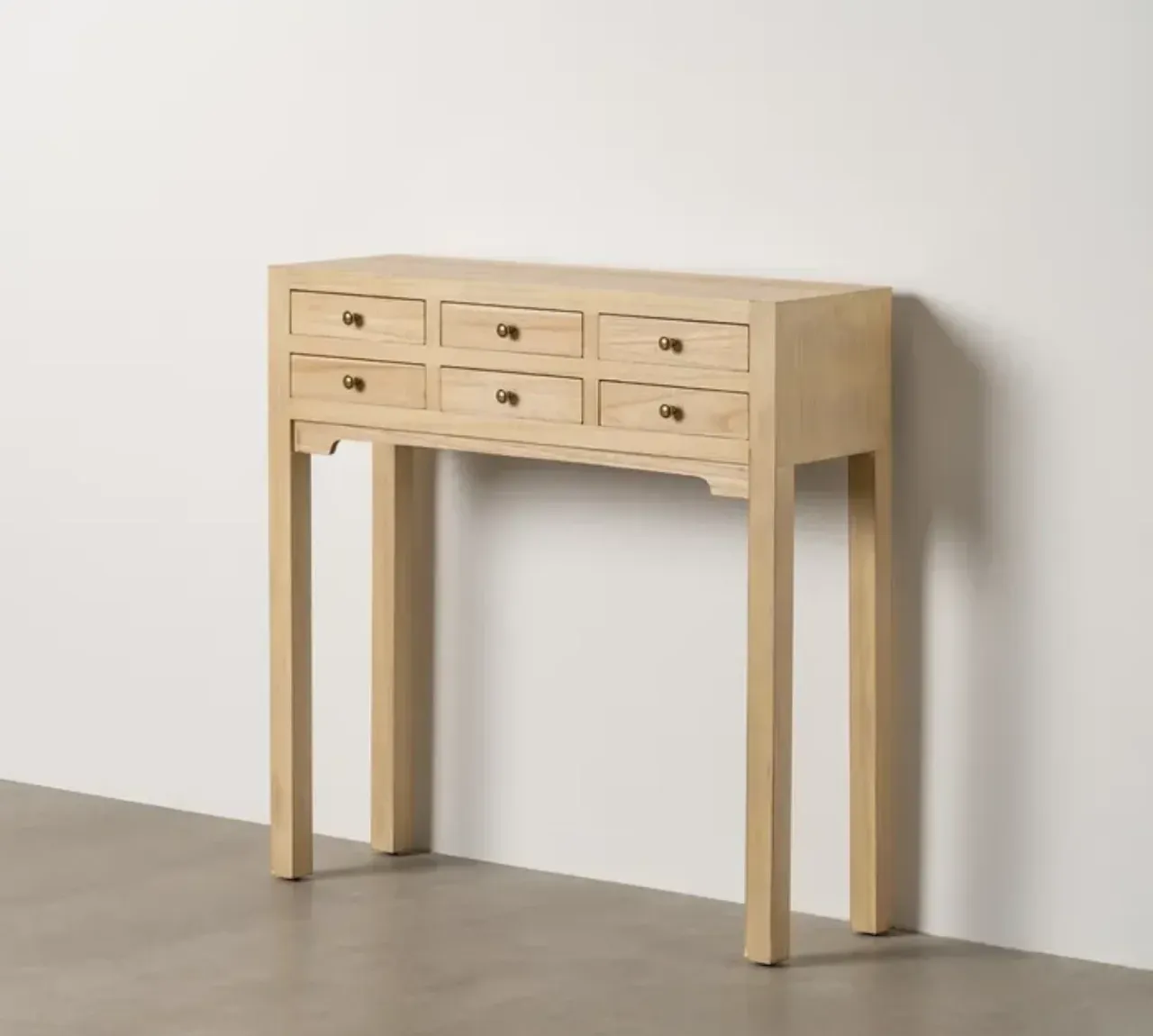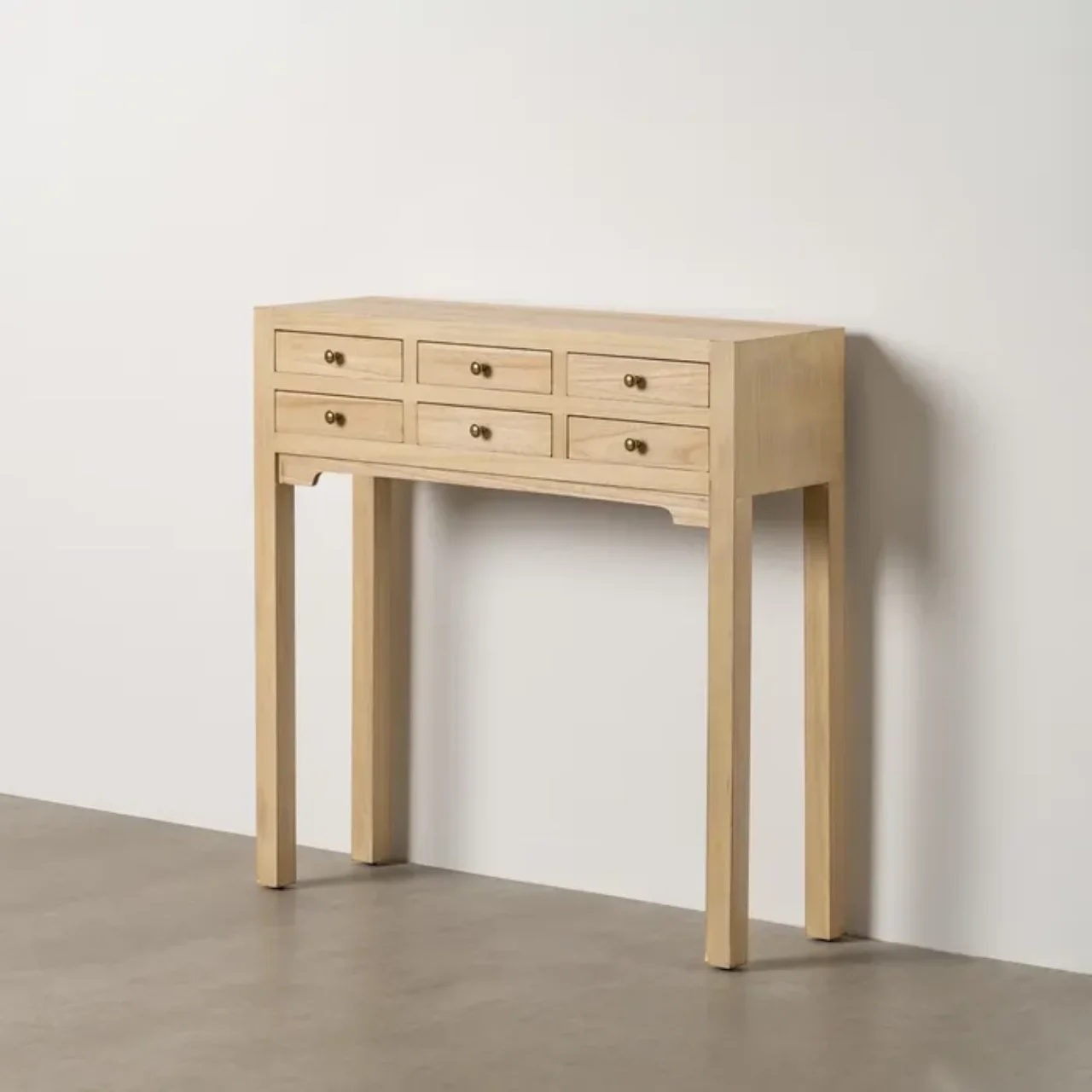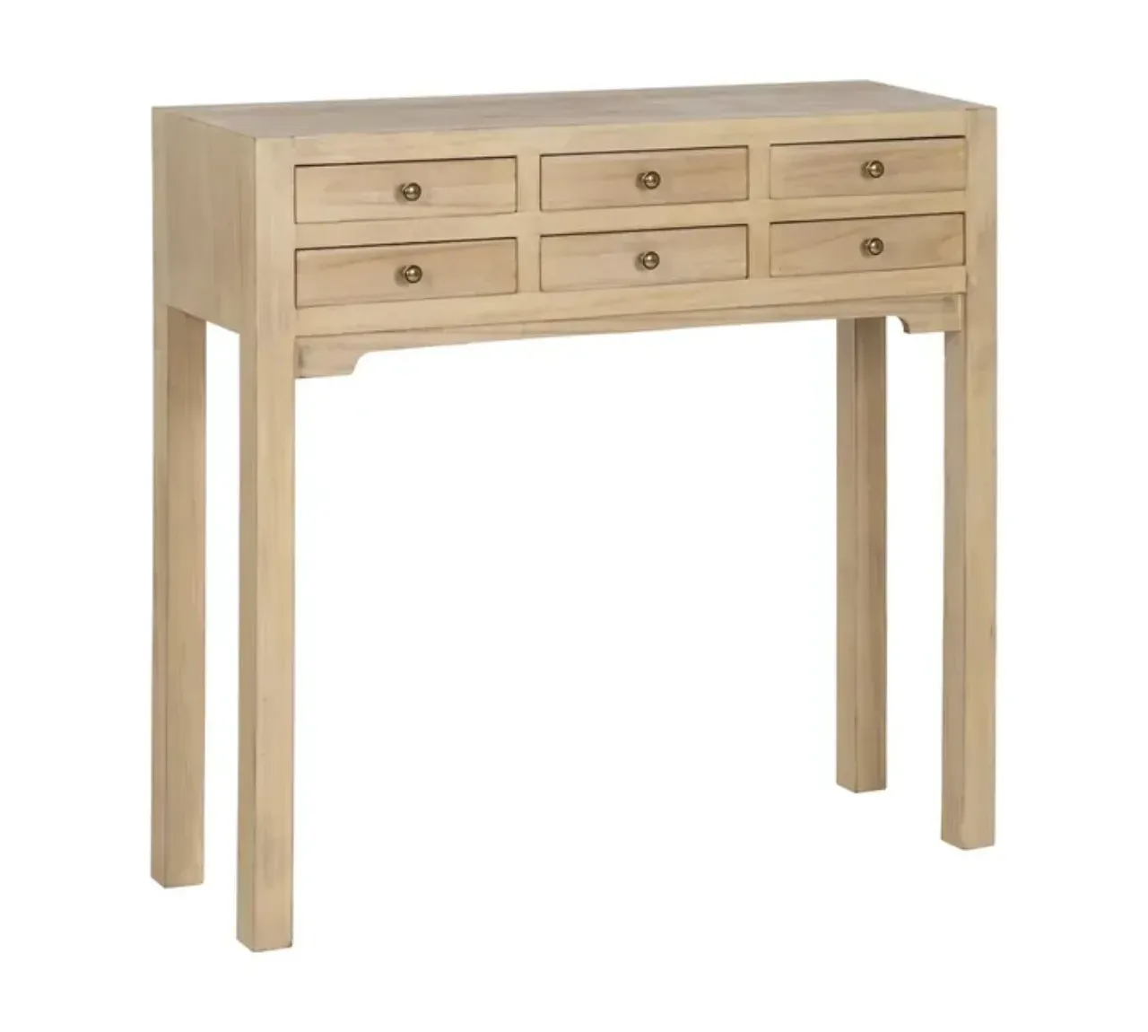 La consola en madera natural combina una estructura de DM con un revestimiento de paulonia, creando un diseño ligero y funcional que aporta calidez y estilo a cualquier estancia.