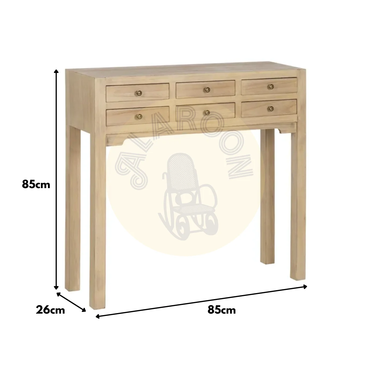 Dispone de cajones de 26 x 24 x 6 cm, ideales para organizar pequeños objetos. Sus patas de 60 cm elevan la estructura, aportando ligereza visual y un acabado elegante.