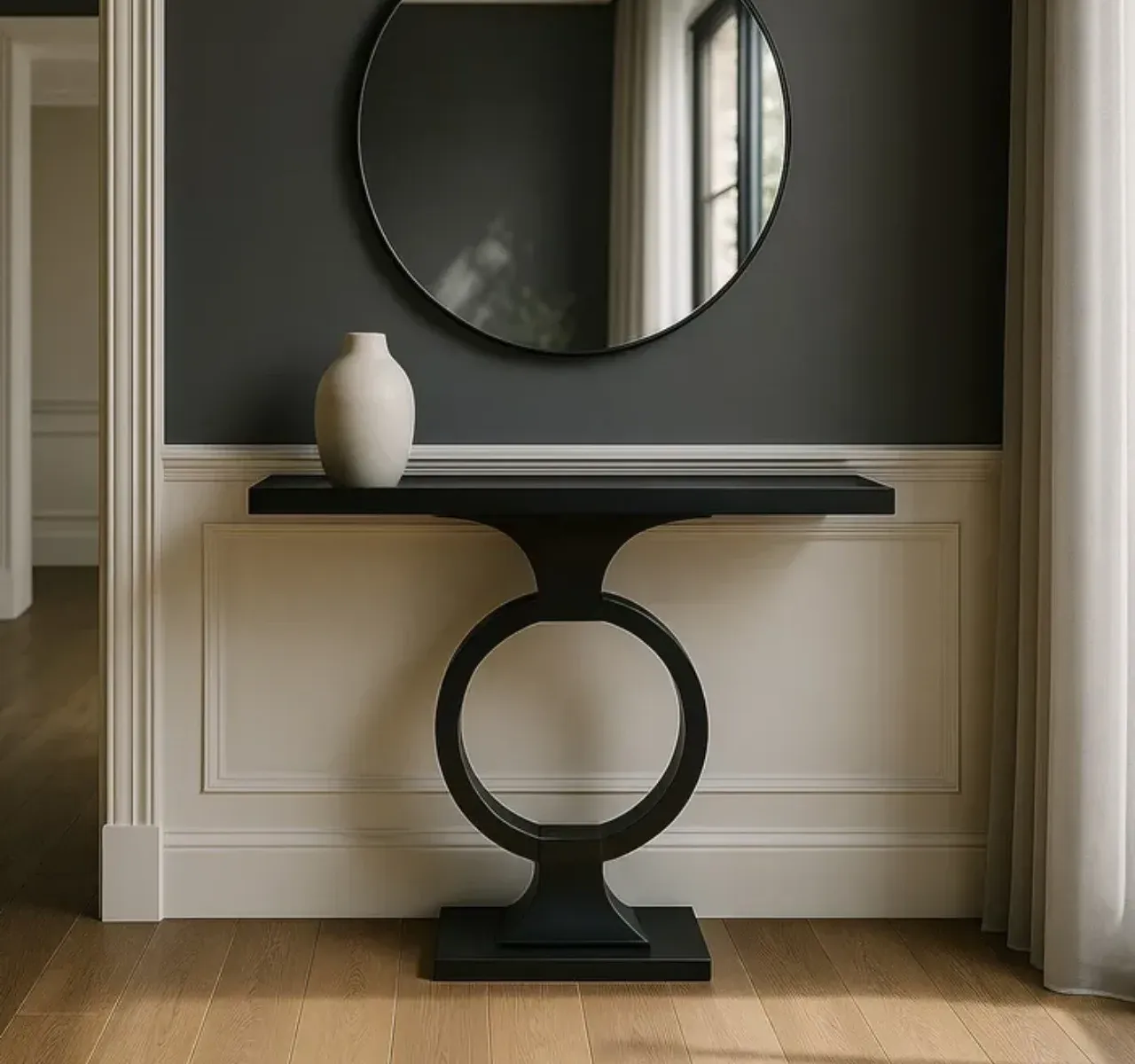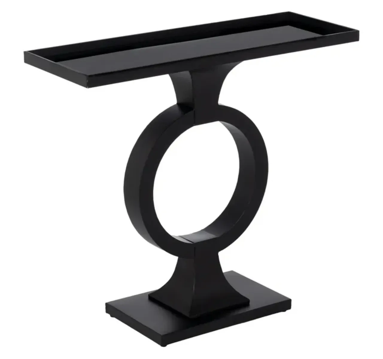 Su estructura en hierro negro aporta solidez, mientras que el sobre de cristal añade elegancia y luminosidad. El hueco inferior de 20 cm facilita su integración práctica.