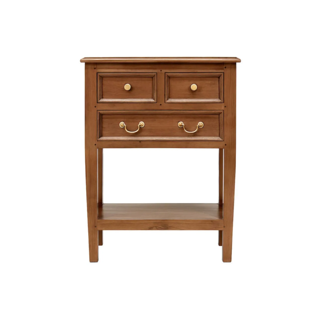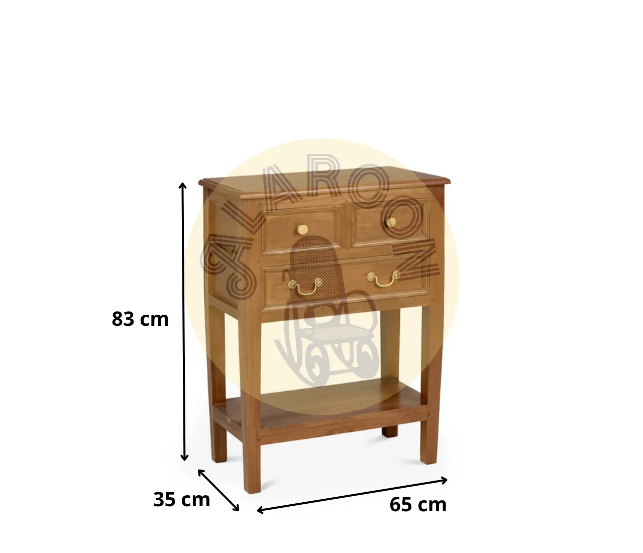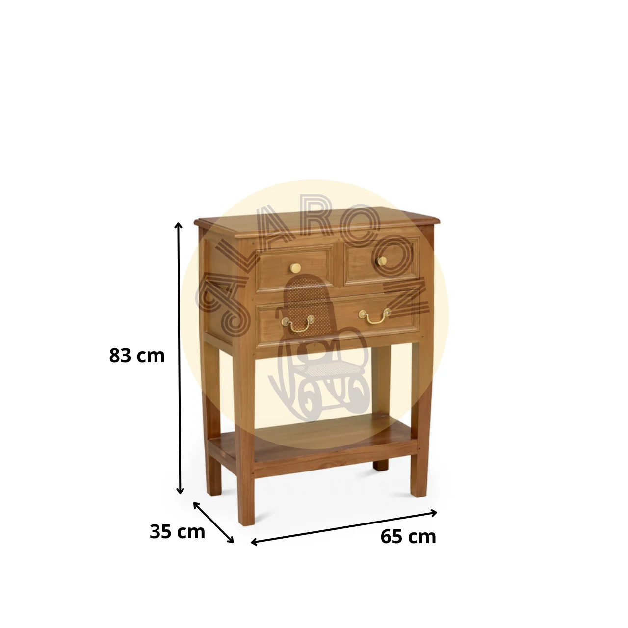 Su estructura de 65 x 35 x 83 cm incluye dos cajones superiores y un cajón inferior más amplio, perfectos para mantener el orden con estilo. Los tiradores metálicos dorados aportan un toque clásico que combina fácilmente con ambientes contemporáneos o tradicionales.