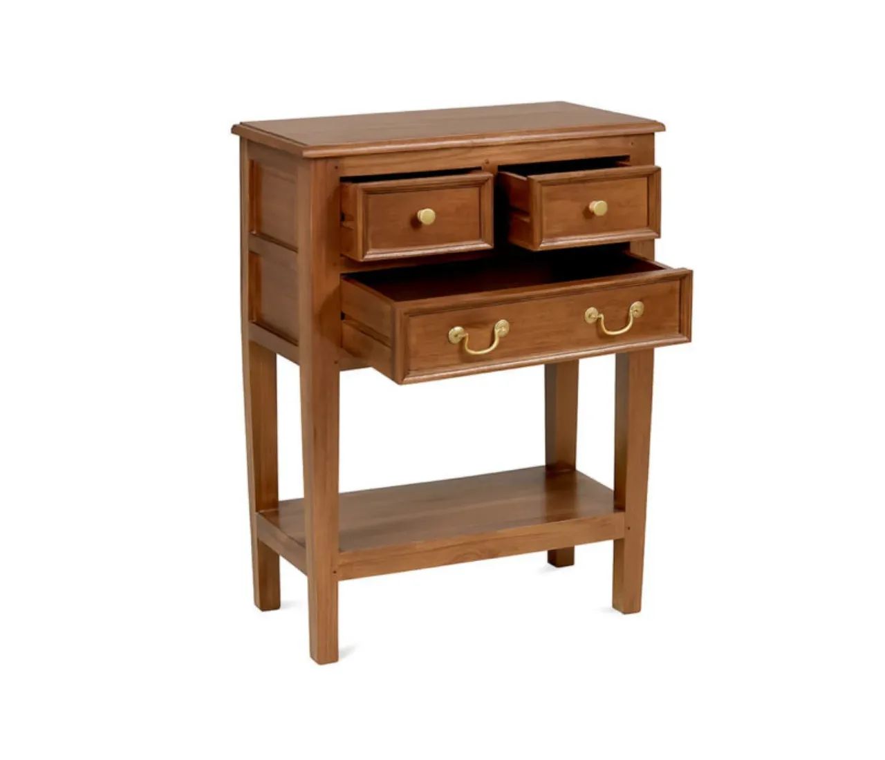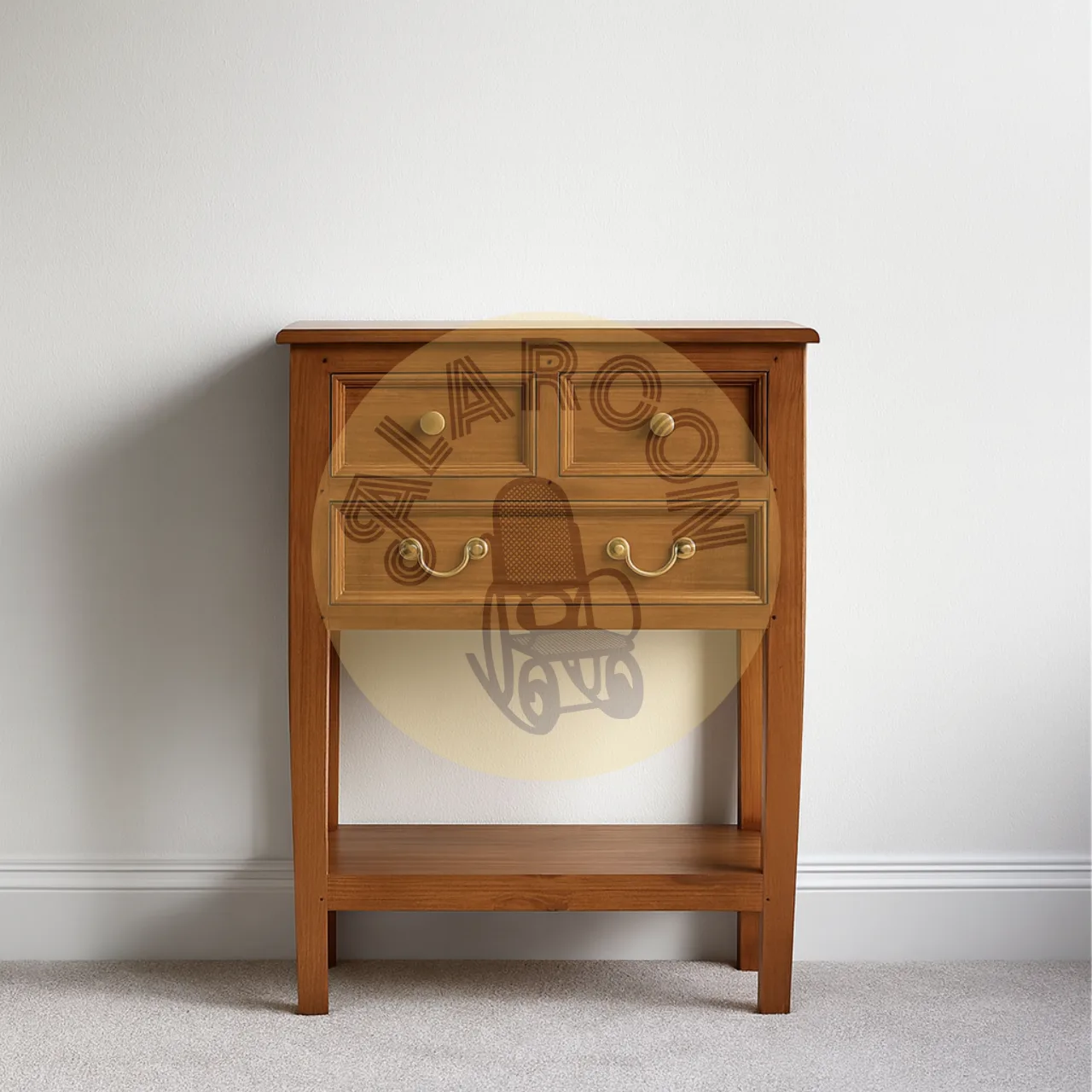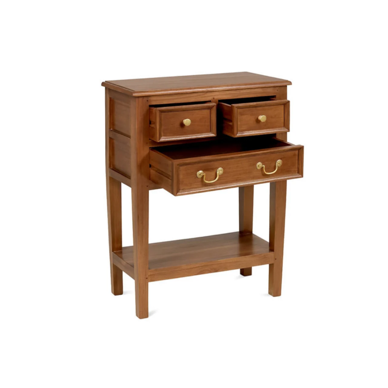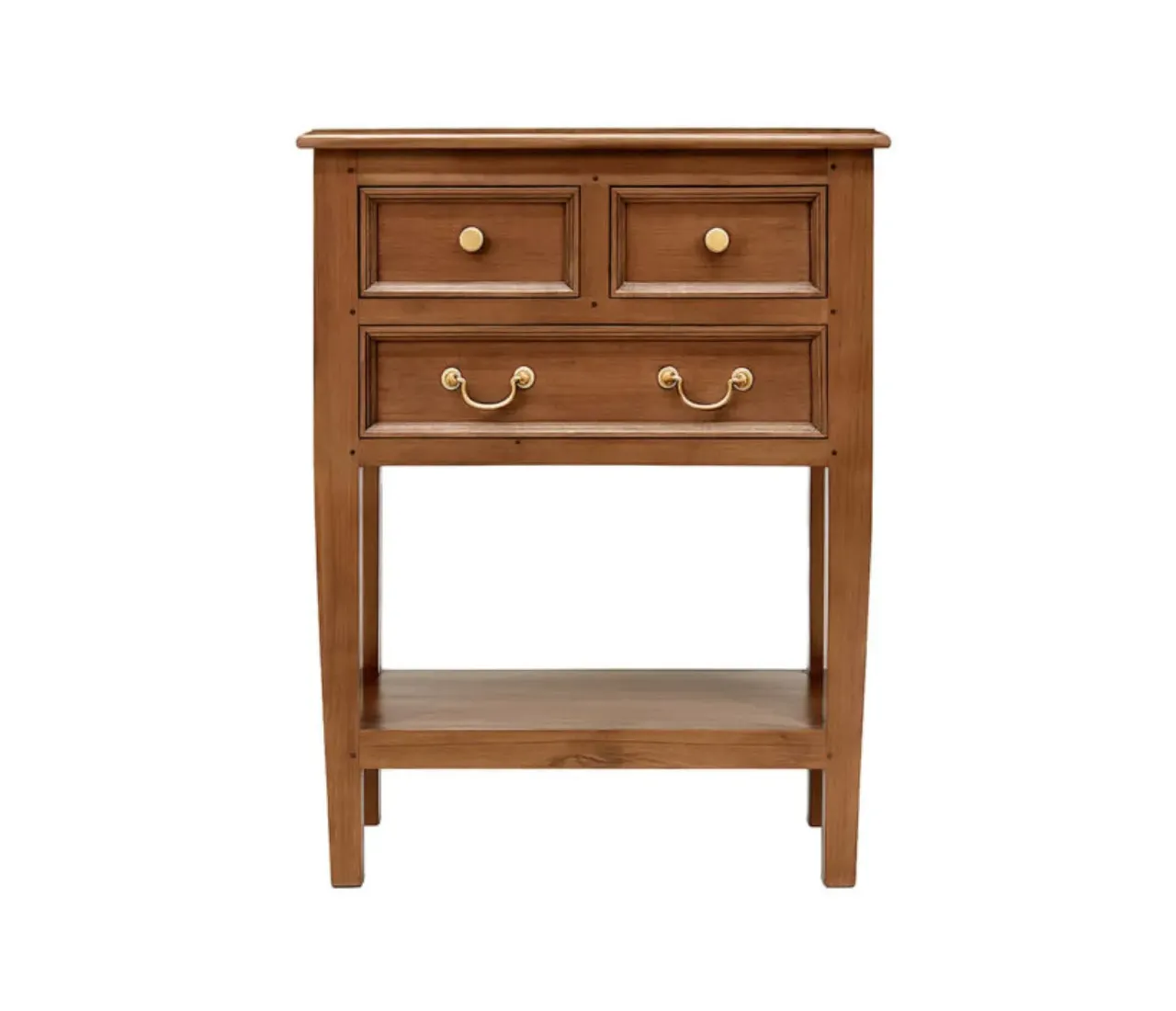 Su estructura de 65 x 35 x 83 cm incluye dos cajones superiores y un cajón inferior más amplio, perfectos para mantener el orden con estilo. Los tiradores metálicos dorados aportan un toque clásico que combina fácilmente con ambientes contemporáneos o tradicionales.