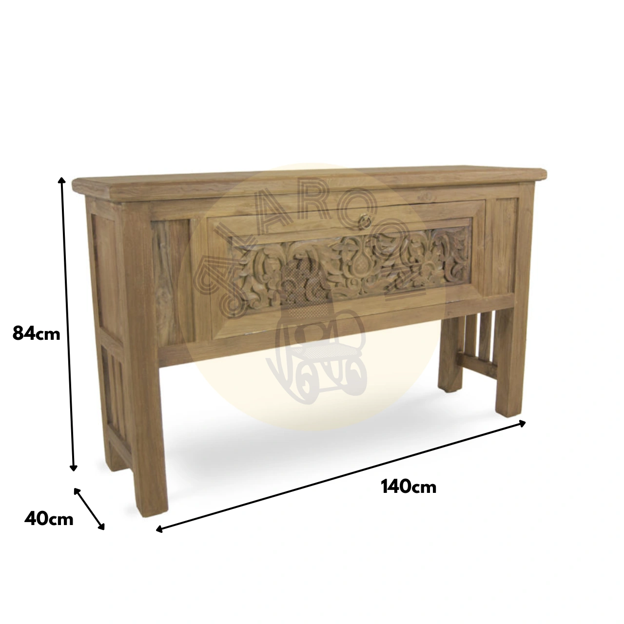 Con unas medidas de 140 cm de largo, 40 cm de ancho y 84 cm de alto, ofrece una estructura robusta y una presencia elegante que se adapta a interiores naturales o contemporáneos.