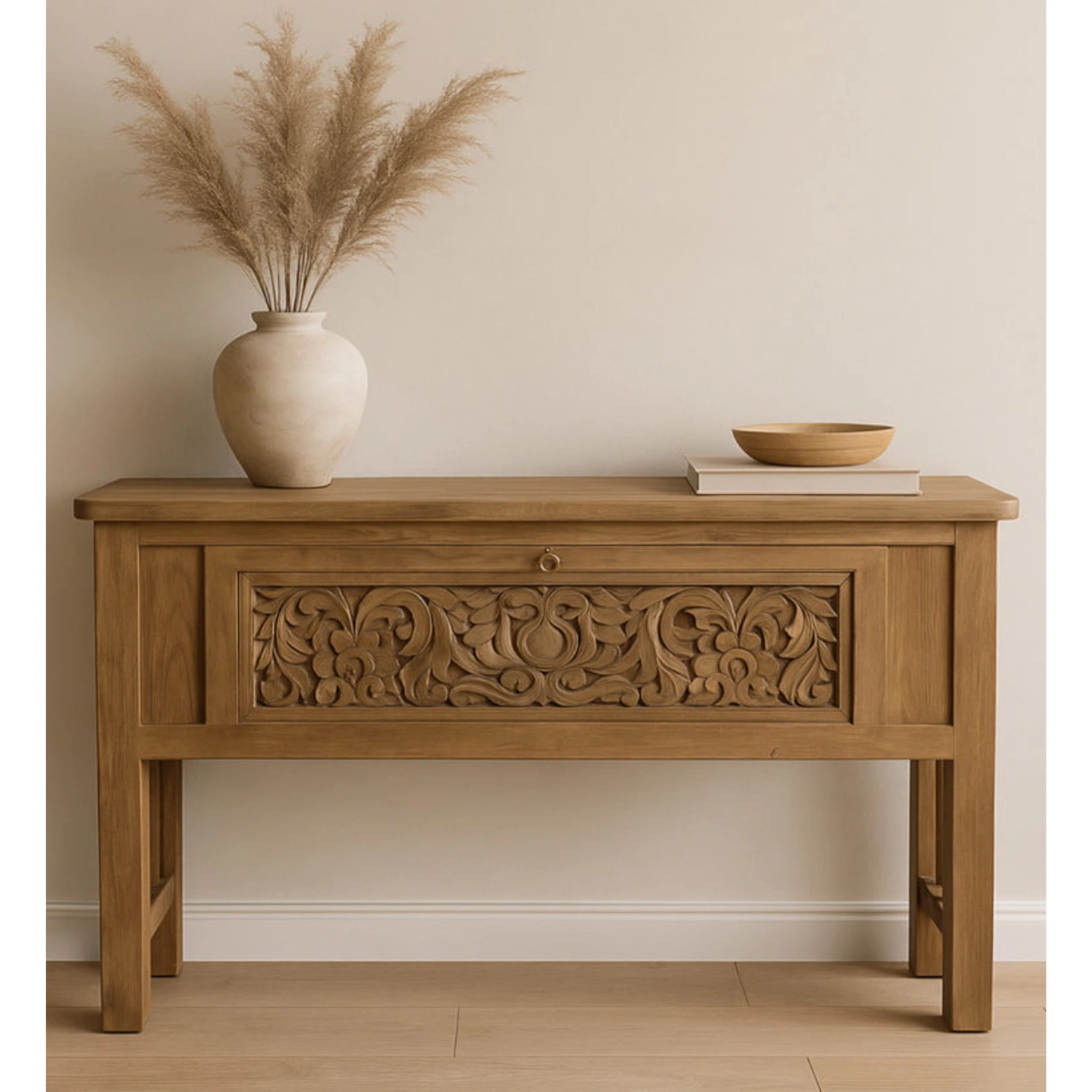 Su diseño artesanal y el uso de madera recuperada aportan personalidad, durabilidad y un toque orgánico que convierte esta consola en un elemento decorativo y funcional para cualquier estancia.