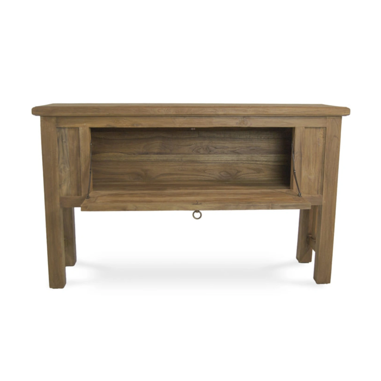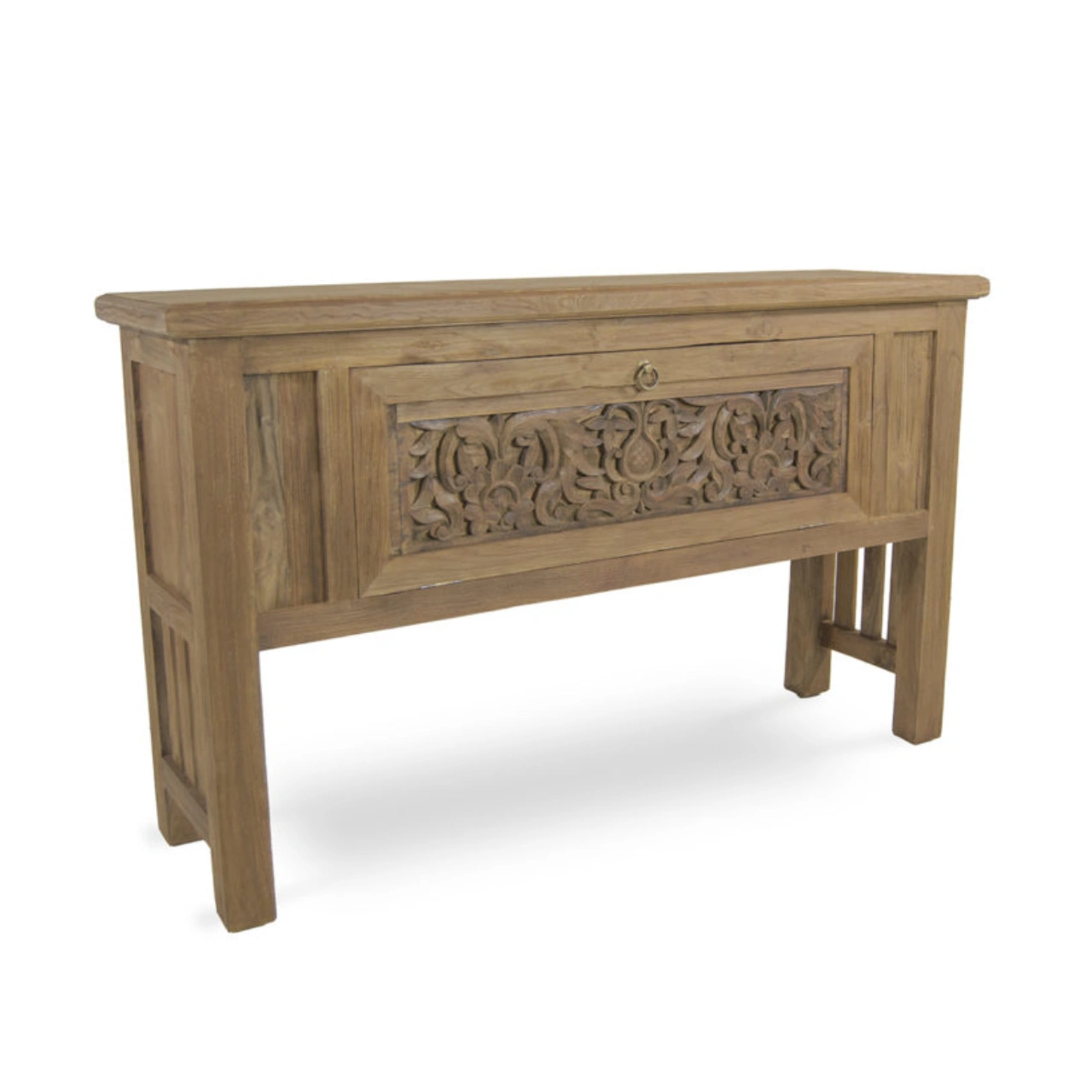 La consola Fez está elaborada en madera maciza de teca reciclada, destacando por su carácter artesanal y su acabado natural que realza la belleza de las vetas y el encanto rústico del material. Cada pieza es única, con ligeras variaciones que refuerzan su autenticidad y origen sostenible.