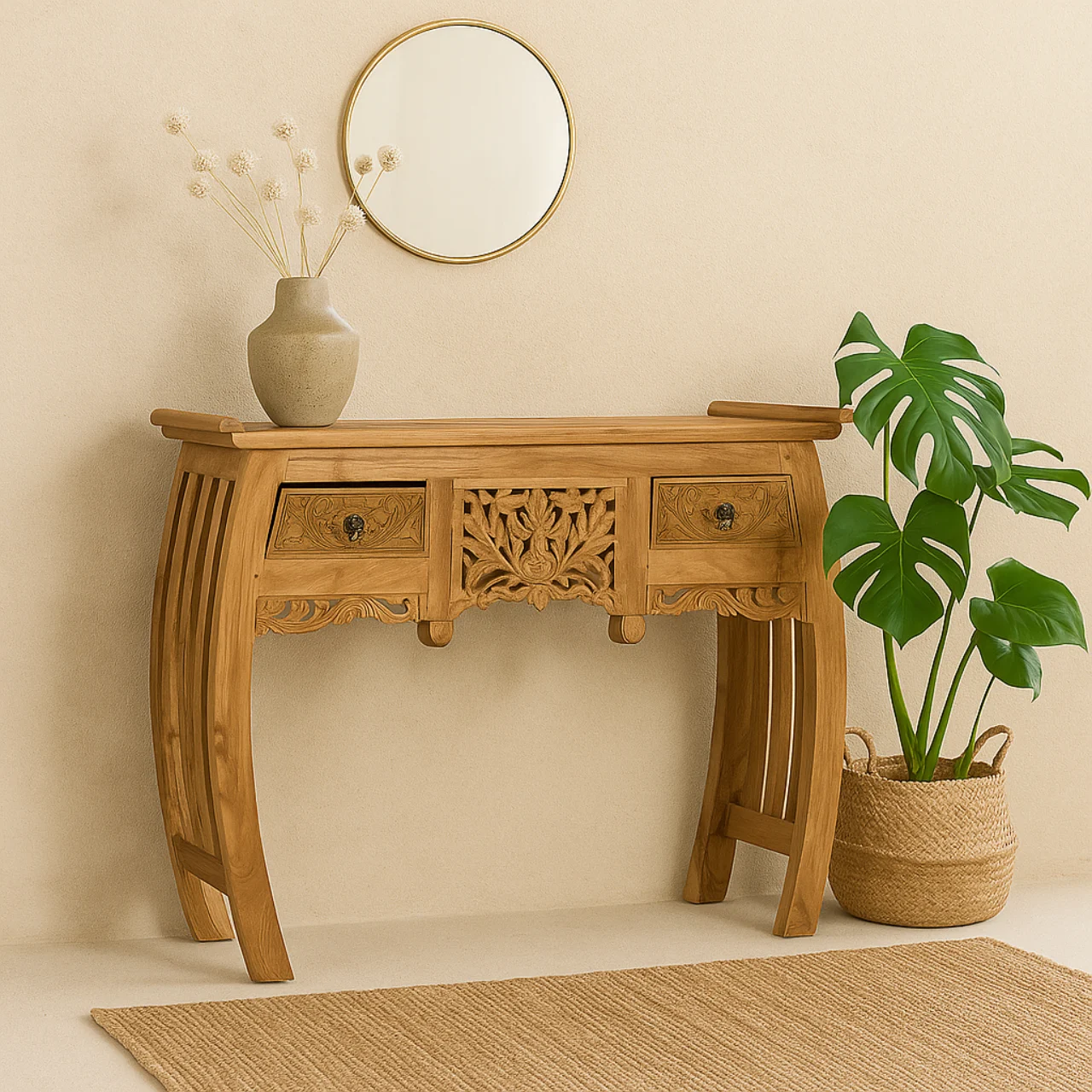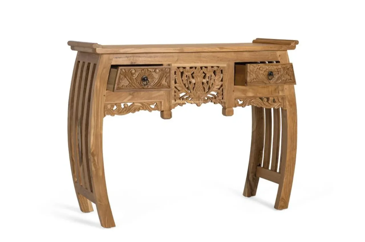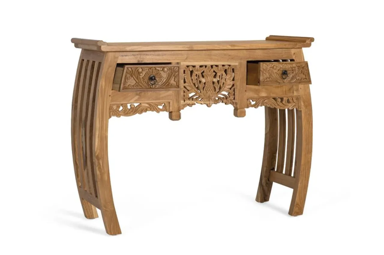 La consola de teca maciza destaca por su acabado artesanal y su tono natural, que resalta la textura y las vetas únicas de la madera. Su diseño combina elegancia y autenticidad, aportando calidez a espacios de estilo balinés o colonial.